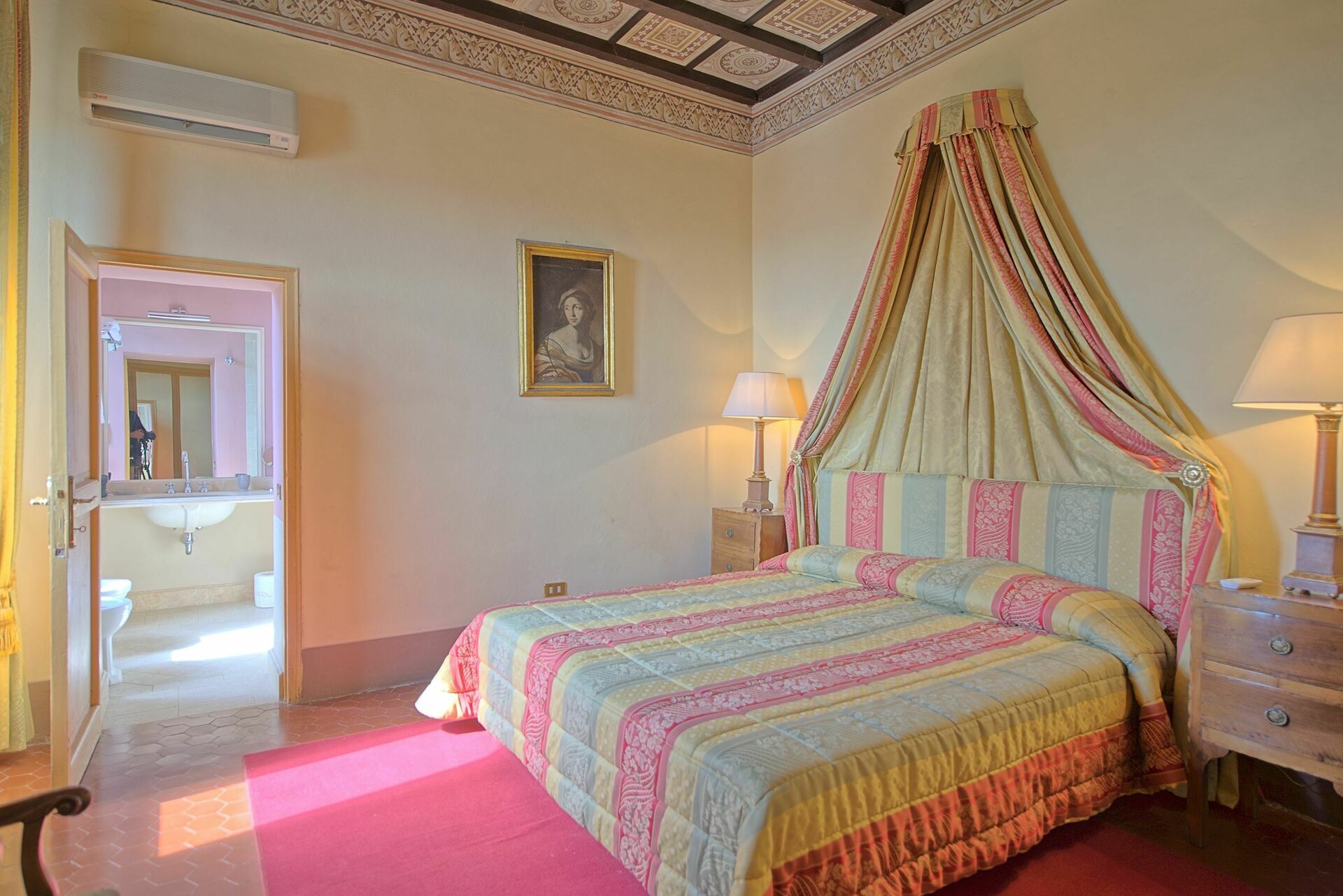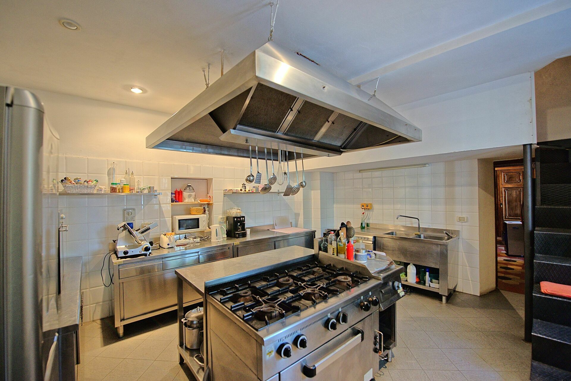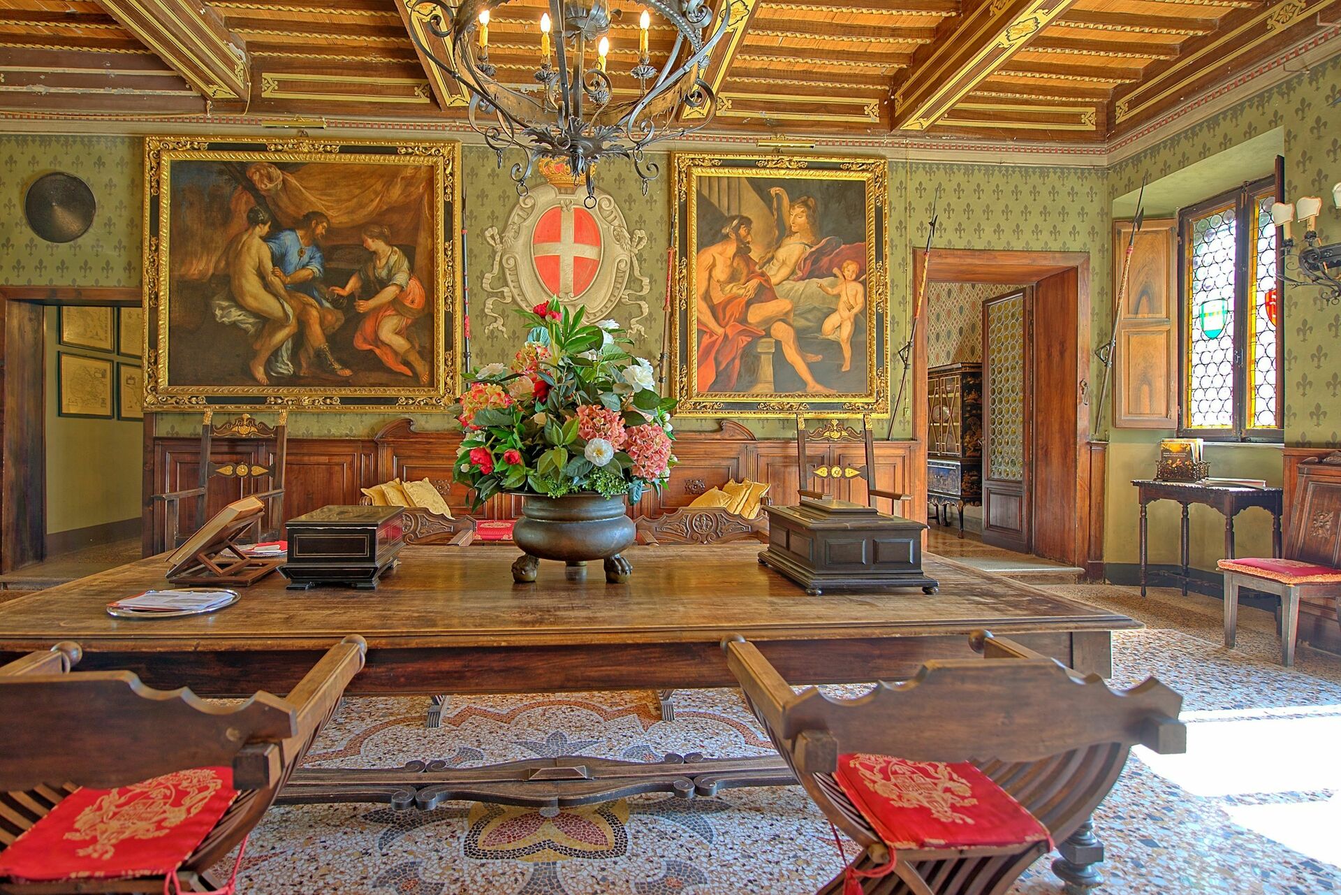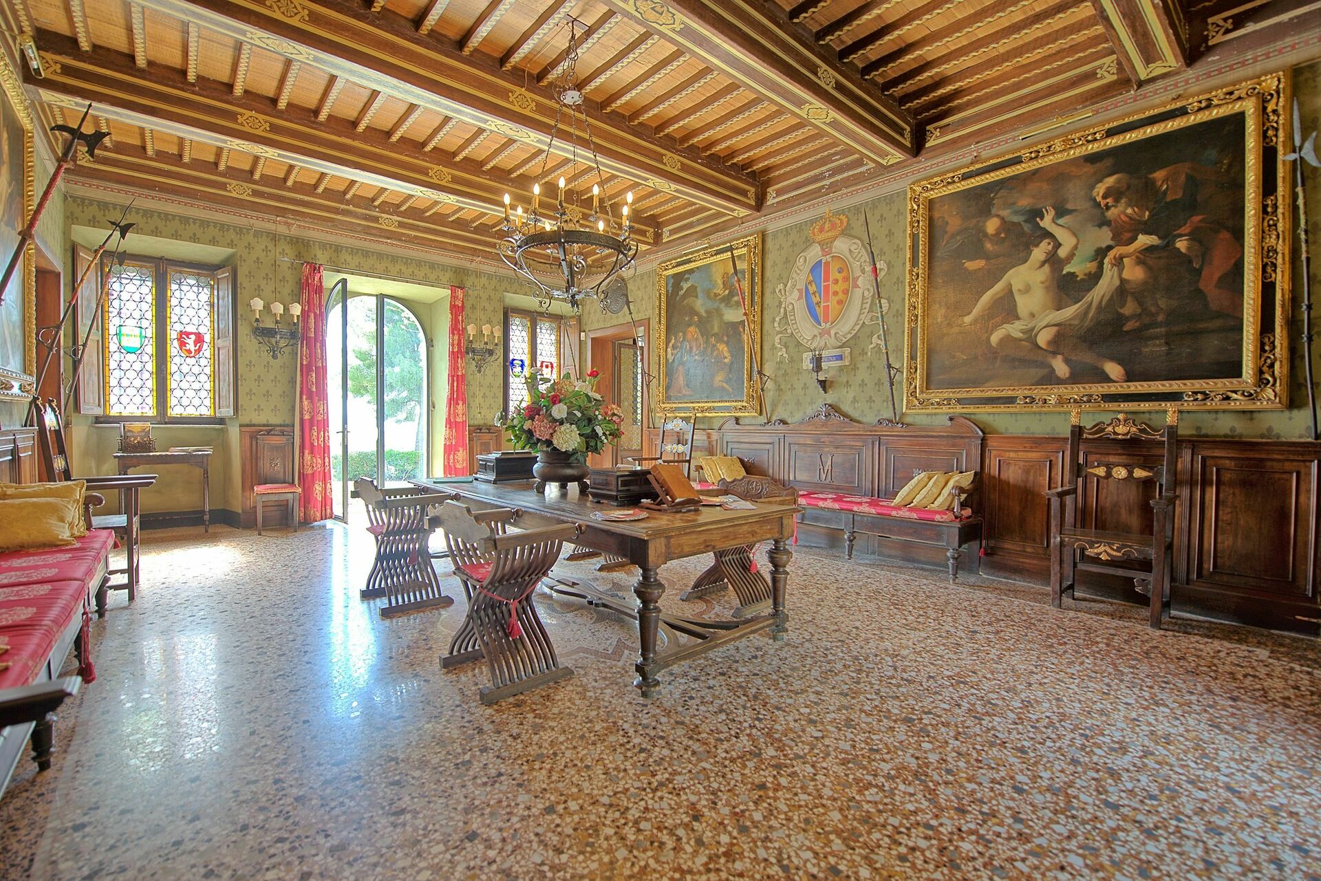 Første etasje: stor hall med fresker, stue med lite bibliotek og internettpunkt, vakker stue med freskomalerier med peis og bar, stue (sat. TV, videospiller/CD/DVD-spiller) , romslig og lys spisestue med meget vakre majolica fresker og peis, velassortert profesjonelt kjøkken.