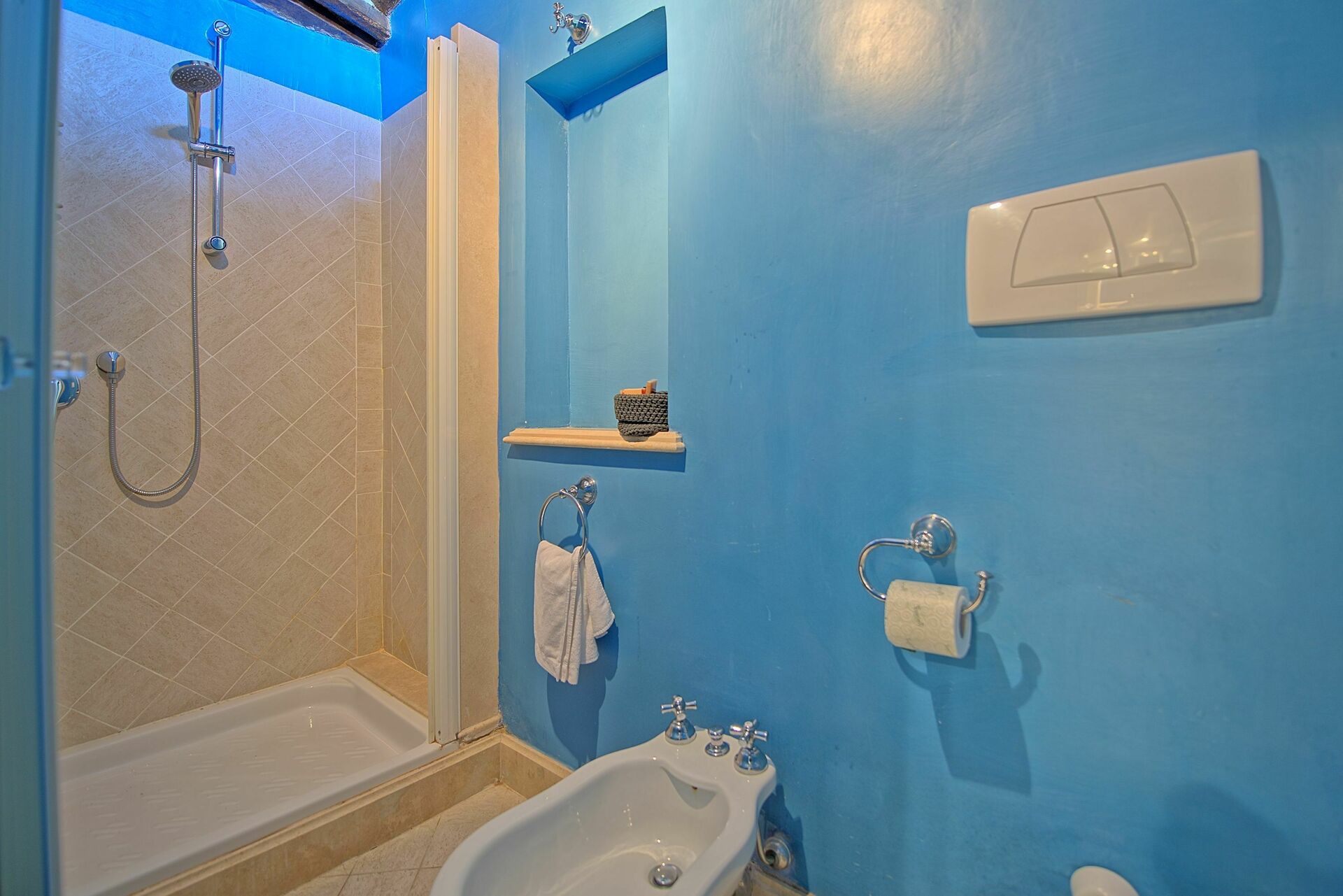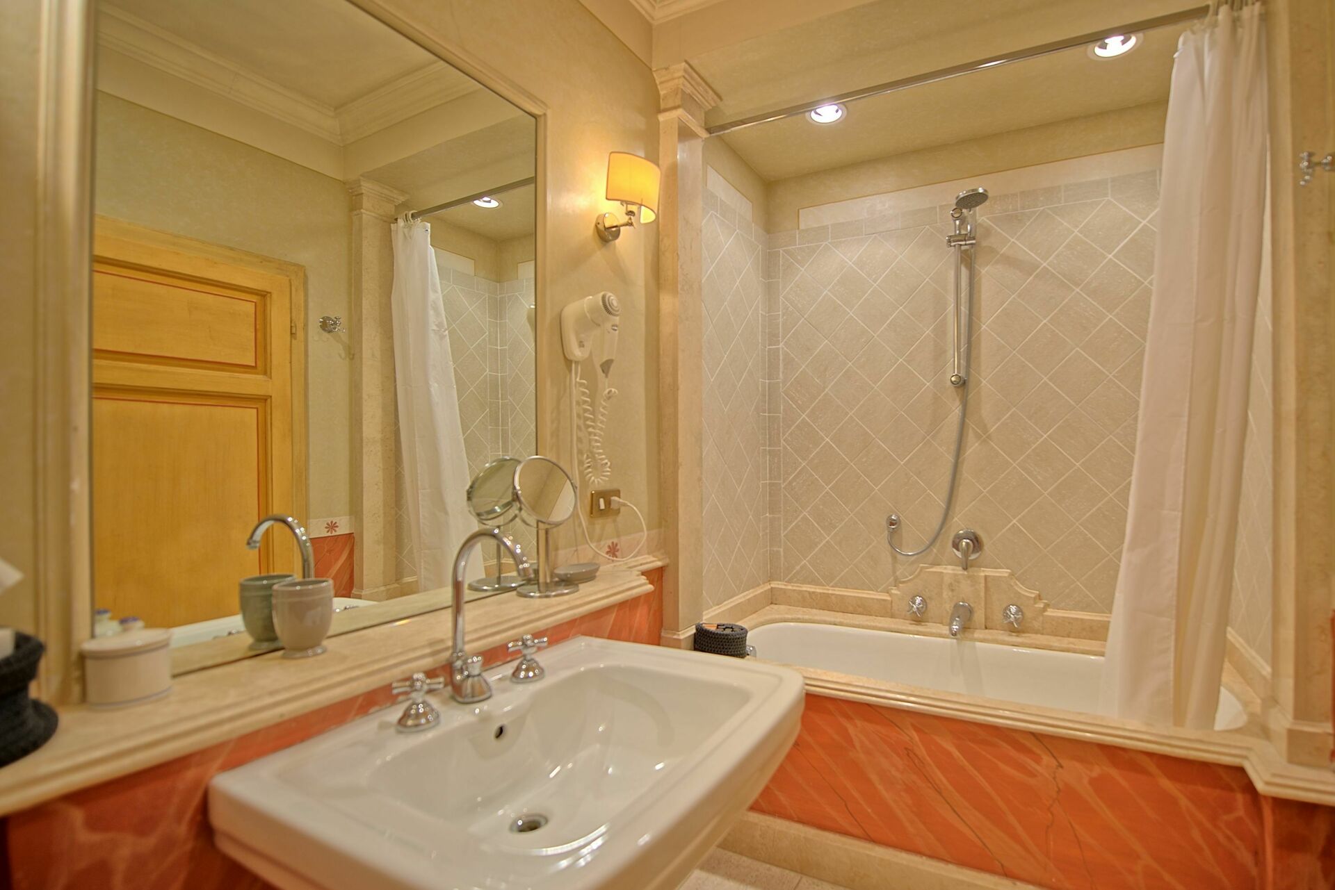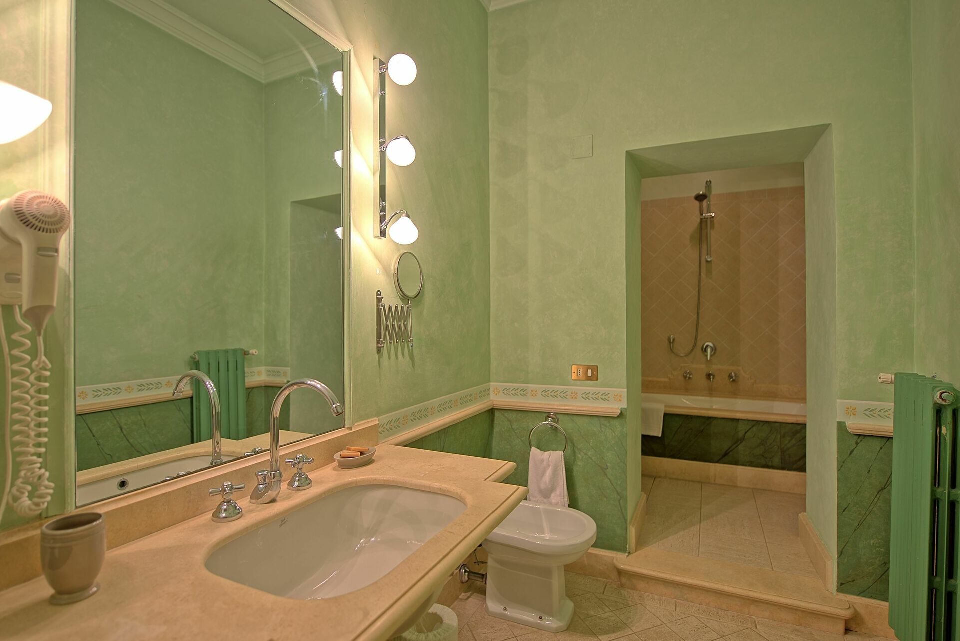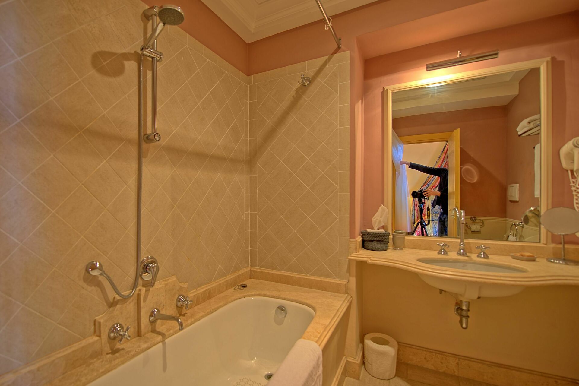 • Alle badene (med hårføner) er håndmalt og dekorert i travertinmarmor