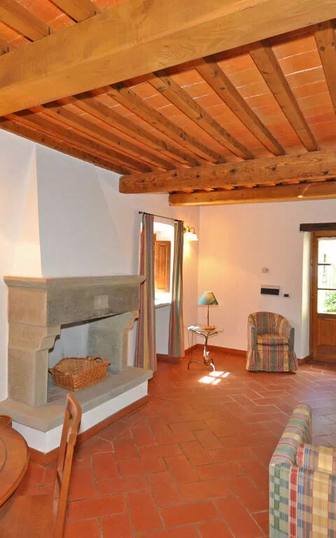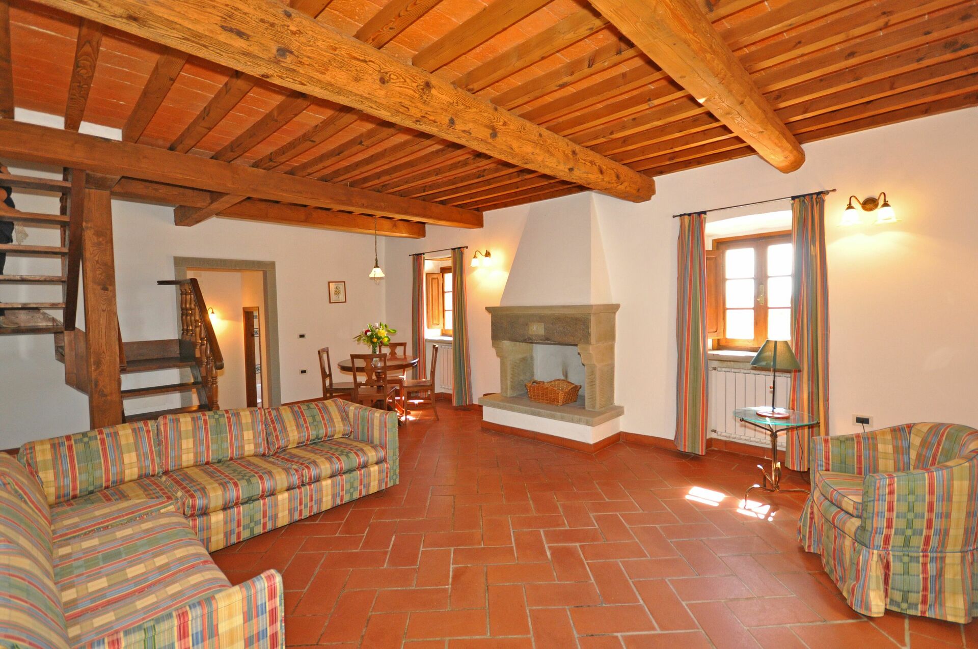 2 trinn opp: stue (satellitt-TV) med peis og spiseplass.
