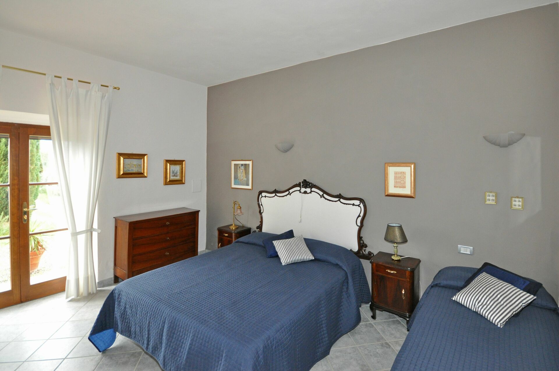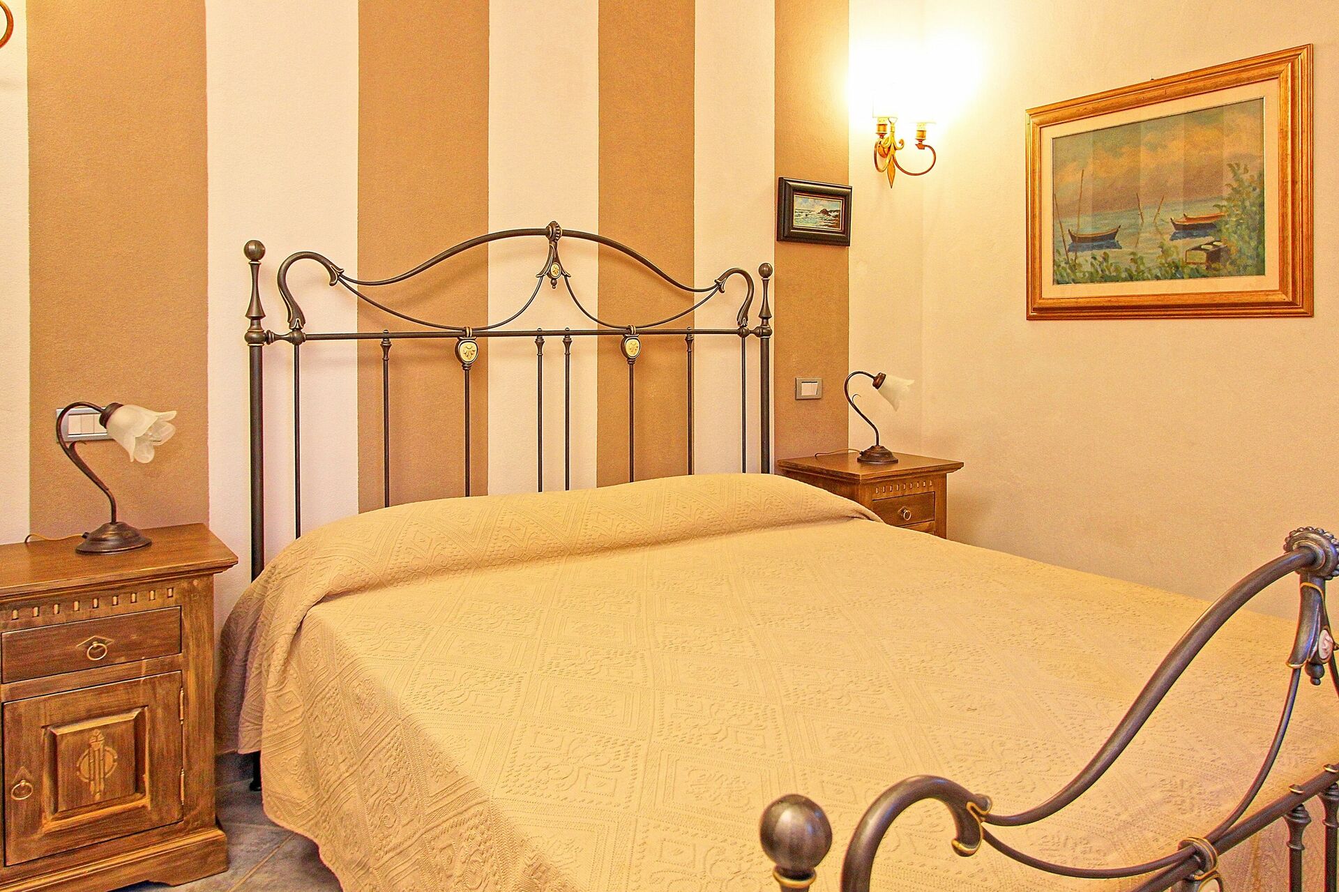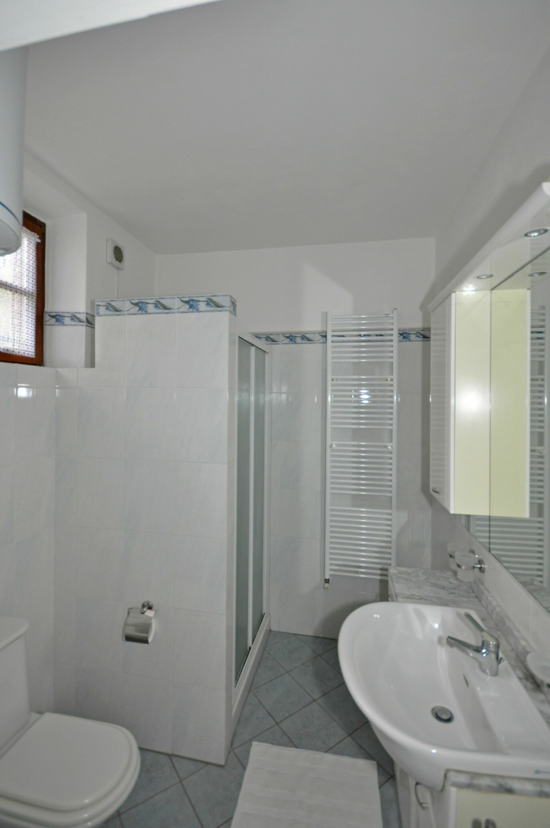 2 trinn ned (fra soverommet i gangen): soverom med dobbeltseng (sengen kan skilles på forespørsel; dette soverommet har utendørs tilgang), bad med dusj (uten bidet).