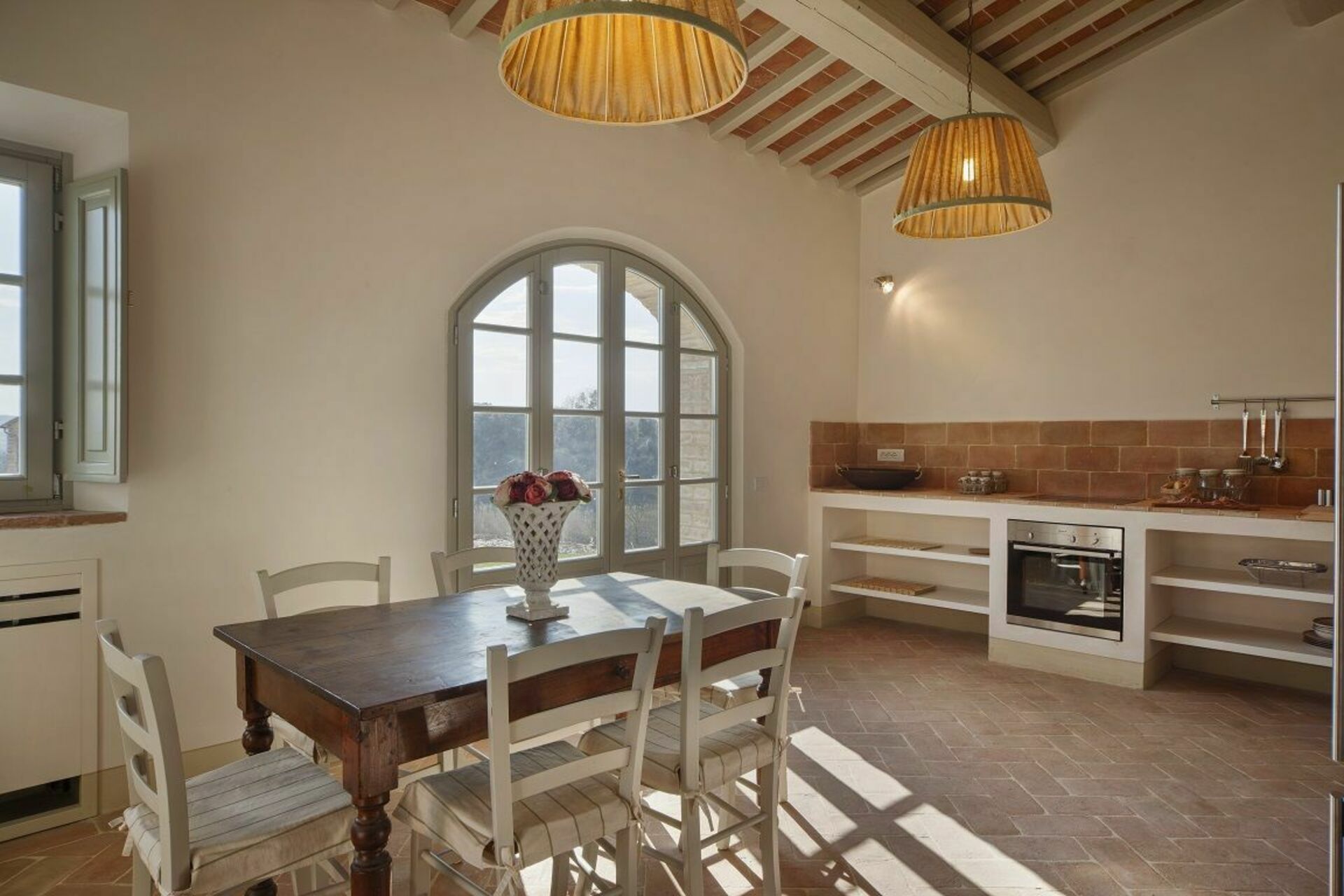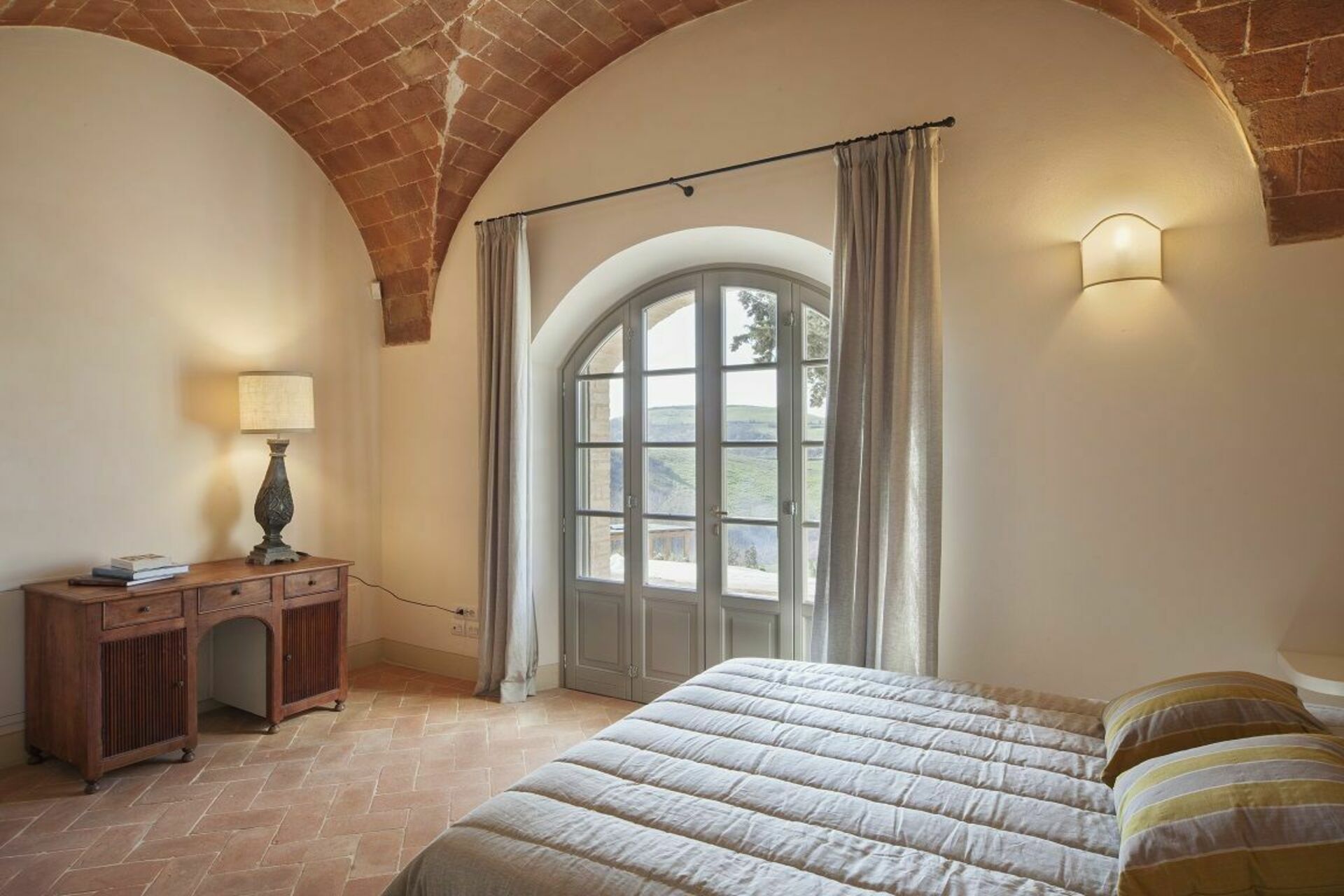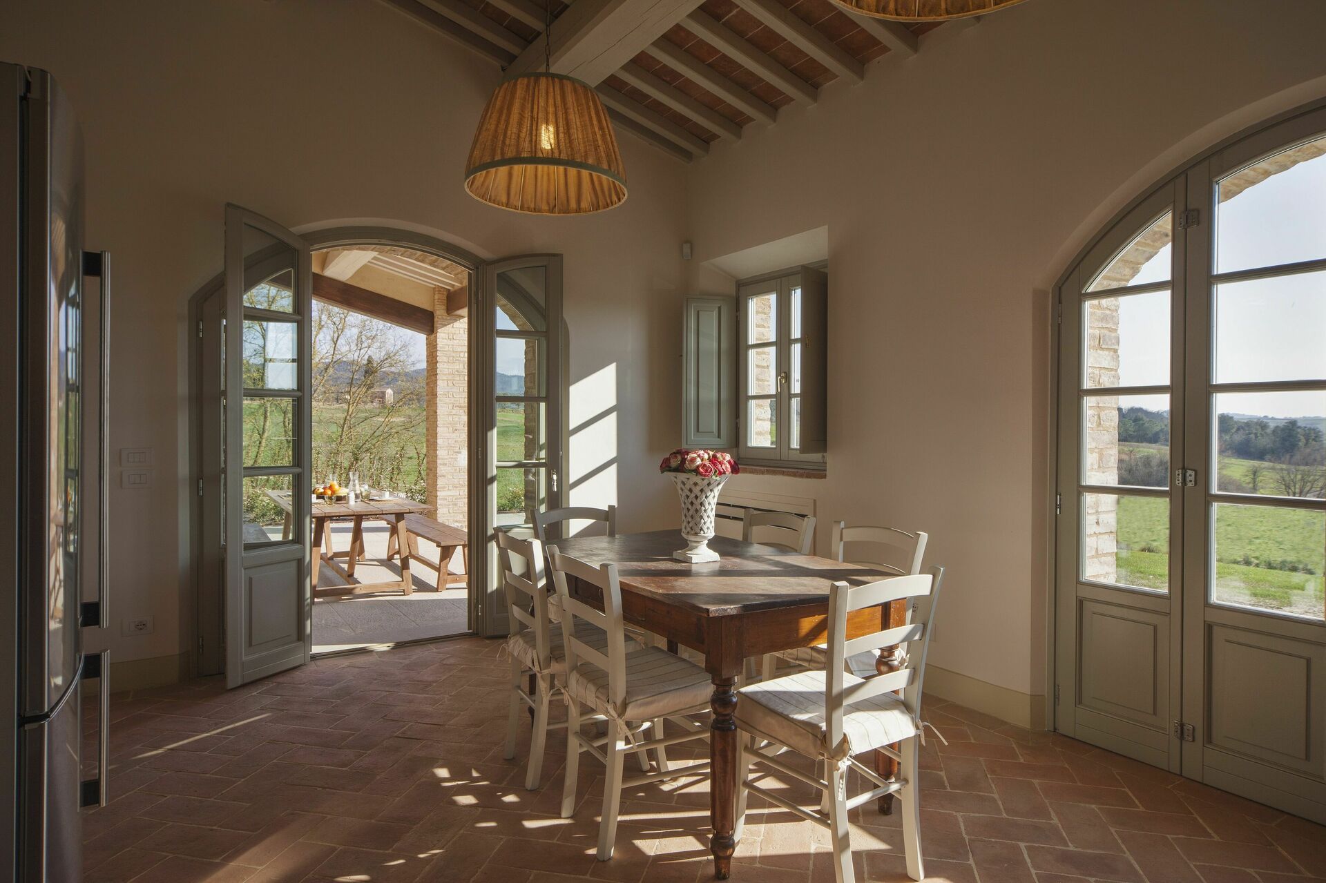 The villa and surrounding area are even more beautiful than the photos suggest. We spent six days there and were sad to leave. Castelfalfi is very centrally located to all the major towns in Tuscany. Most places are about 30-45 minutes away. The villa itself is within a beautiful hotel and golf resort, so you have access to nice restaurants on the property nearby. We loved the kitchen. It has two large sets of French doors that open up completely so that you feel like you’re indoor/outdoor at the same time. We loved cooking and eating there - though we mostly ate in the covered patio, which has a nice picnic table.We loved the kitchen. It has two large sets of French doors that open up completely so that you feel like you’re indoor/outdoor at the same We loved the bedrooms. I stayed in the master bedroom which has brick vault ceilings and french doors that open to give a wonderful view of the countryside. The other bedroom also has French doors.time. We loved cooking and eating there - though we mostly ate in the covered patio, which has a nice picnic table. We loved the bedrooms. I stayed in the master bedroom which has brick vault ceilings and french doors that open to give a wonderful view of the countryside. The other bedroom also has French doors.Fantastic. The three major sites - San Gimignano, Sienna, Volterra, Pisa - are all 30-45 minutes away. Florence is about 1h20 minutes.The pool is nice though it’s often filled with bugs given that the villa is out in the countryside. However the property is well maintained and we saw staff cleaning the pool a few times during our stay.