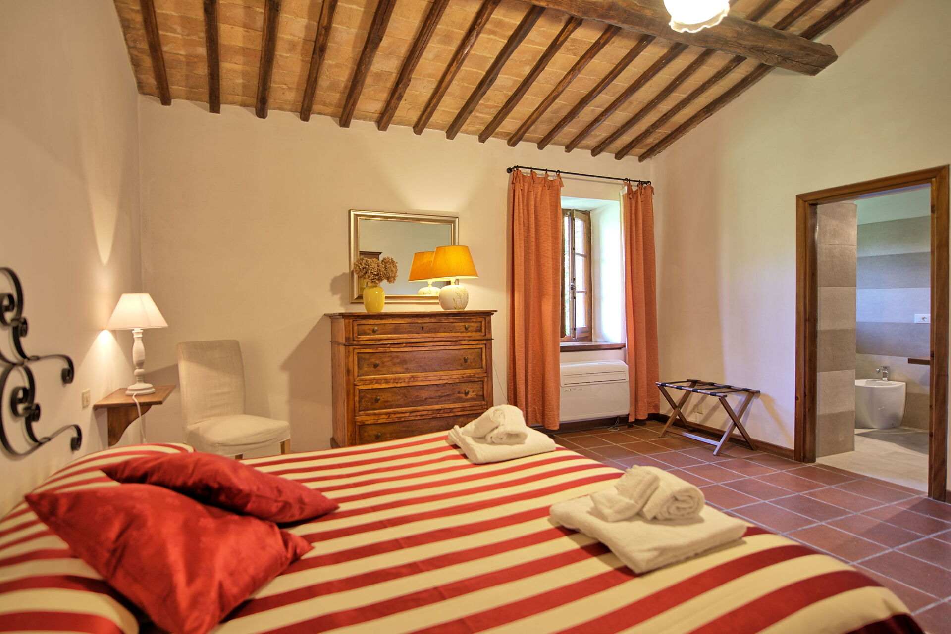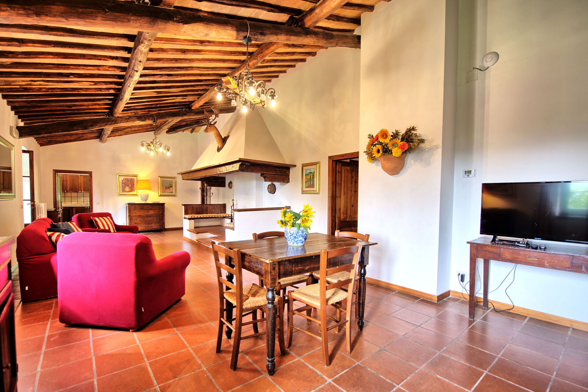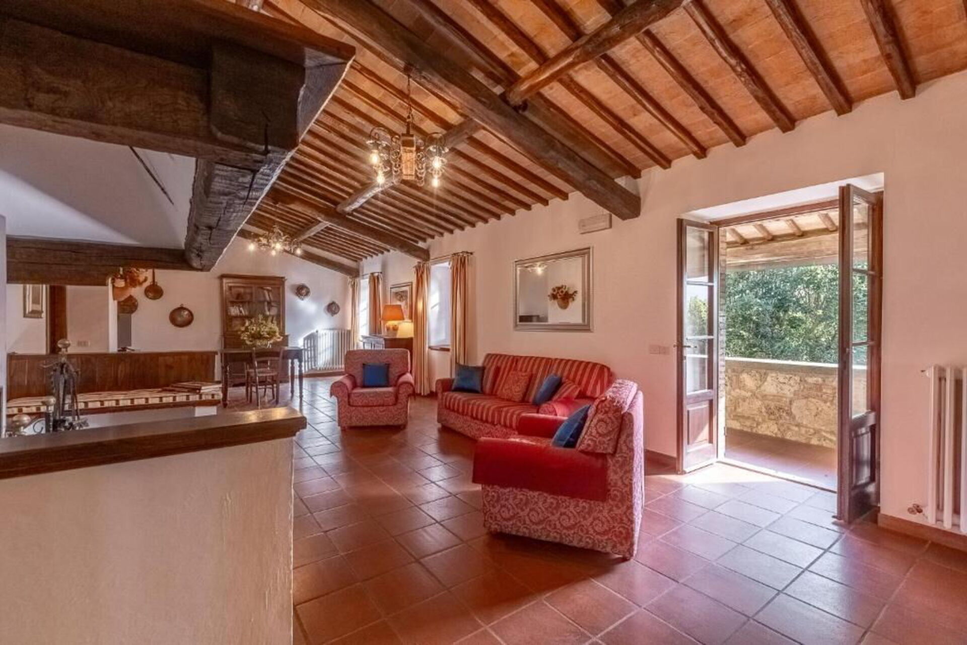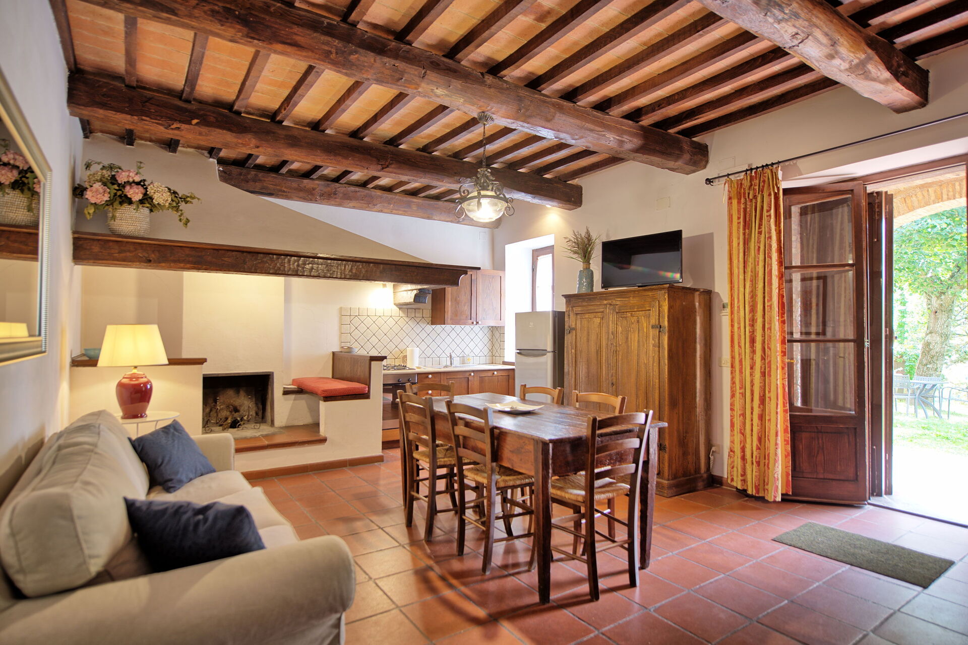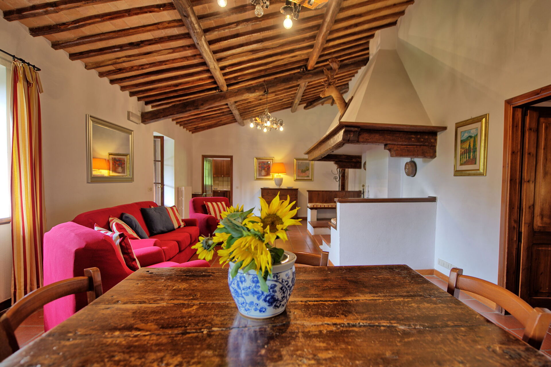Fra feriehuset har man fantastisk 360° utsikt over Toscana-landskapet. Huset har blitt møysommelig renovert på en måte som har bevart mange av de originale detaljene som store peiser, terrakottagulv og trebjelker i taket.