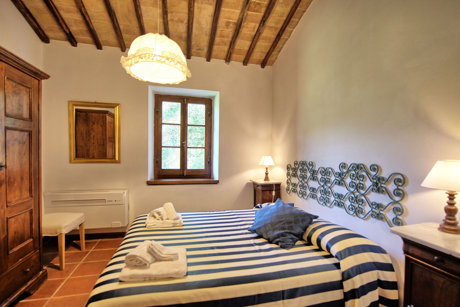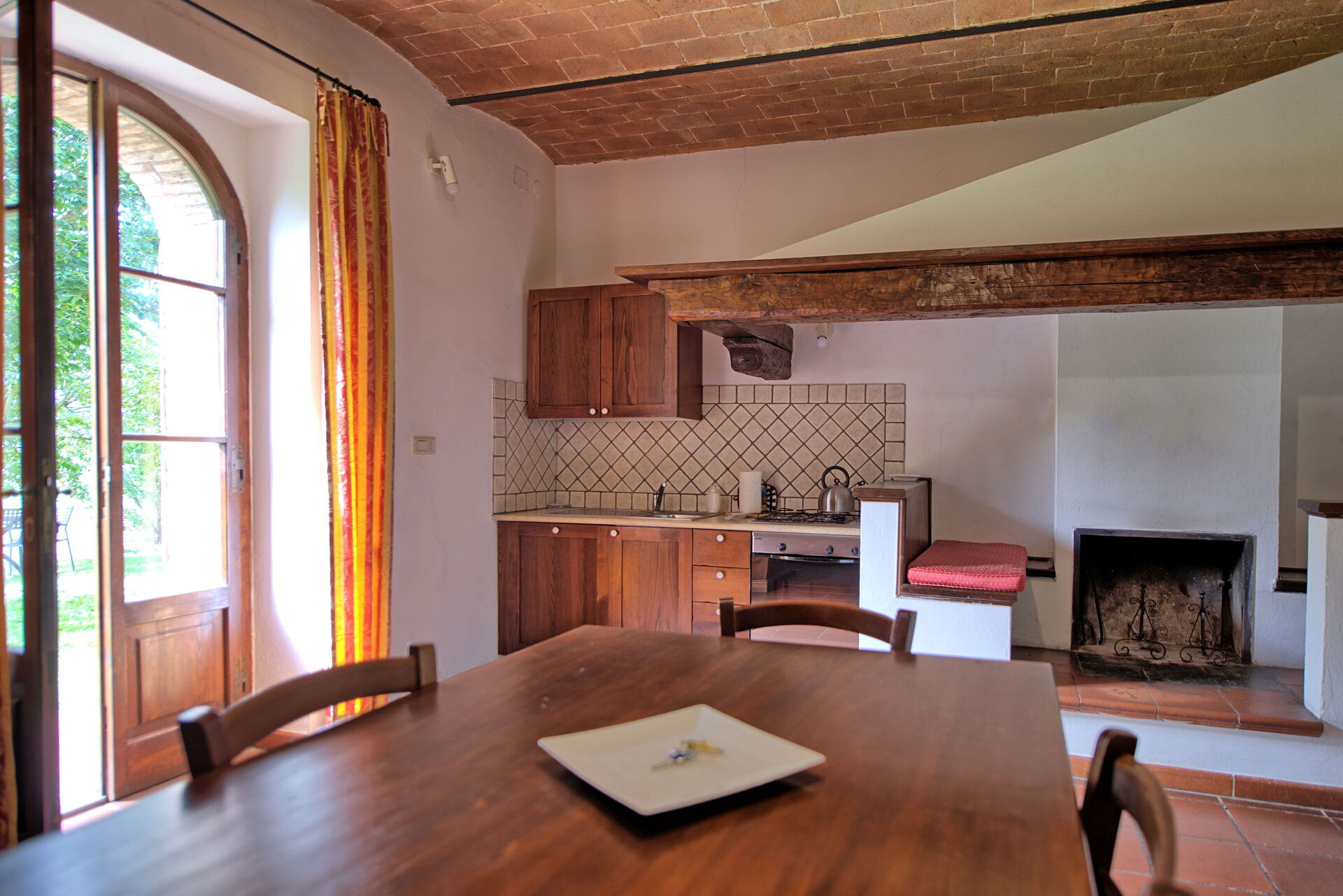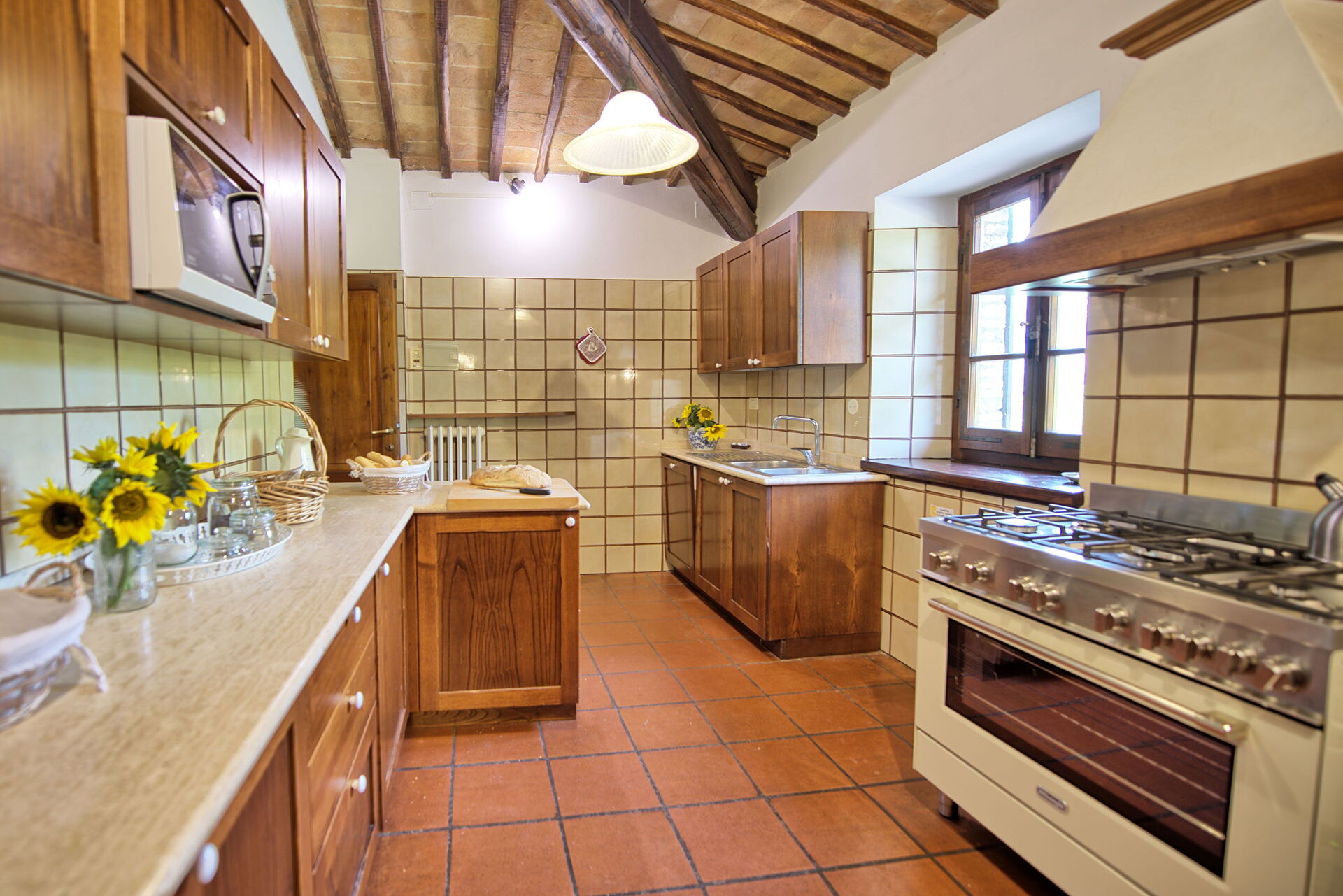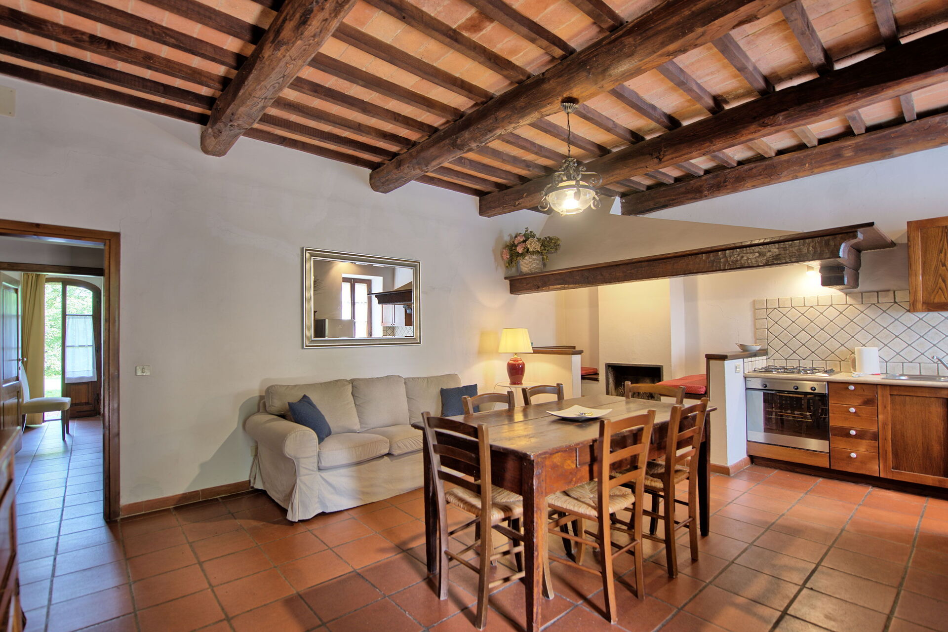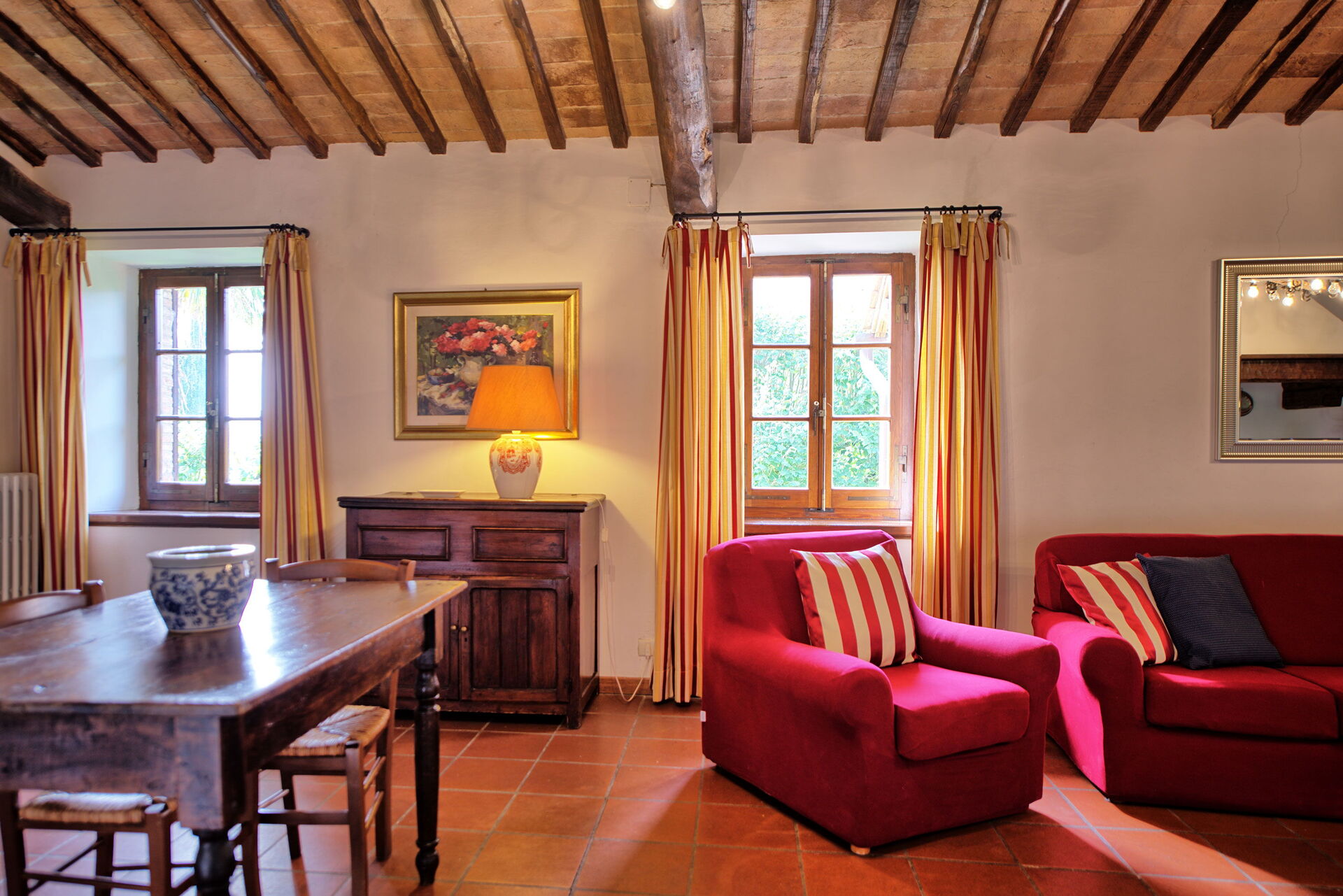 Fra feriehuset har man fantastisk 360° utsikt over Toscana-landskapet. Huset har blitt møysommelig renovert på en måte som har bevart mange av de originale detaljene som store peiser, terrakottagulv og trebjelker i taket.