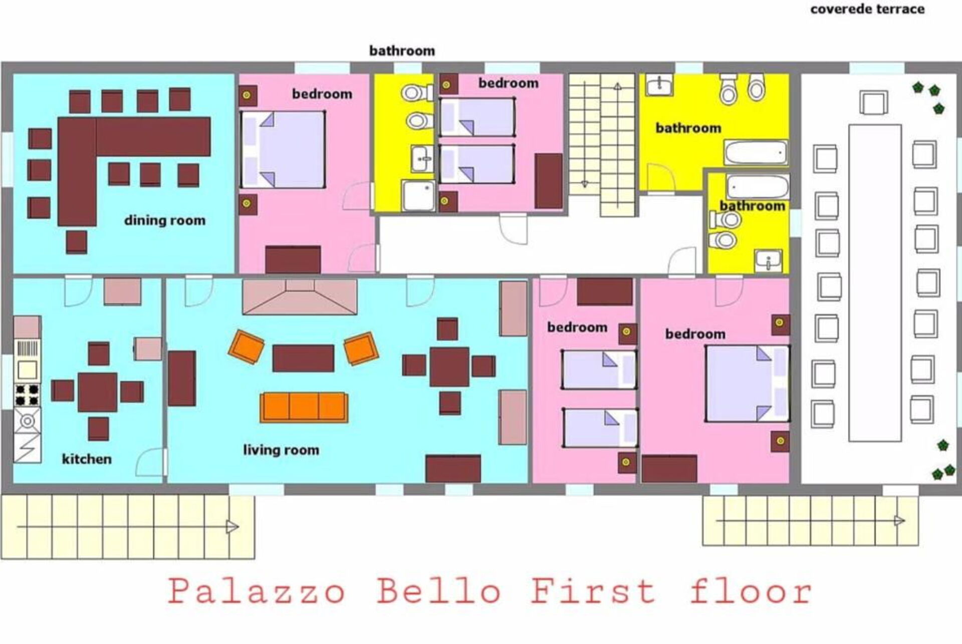 Eiendommen er perfekt for store grupper som ønsker å tilbringe ferien sammen med samtidig ha mulighet for privatliv: Palazzo Bello er delt inn i 4 leiligheter og byr på totalt 10 soverom som til sammen kan komfortabelt innkvartere opptil 20 personer. I andre etasje er det en stor hall hvor hele gruppen kan samles for felles måltider. Det er også en stor utendørs veranda dersom man ønsker å site ute.
