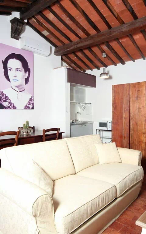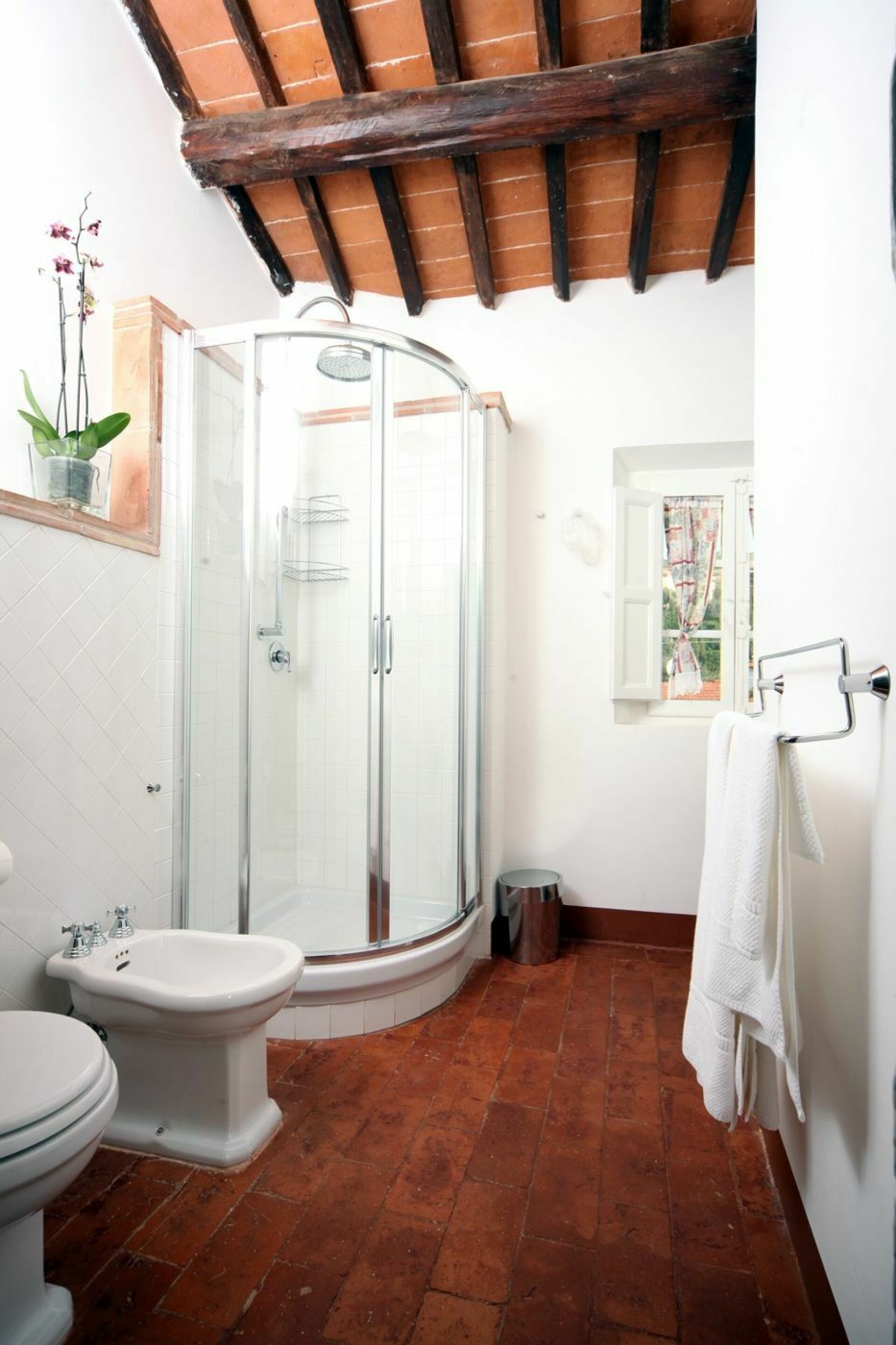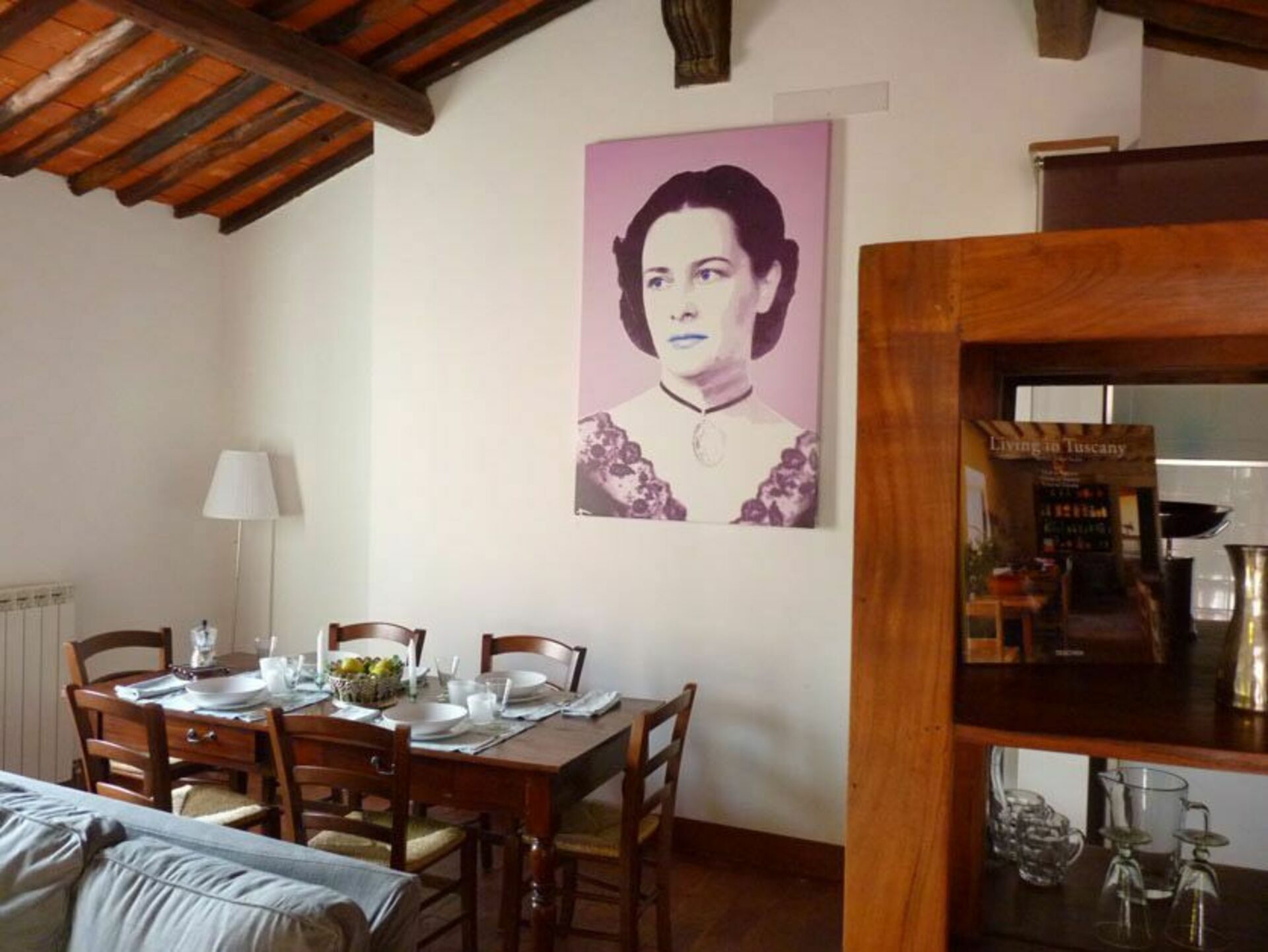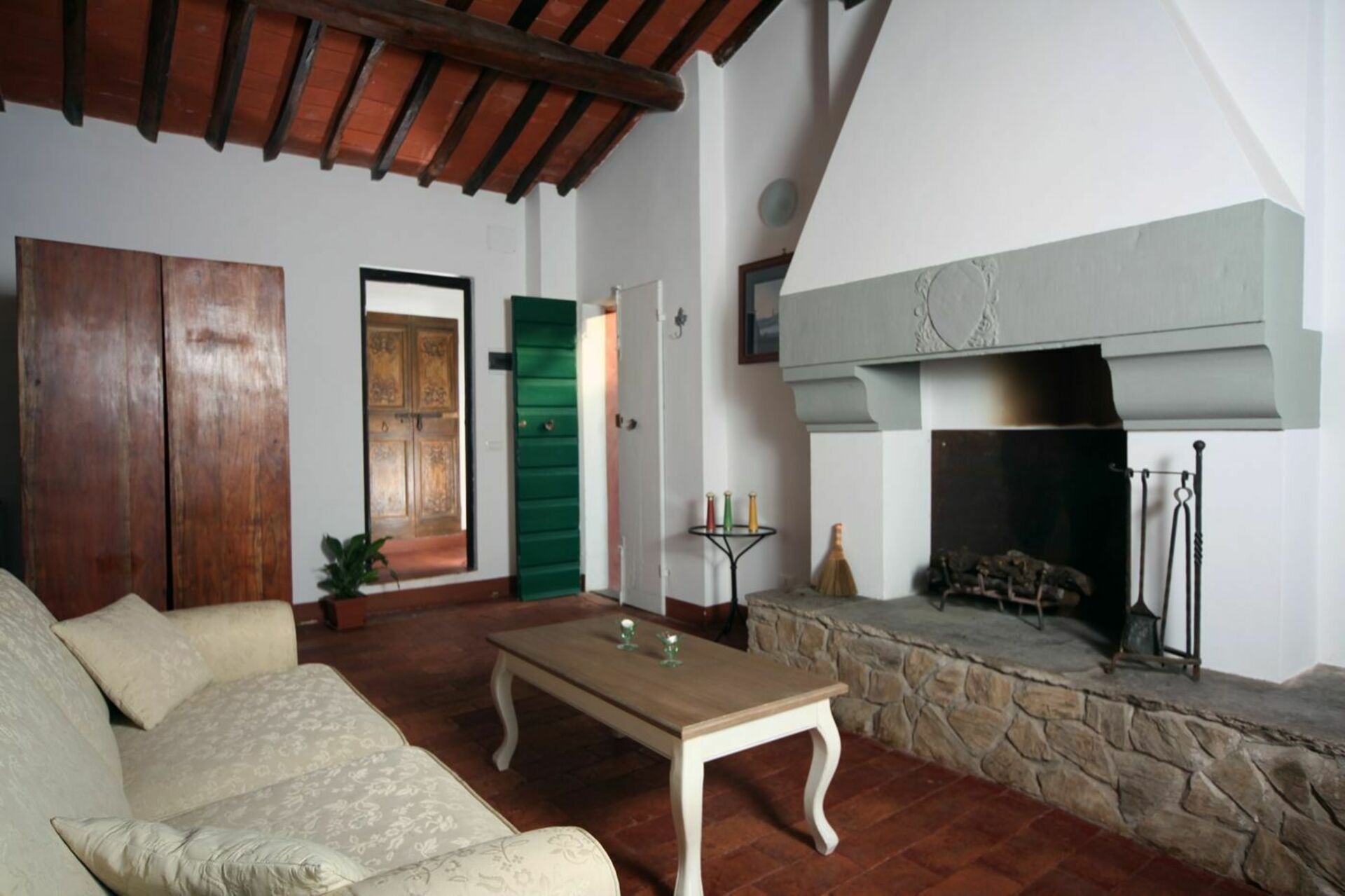 Innredningen er lys og en blanding av arvede møbler og moderne innslag som står i fin kontrast til de rustikke trebjelkene og terrakottagulvene.