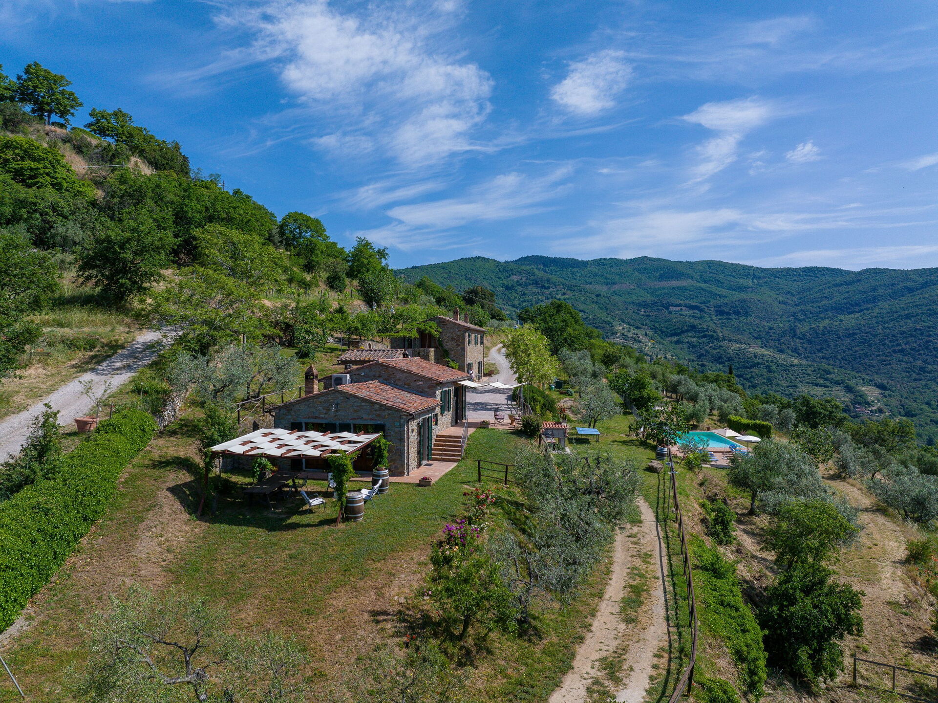 Boligen er fra tidlig 1400-tallet, fullstendig restaurert med opprinnelige trekk bevart i rustikk toskansk bondestil (synlige bjelker, terrakottagulv, bruk av tre og lokal stein). Feriehuset ligger i et kupert landskap preget av dyrkede åkre, skog og olivenlunder, og har en vakker hage med mange planter og blomster og et vakkert svømmebasseng som er forbeholdt gjestene.