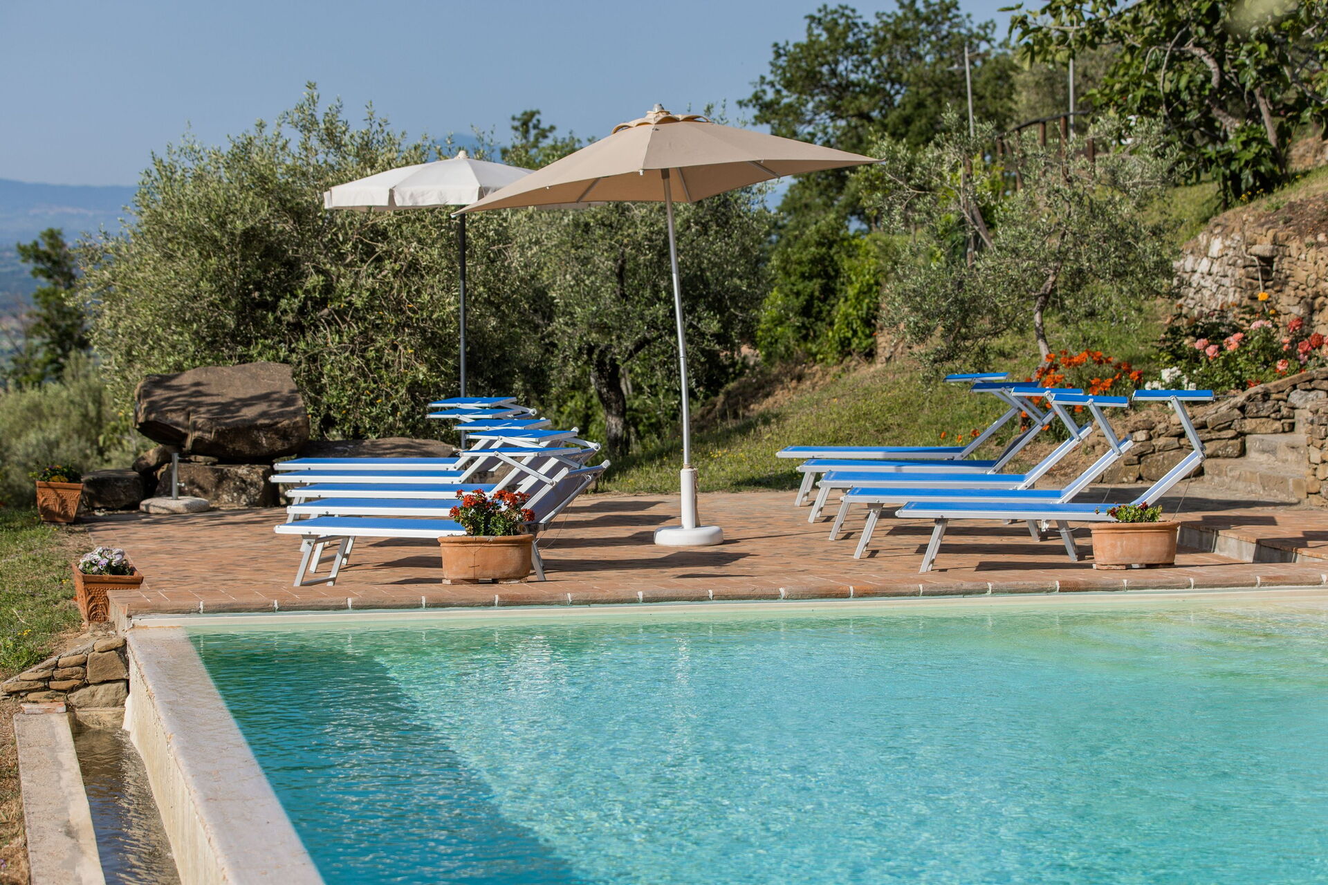 Bassengdekket med solsenger og panoramautsikt er et perfekt sted å tilbringe lange timer under den toskanske solen og slappe av. Et stort område med grill, vedovn, bord og stoler gjør det mulig å arrangere deilige lunsjer og middager i det fri, mens freden i det toskanske landskapet og de vakre, verdensberømte åsene nytes.