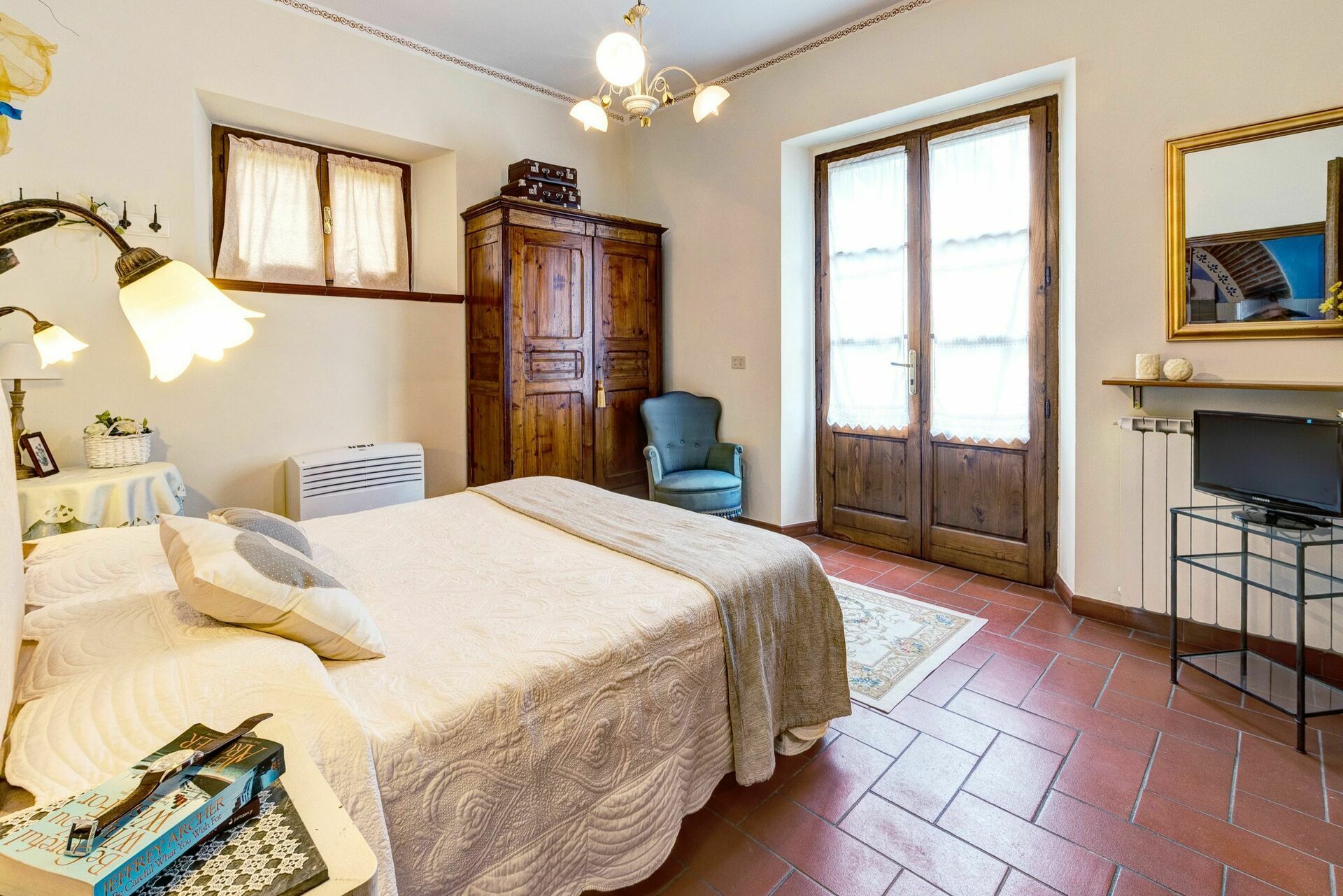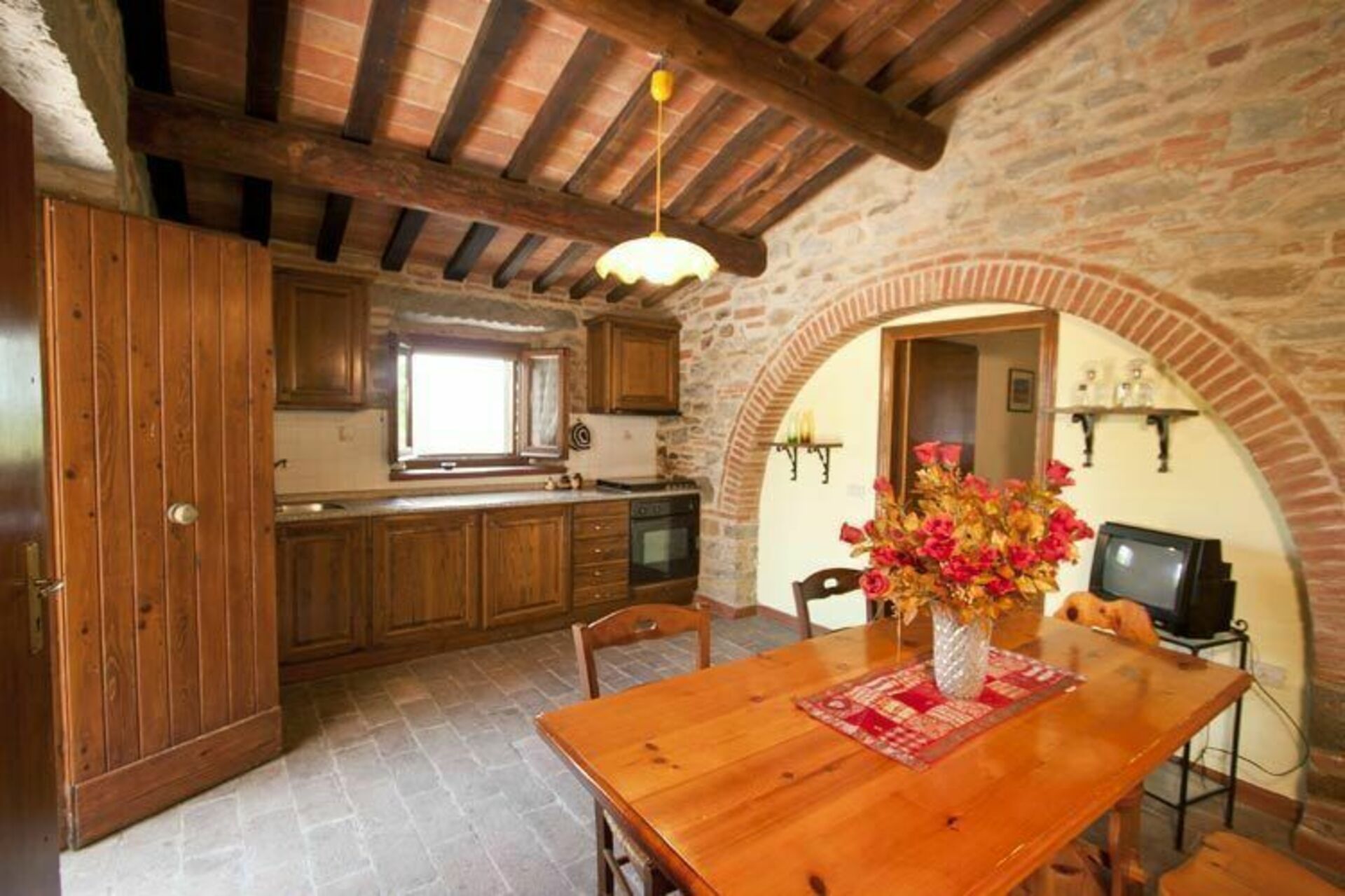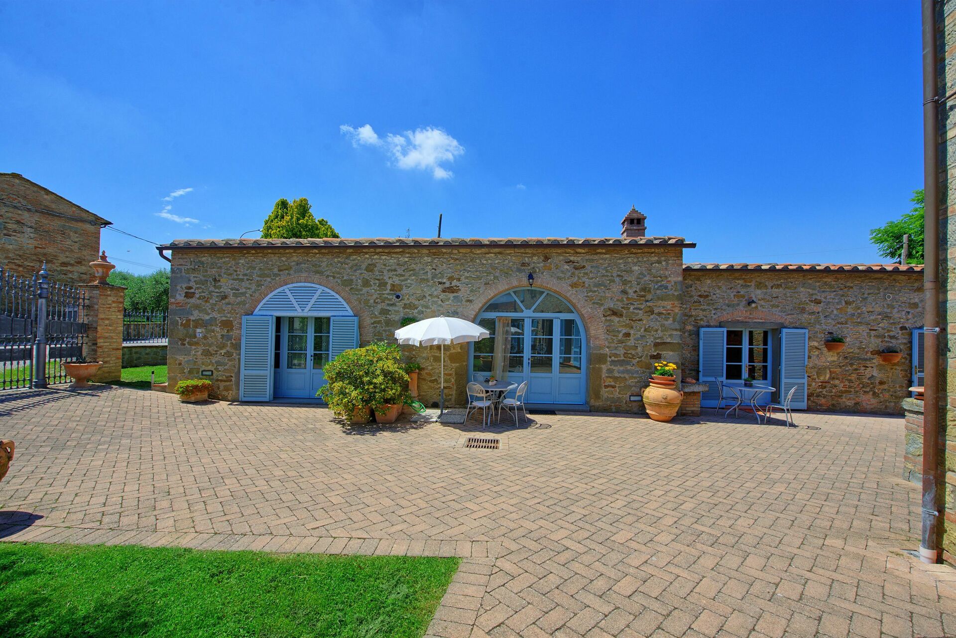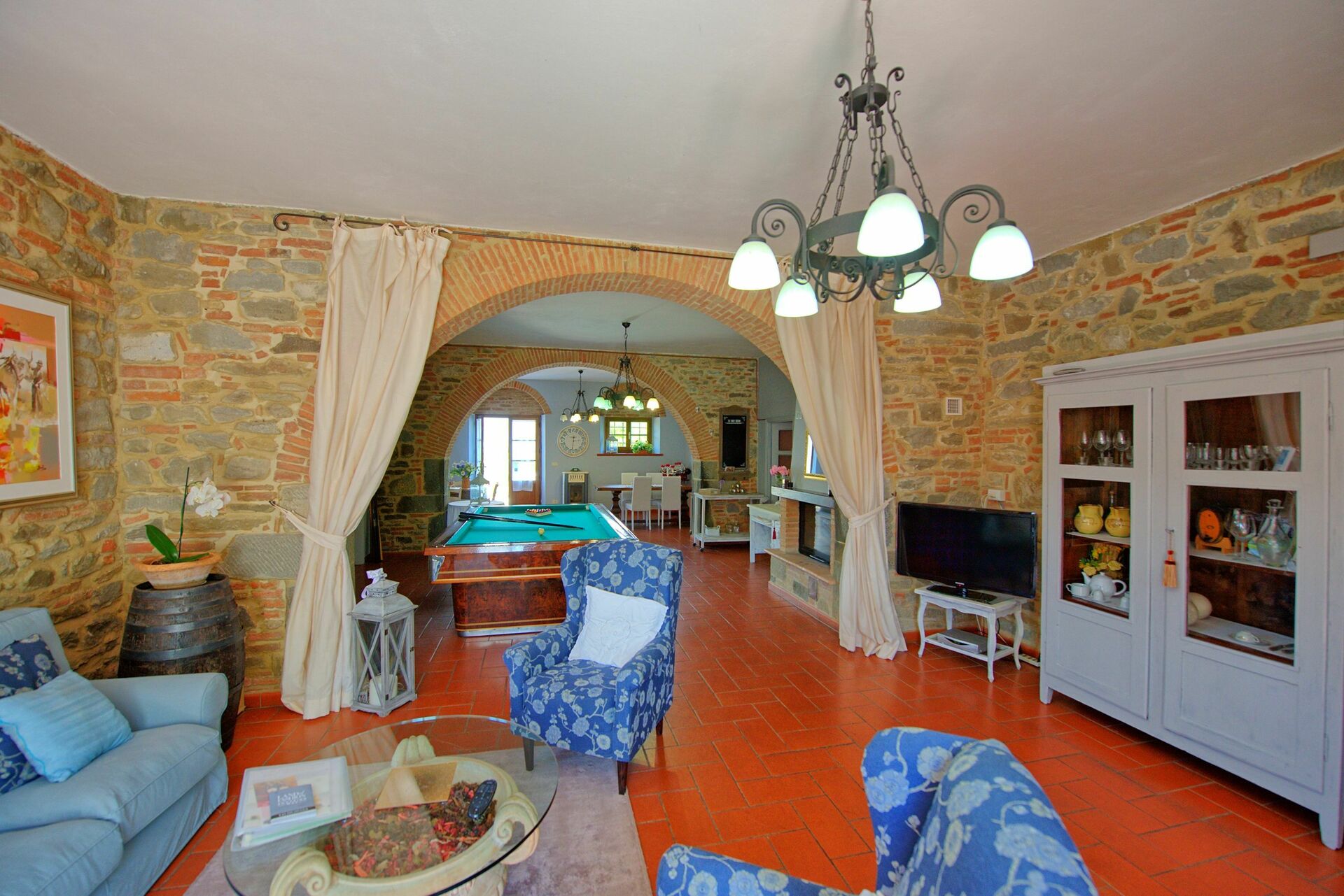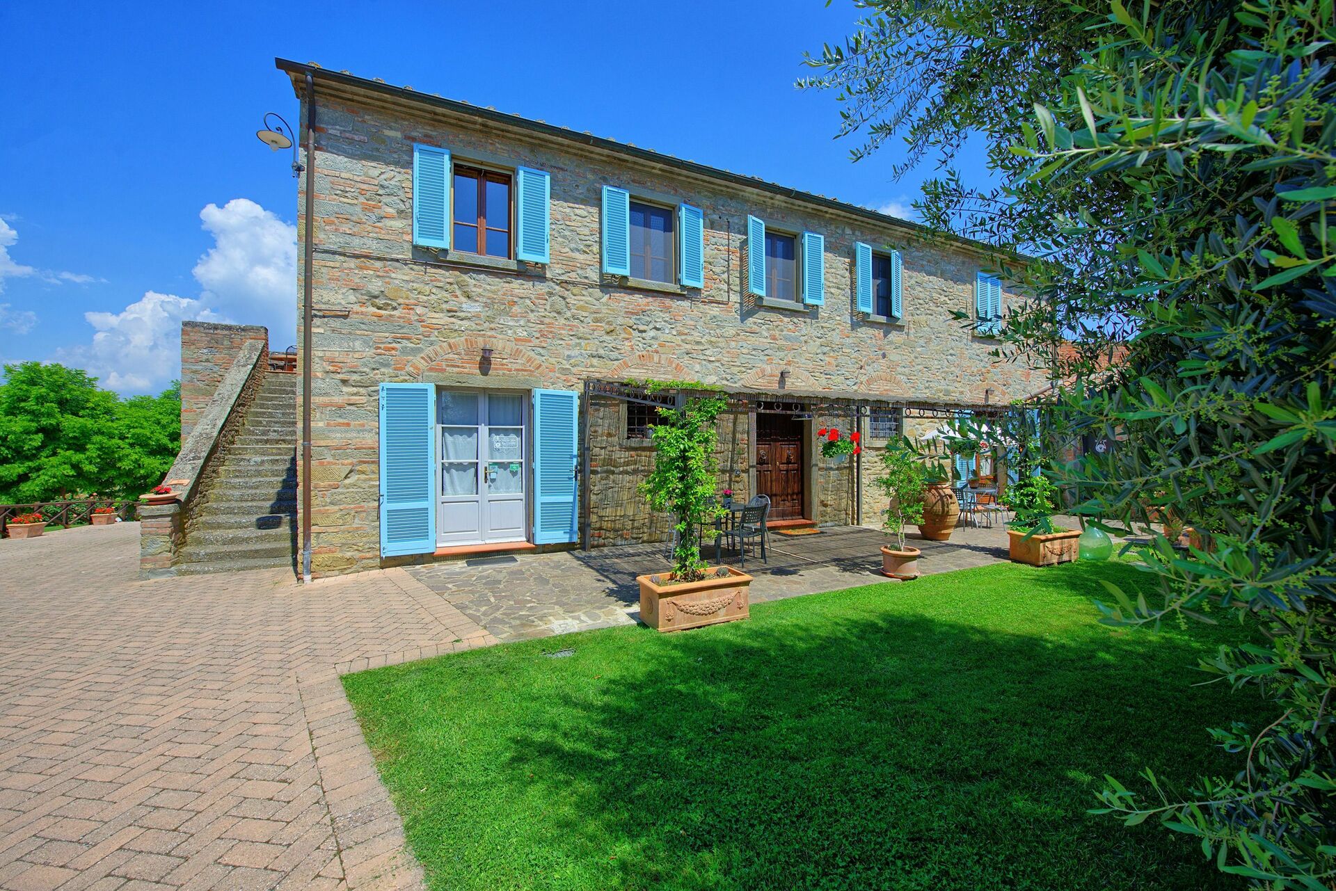 Denne sjarmerende gamle eiendommen ligger i rolige omgivelser og har panoramautsikt til åsene rundt den vakre byen Cortona. Eiendommen er også et perfekt utgangspunkt for å nå andre kjente steder i Toscana som Arezzo, Montepulciano, Pienza, samt Perugia og Assisi i Umbria.