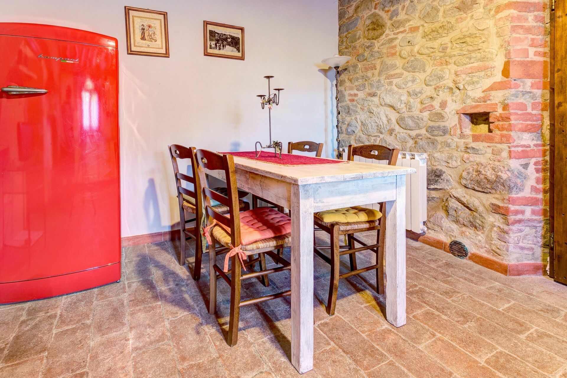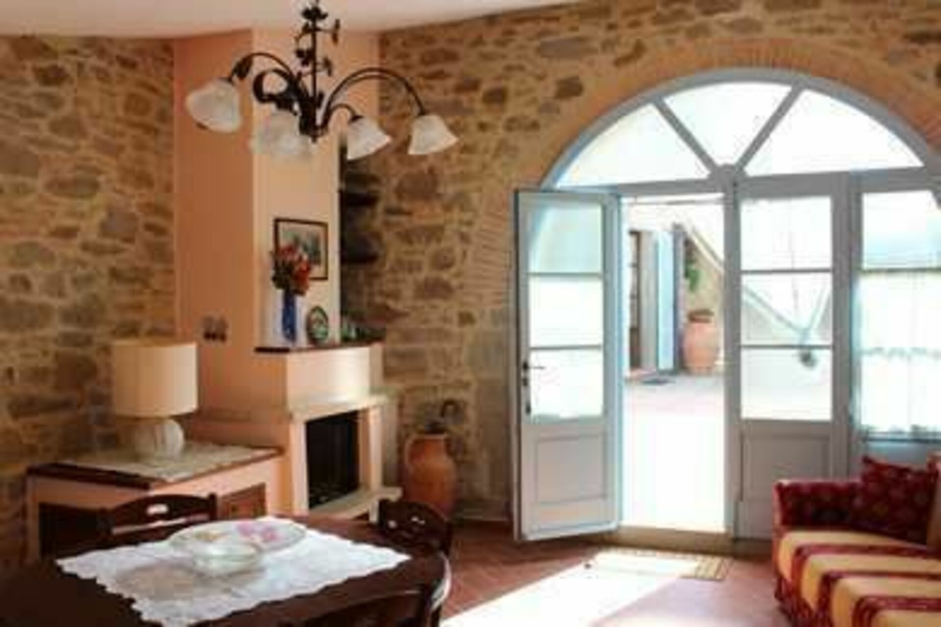 Andre etasje: stue med peis og kjøkkenkrok, soverom med dobbeltseng (aircondition), bad med dusj.