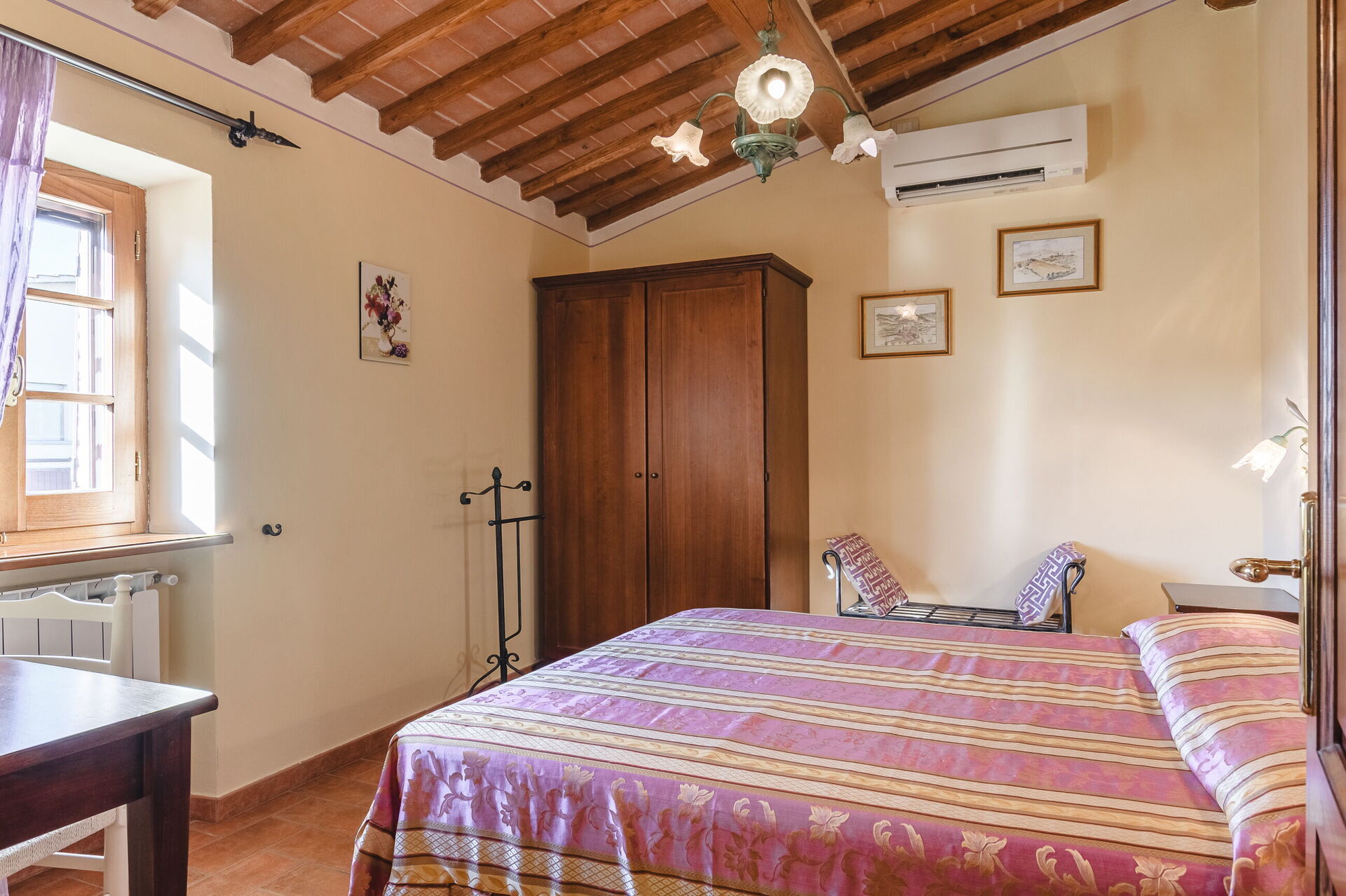 Pent gårdshus med privat basseng til leie i Toscana. Feriehuset ligger på en stor gård ved byen Camucia ved foten åssiden som leder opp mot den vakre byen Cortona. Cortona har røtter tilbake til den etruskiske tiden.