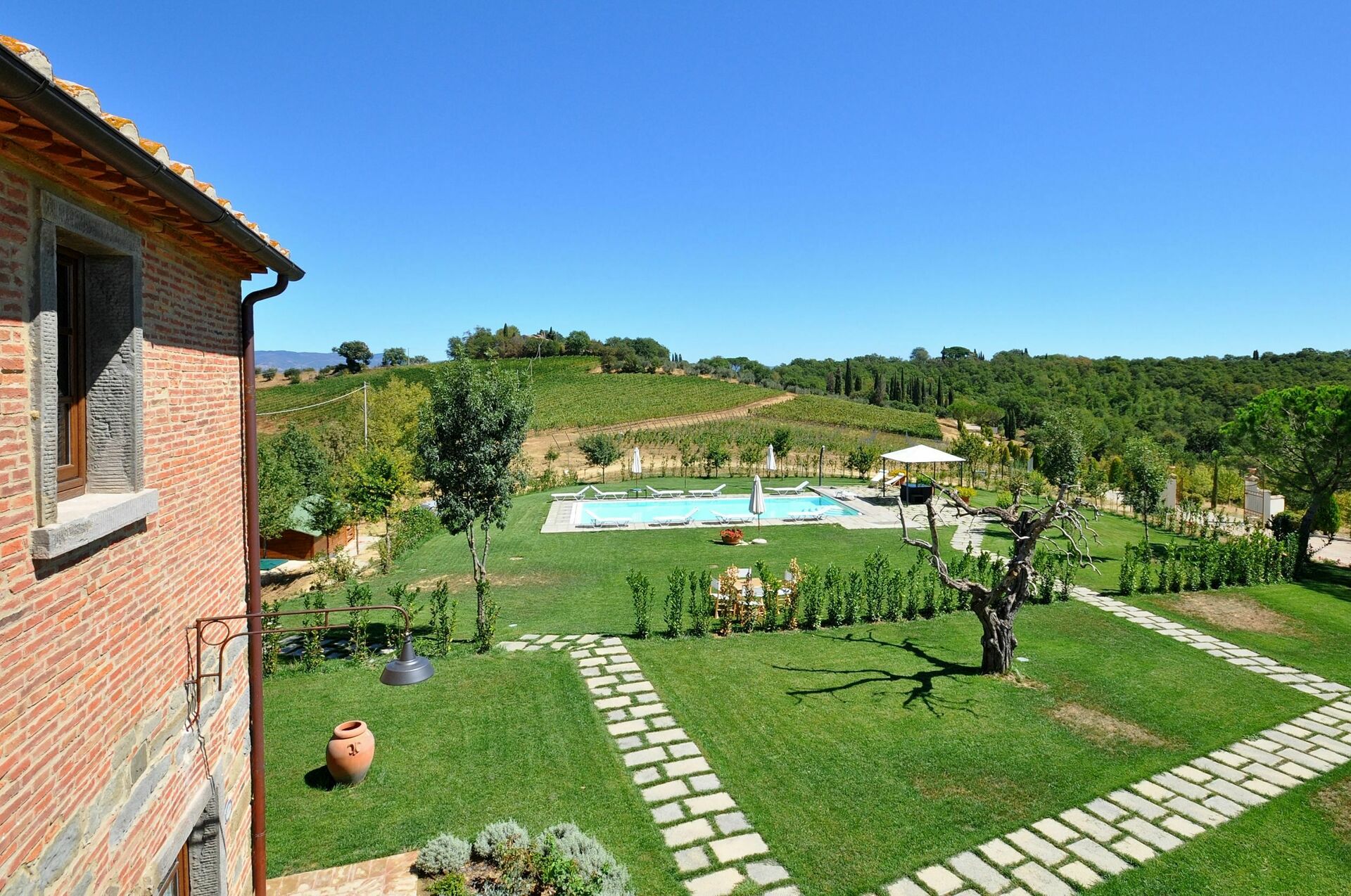 The property was gorgeous with olive trees and overlooked vineyards. The guest house we stayed in was very comfortable and clean. The pool was great too!