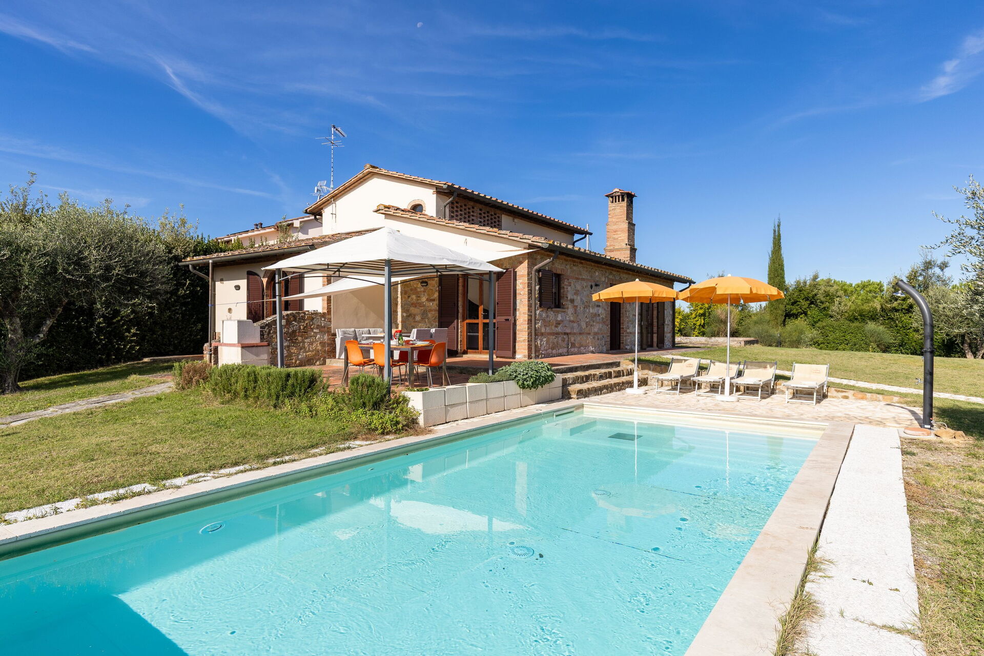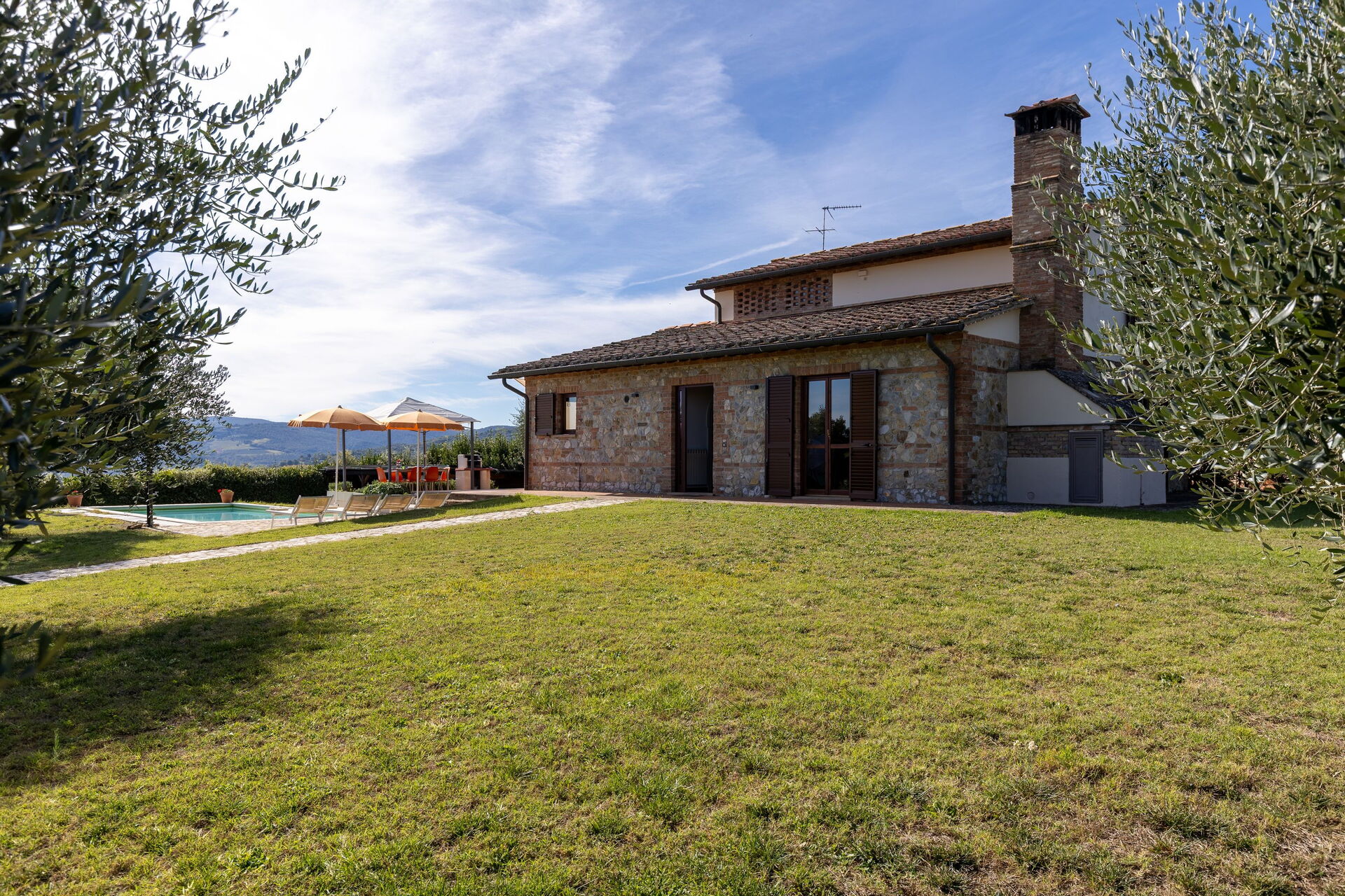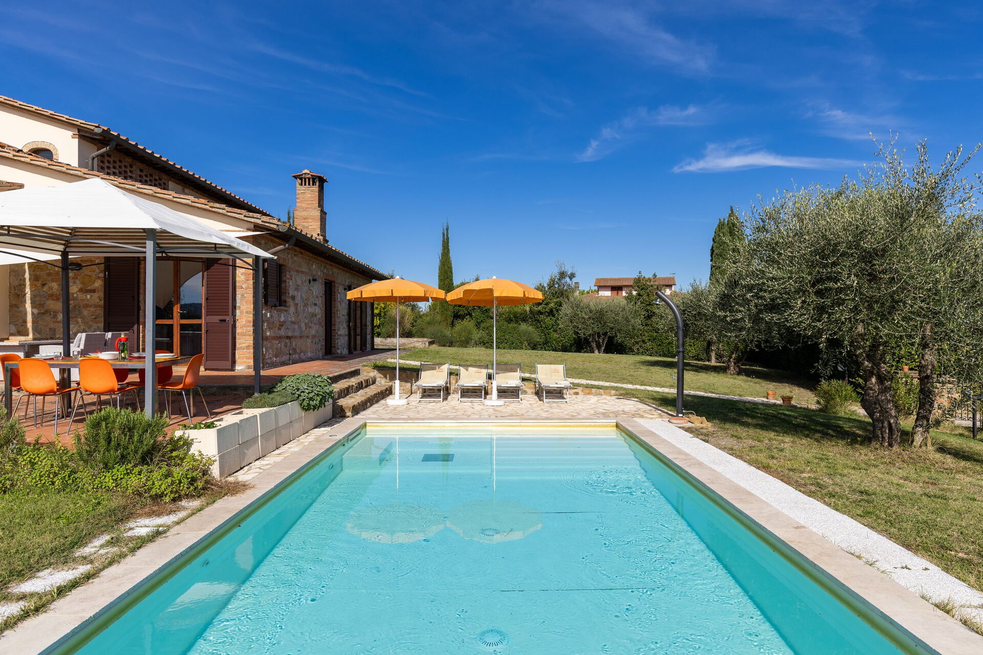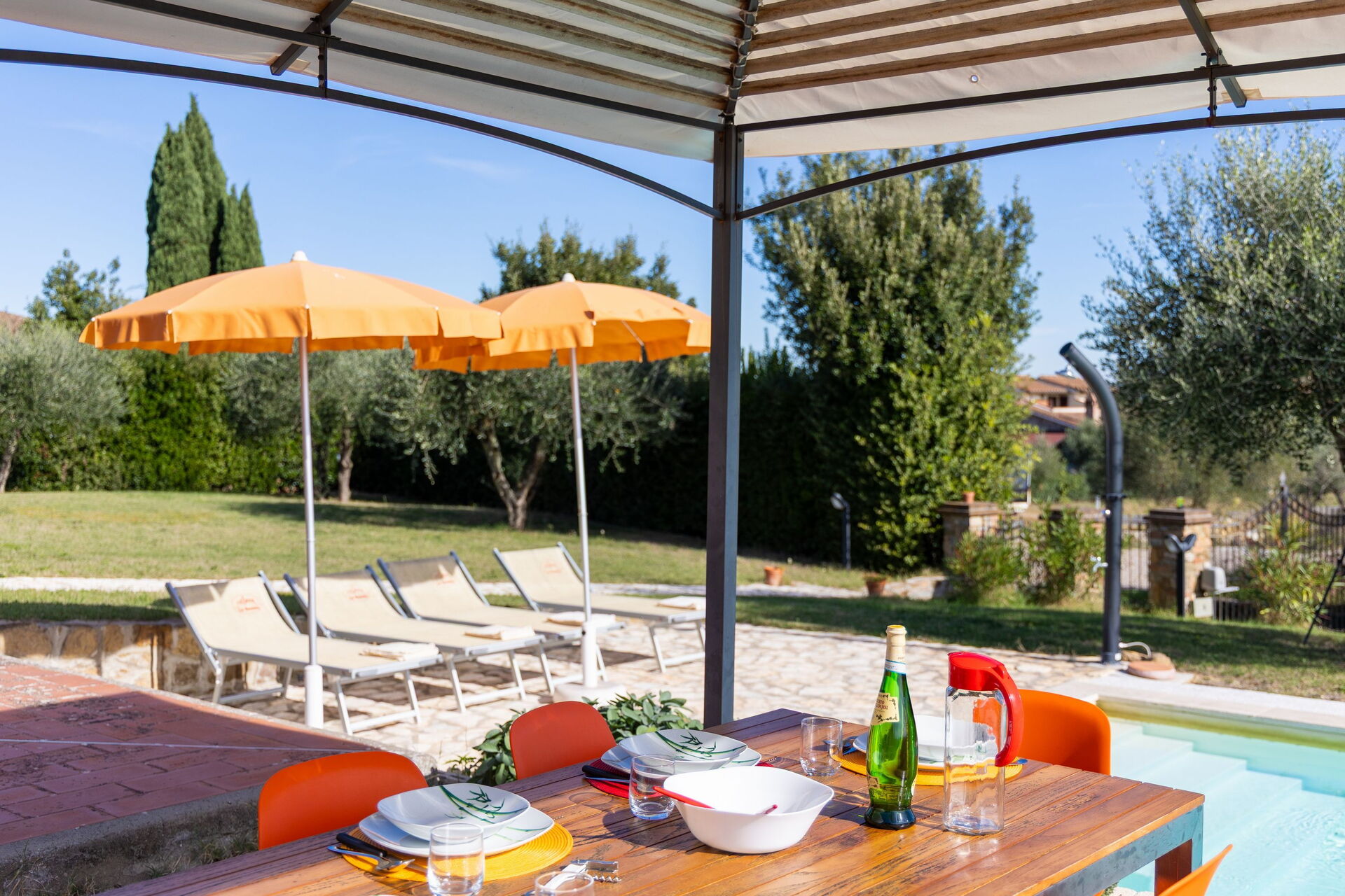 På uteområdet kan gjestene nyte godt av en hage og et splitter nytt basseng (med romerske trapper og et avslapningsområde med en geysir). Fra feriehuset har man utsikt over det vakre landskapet rundt og de berømte tårnene i middelalderbyen San Gimignano. I nærheten av kjøkkenet, mellom huset og bassenget, er det et område møblert med lysthus, bord, stoler og grill.