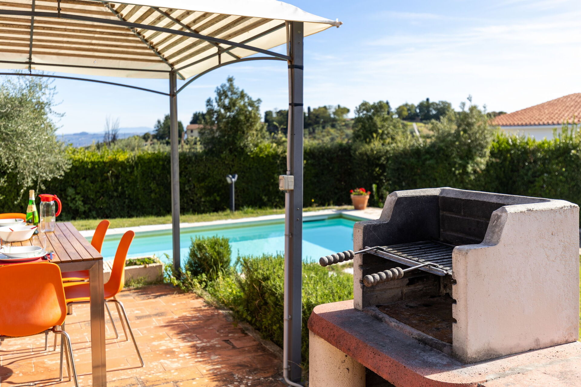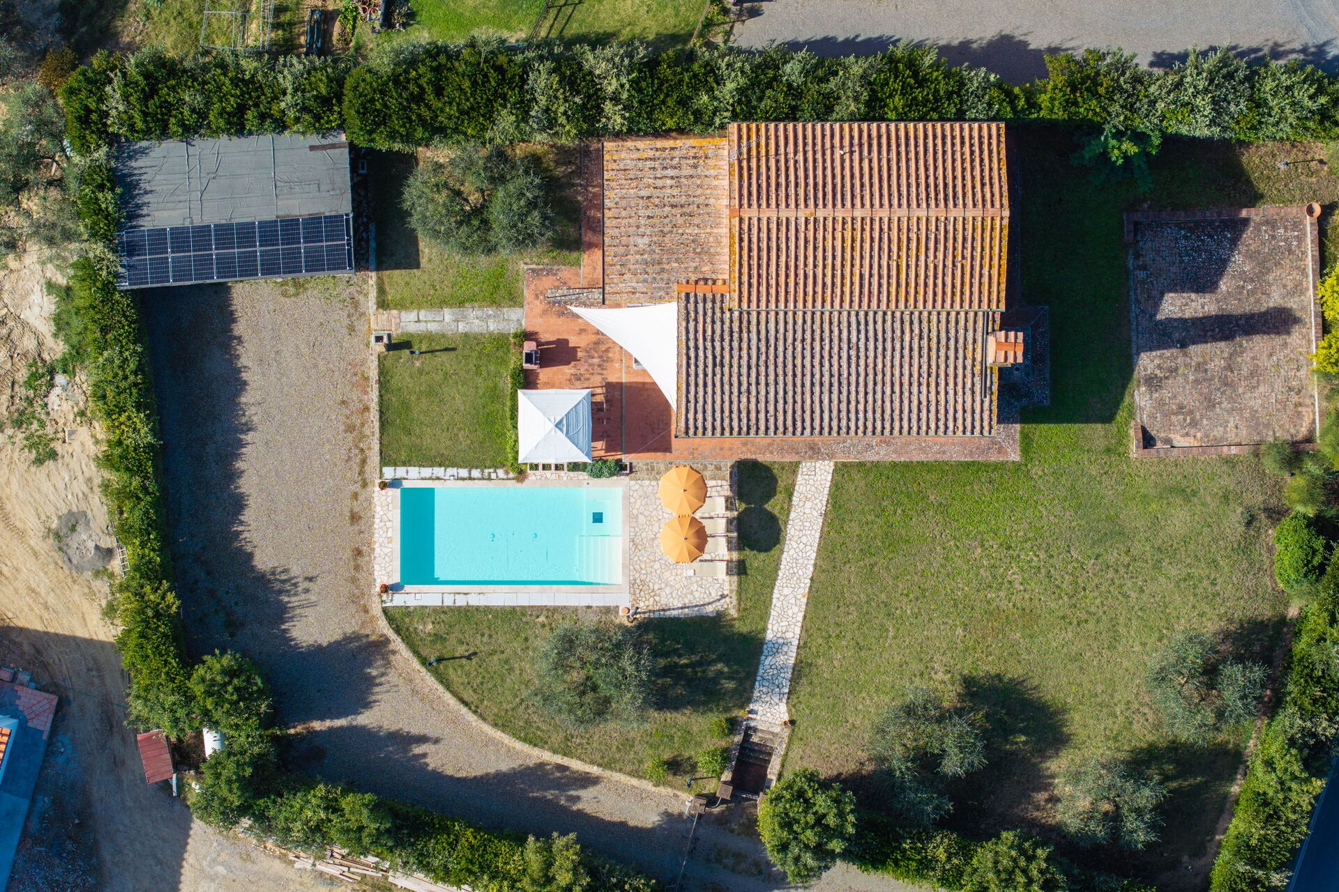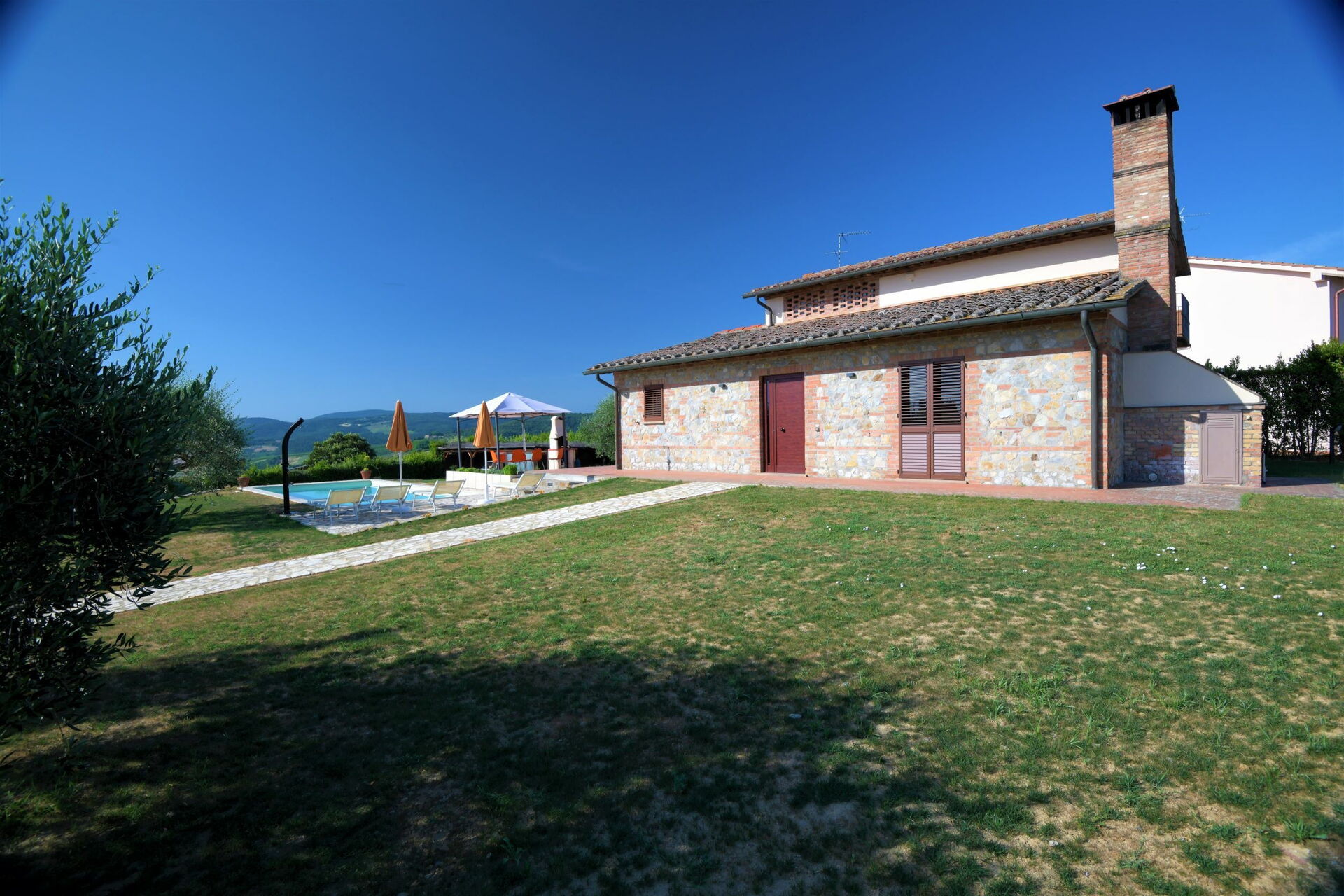 På uteområdet kan gjestene nyte godt av en hage og et splitter nytt basseng (med romerske trapper og et avslapningsområde med en geysir). Fra feriehuset har man utsikt over det vakre landskapet rundt og de berømte tårnene i middelalderbyen San Gimignano. I nærheten av kjøkkenet, mellom huset og bassenget, er det et område møblert med lysthus, bord, stoler og grill.