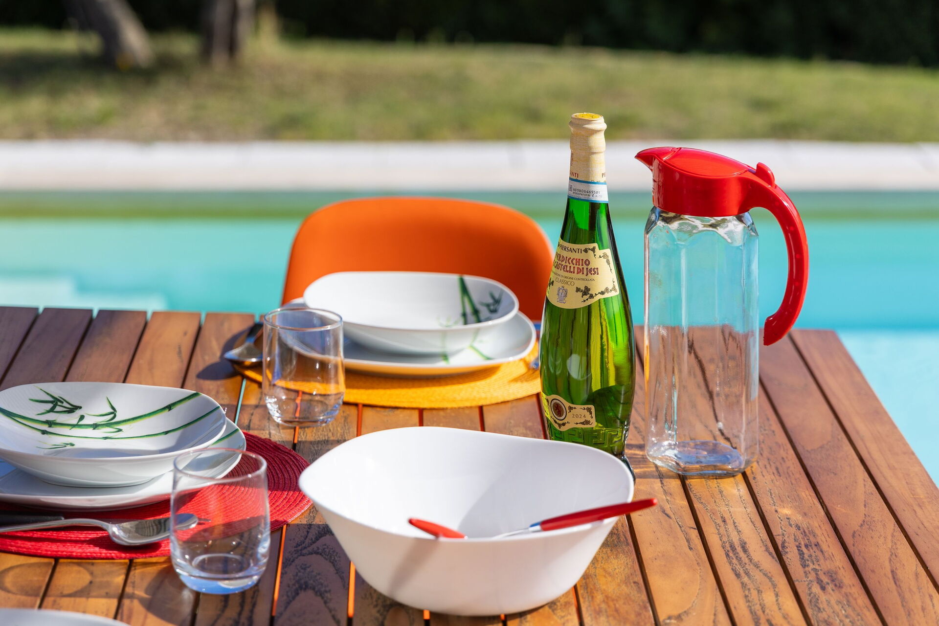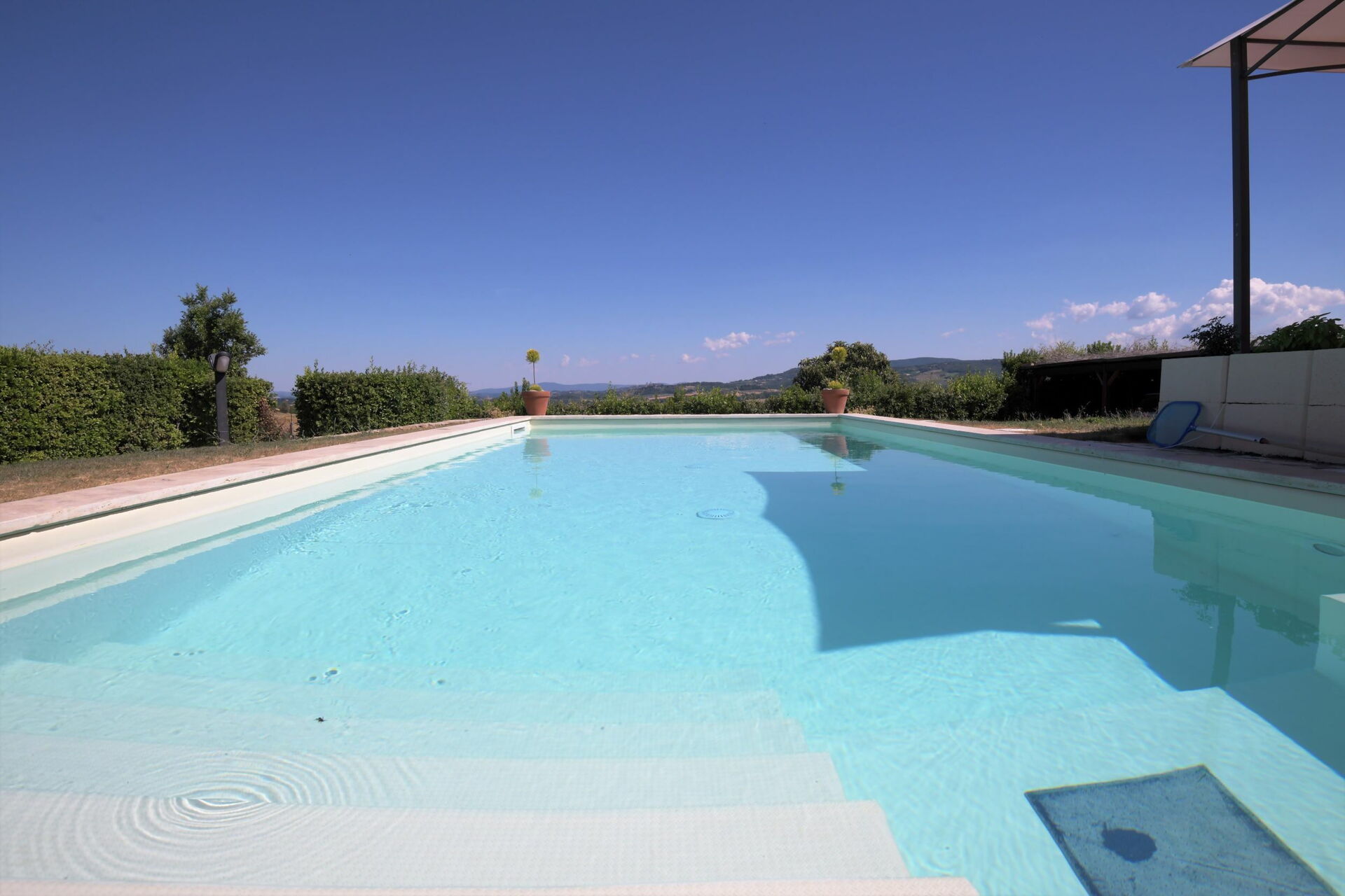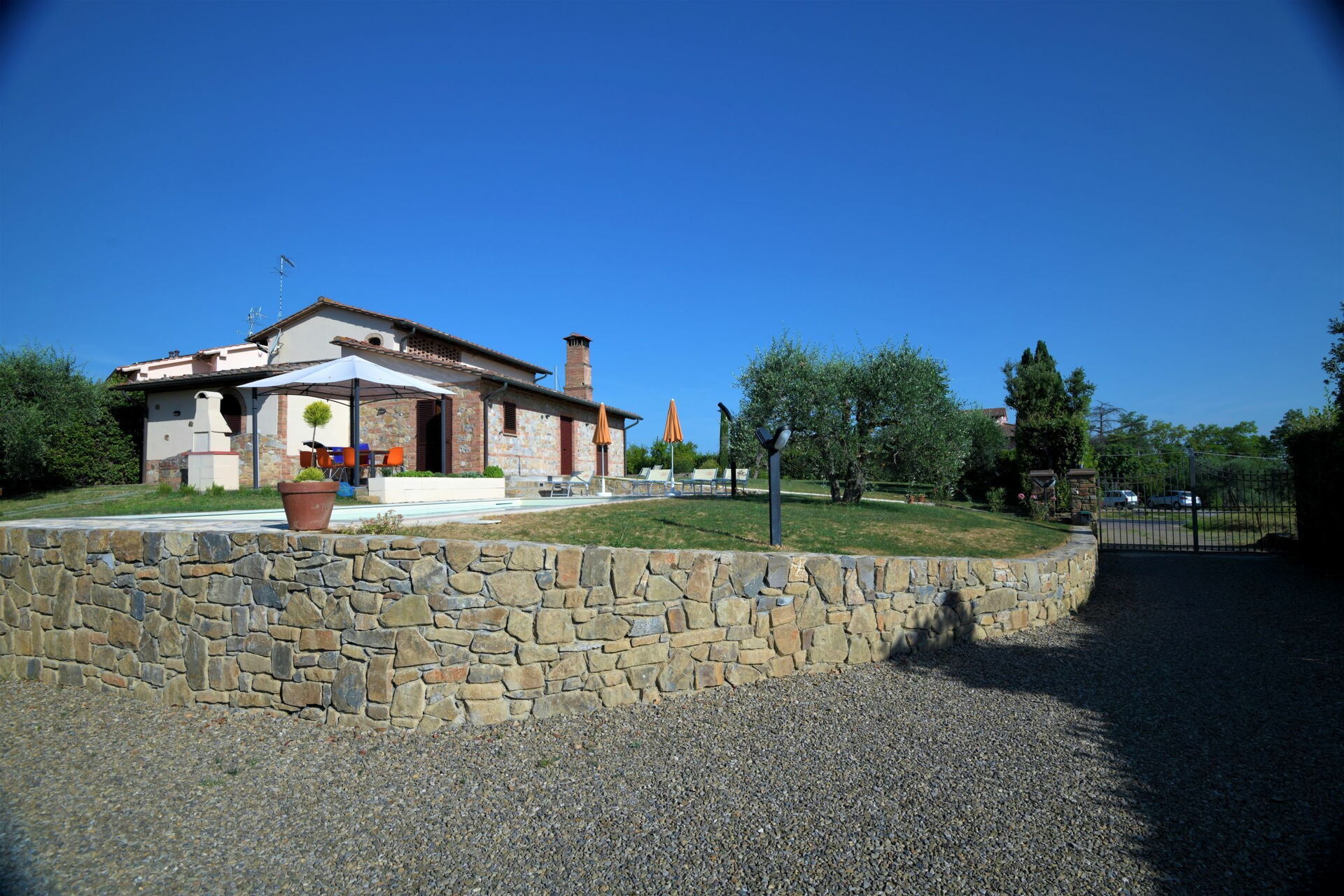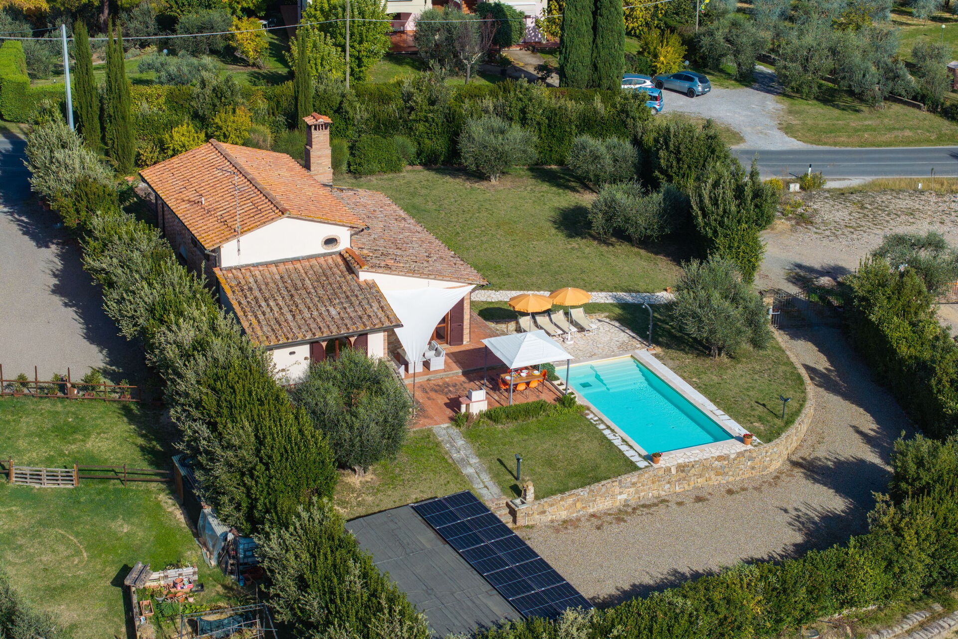 På uteområdet kan gjestene nyte godt av en hage og et splitter nytt basseng (med romerske trapper og et avslapningsområde med en geysir). Fra feriehuset har man utsikt over det vakre landskapet rundt og de berømte tårnene i middelalderbyen San Gimignano. I nærheten av kjøkkenet, mellom huset og bassenget, er det et område møblert med lysthus, bord, stoler og grill.