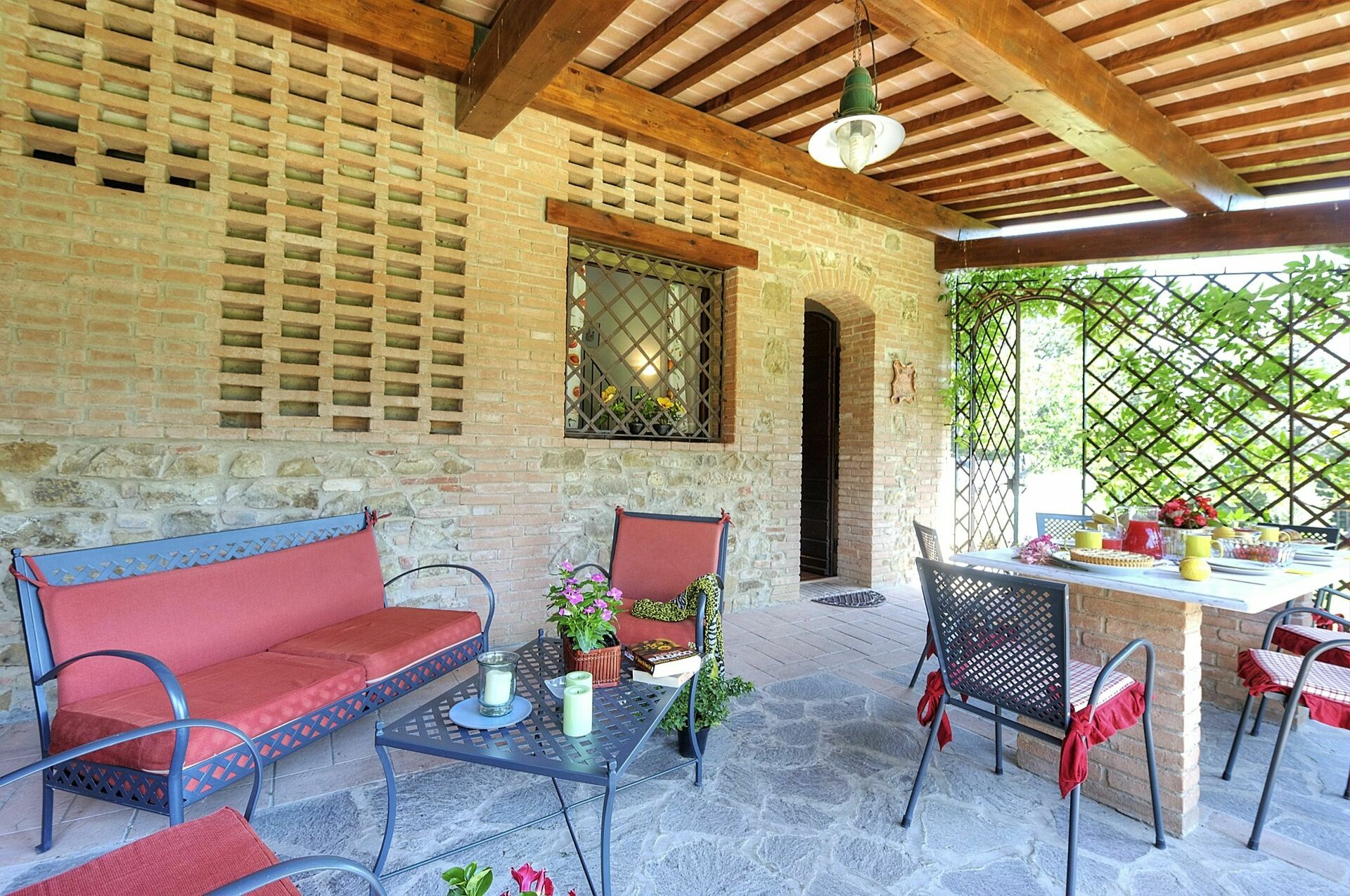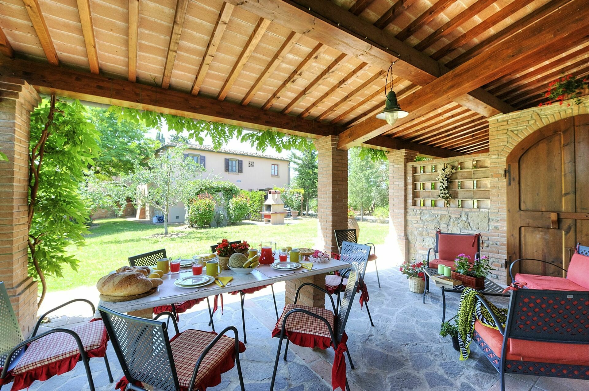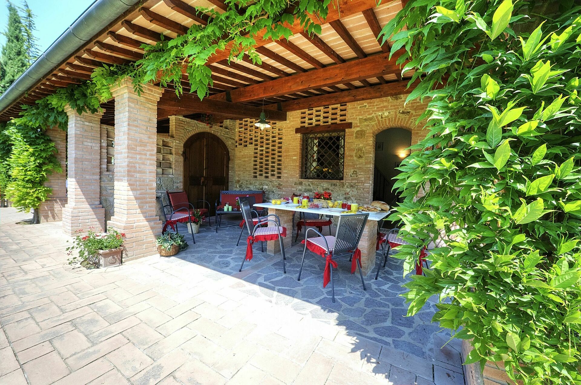 Første etasje (inngang via overbygd terrasse møblert med bord og stoler):