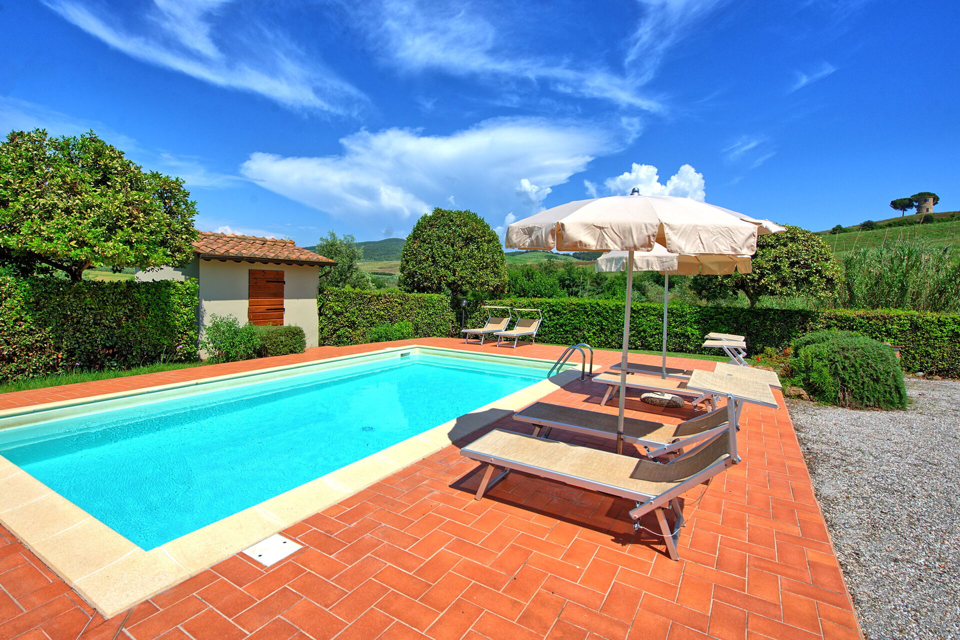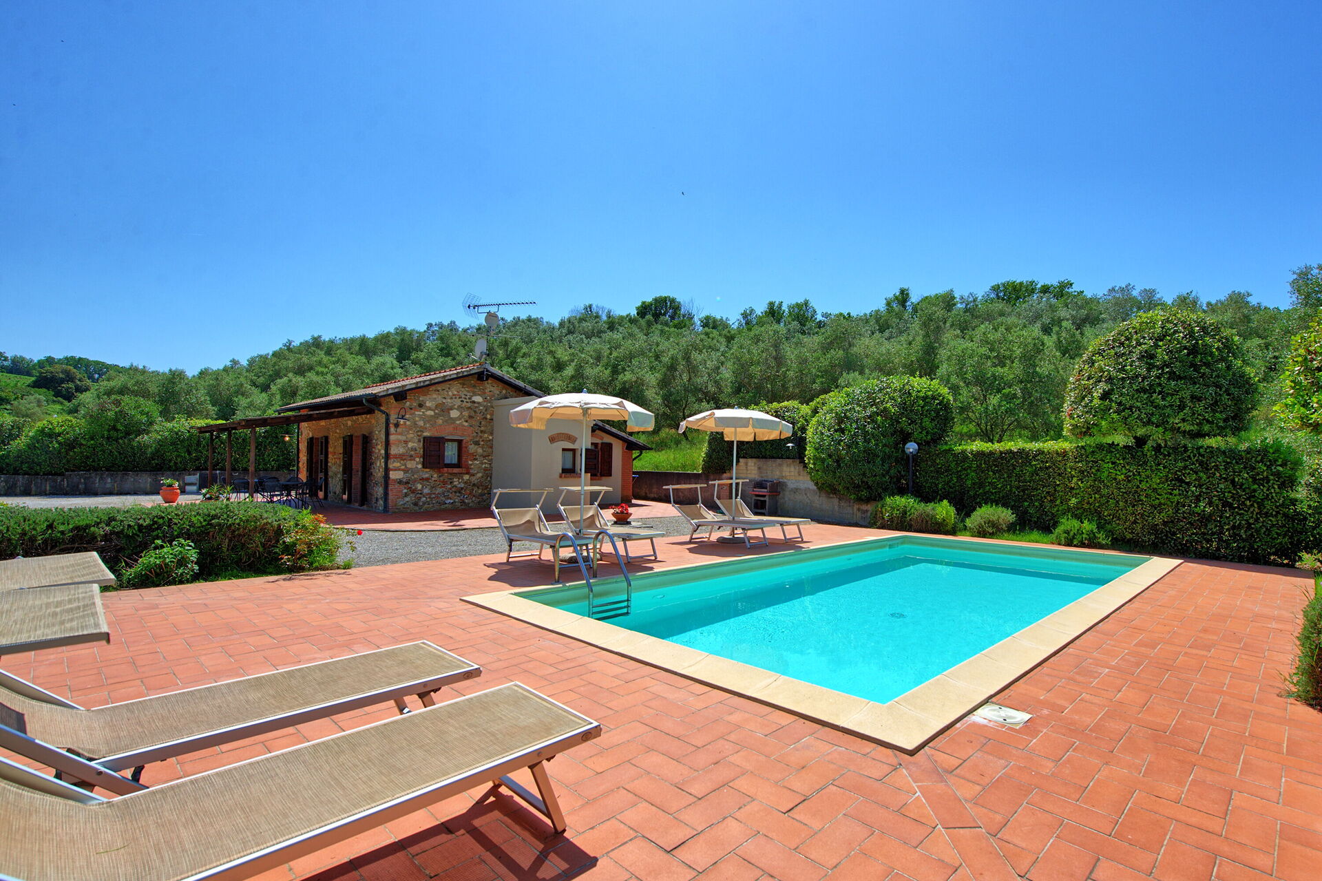 Pent feriehus i med privat basseng nær Bolgheri i Toscana. Huset er ideelt for dem som ønsker en avslappende ferie i vakre omgivelser. Eiendommen ligger usjenert til nær Bibbona på den tyrrenske kysten. Kystlinjen i Toscana og øyene utenfor, er kjent for sin rike natur, historie og kulinariske opplevelser.