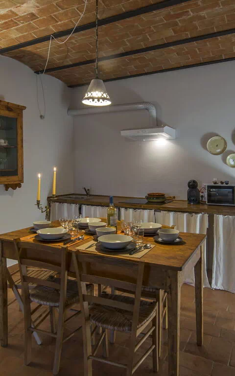 Privat uteområde under en loggia utstyrt med bord og stoler.