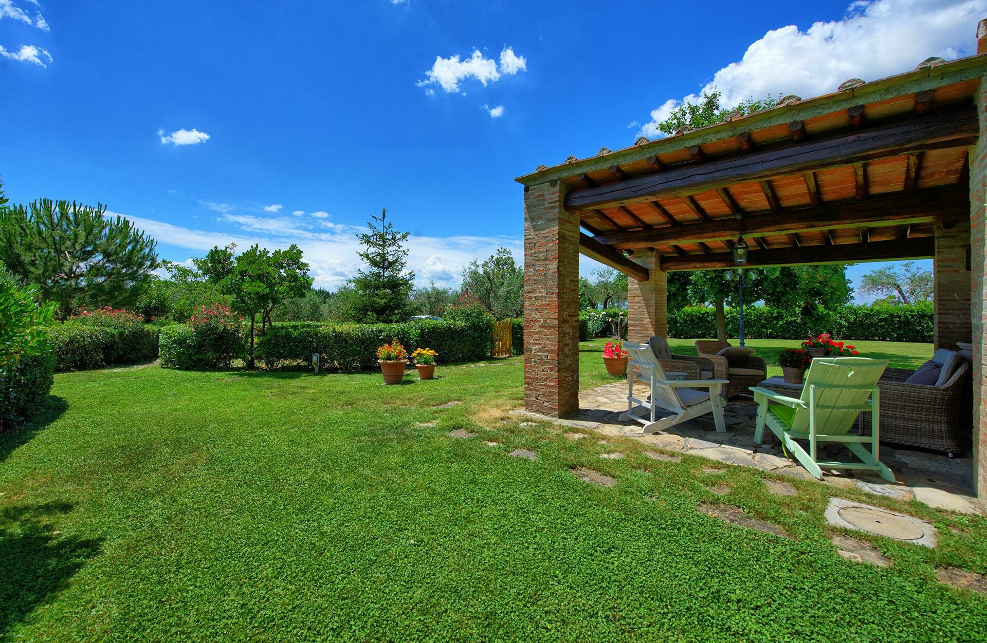 Svømmebassenget er omgitt av et vakkert hageområde med rikelig plass. Villa Sonia er et perfekt sted for en uforglemmelig ferie i Toscana.