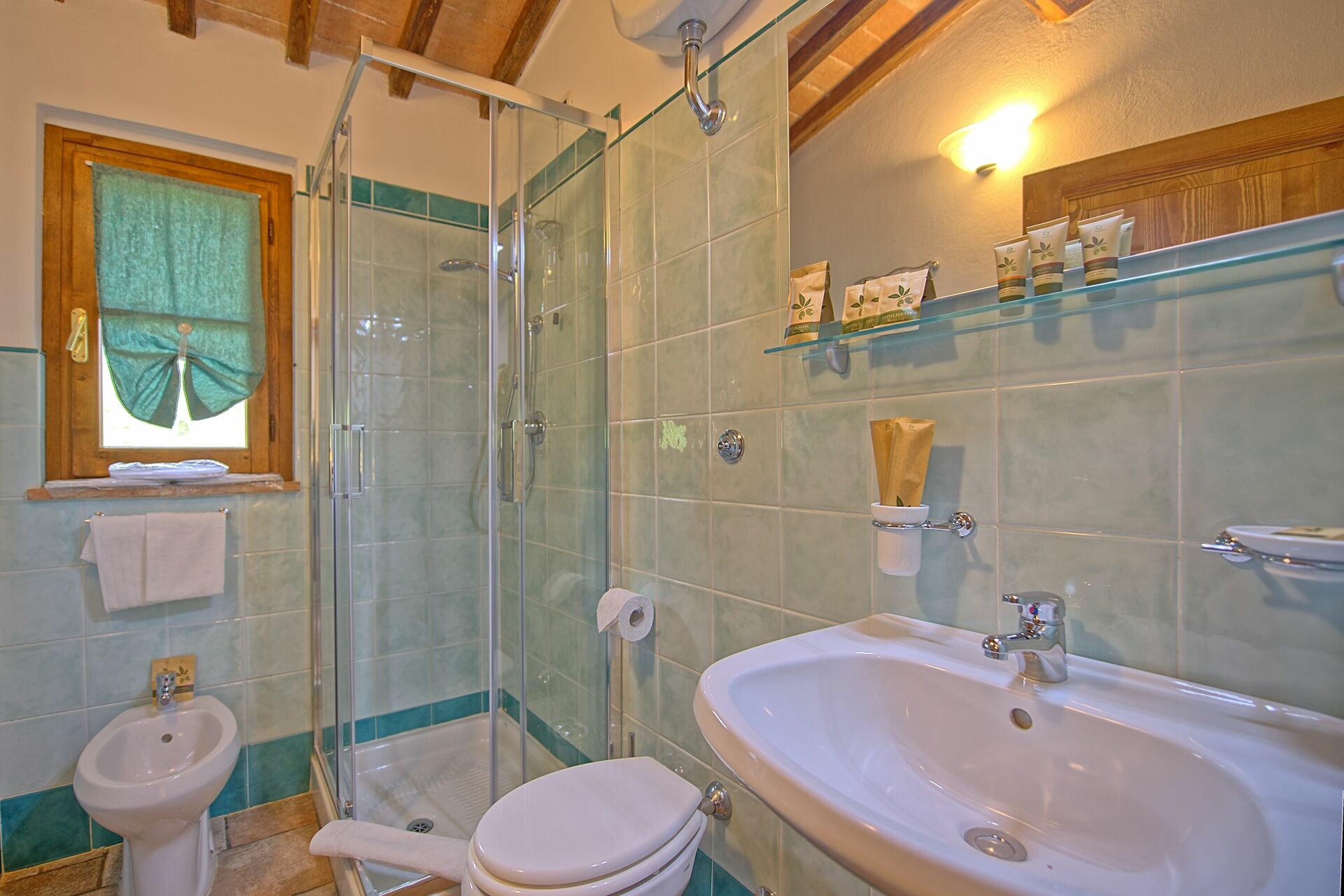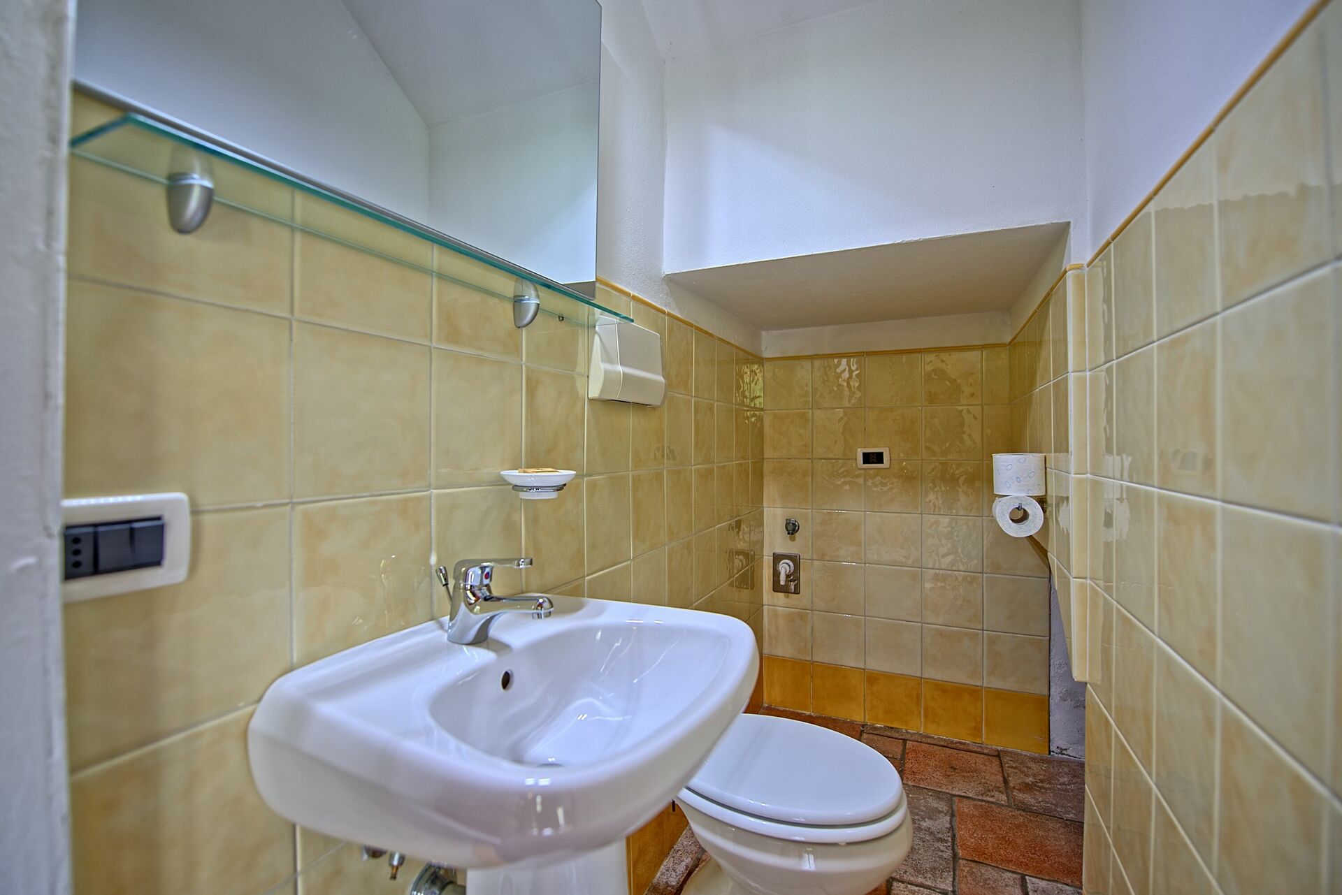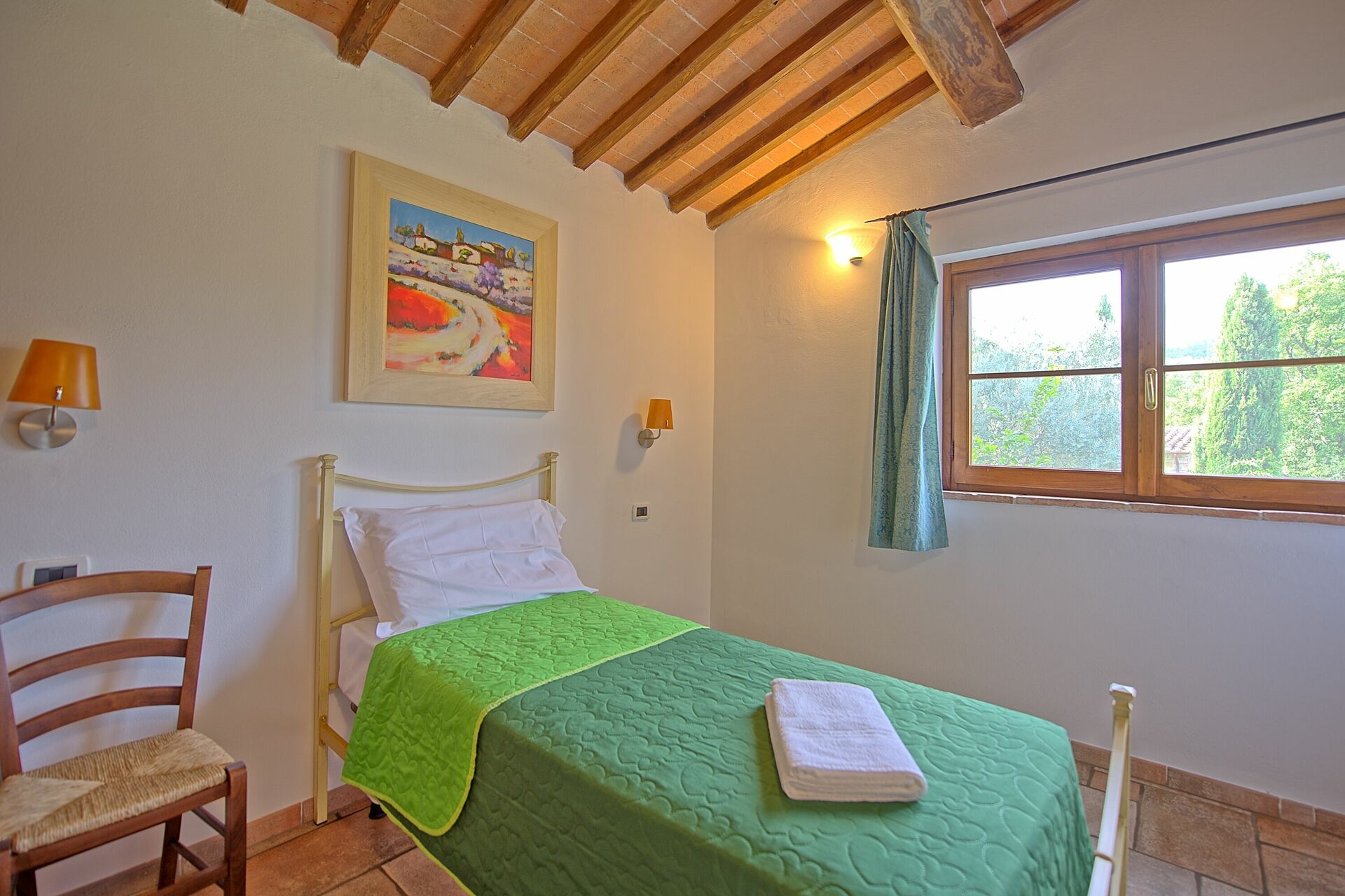 Andre etasje: gang med utgang til uteområdene, dobbelt soverom, bad med dusj, soverom med en enkeltseng.