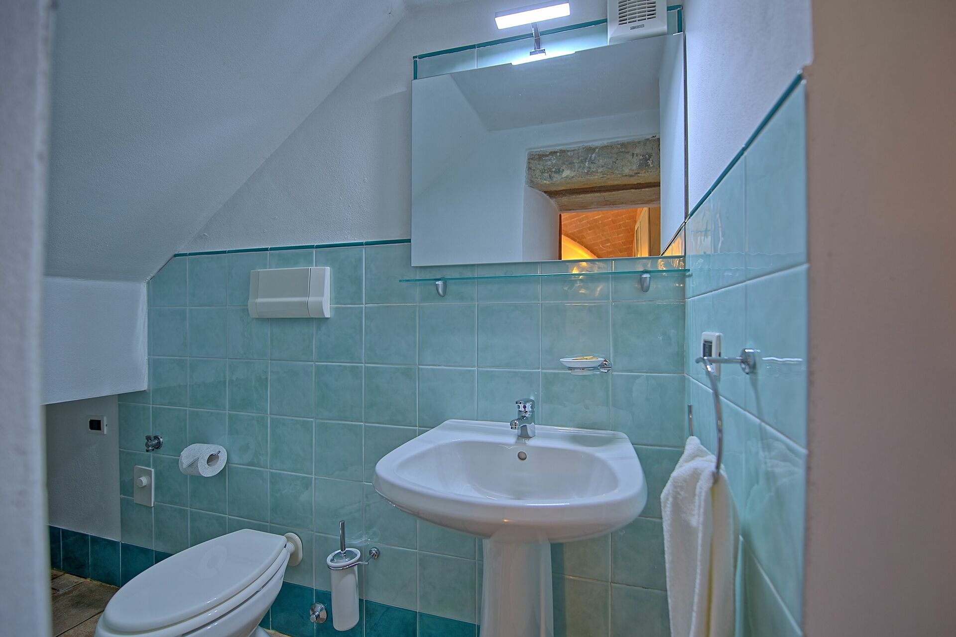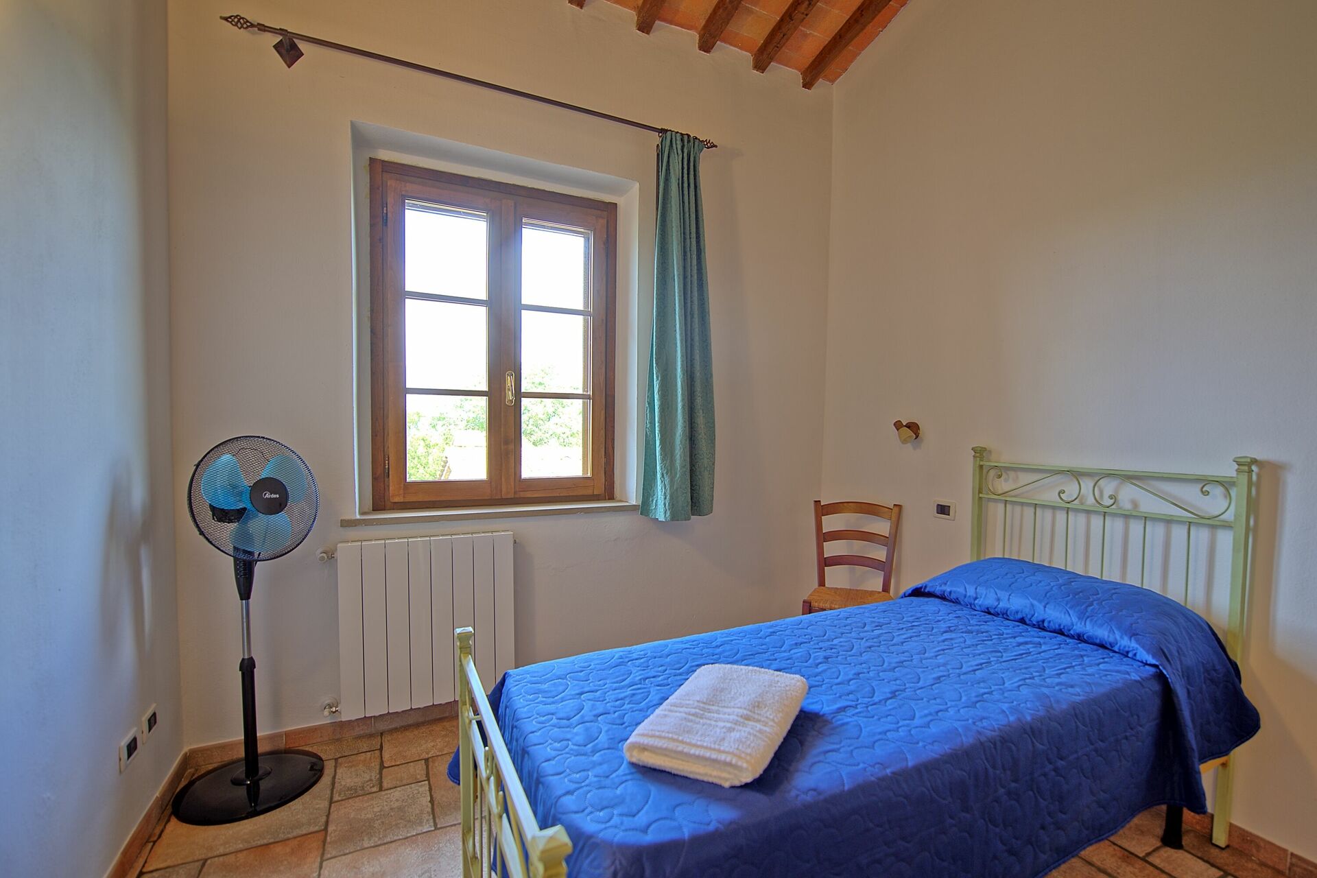 Andre etasje: gang med utgang til uteområdene, dobbelt soverom, bad med dusj, soverom med en enkeltseng.