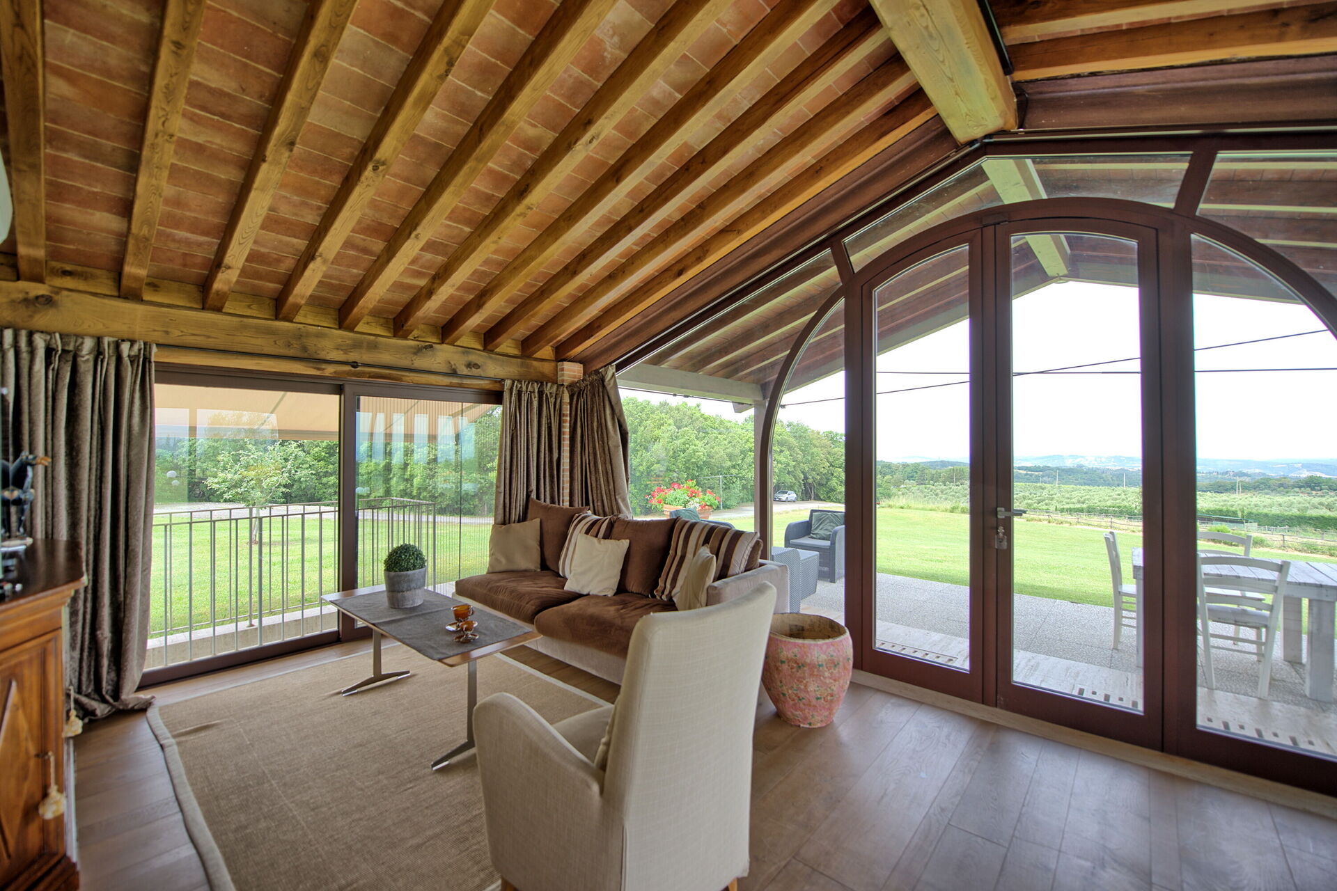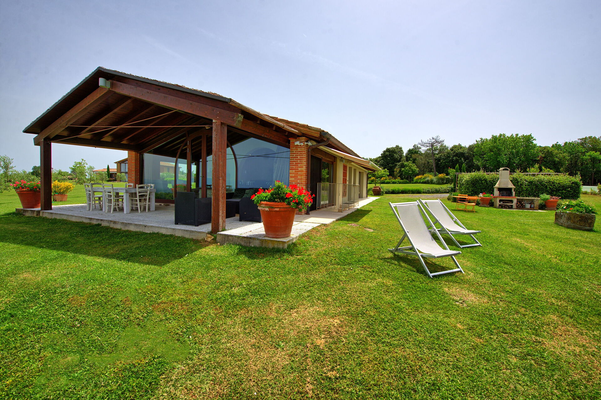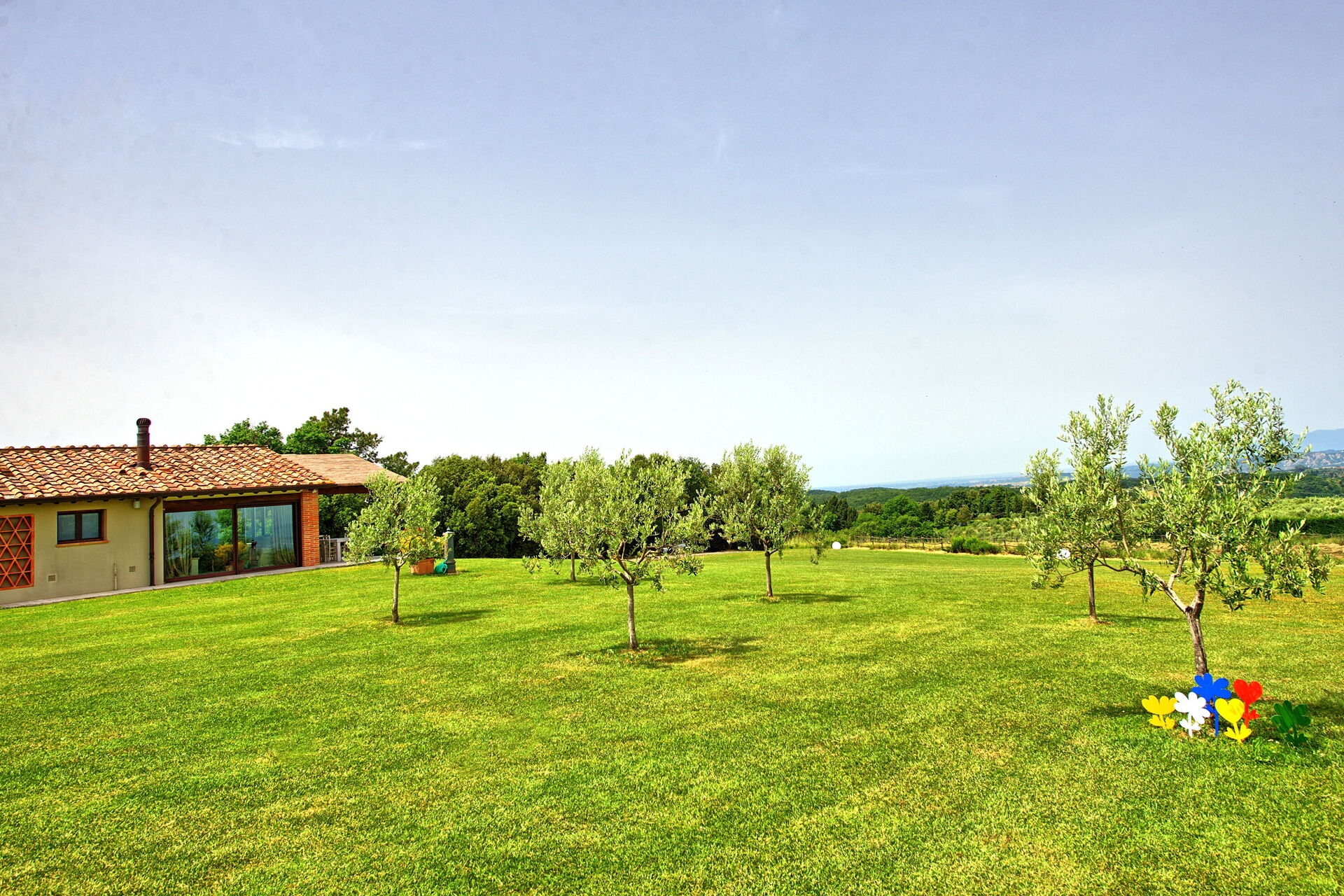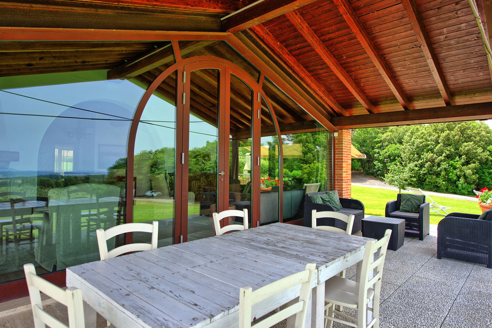 Fra stuen er det utgang til en veranda med panoramautsikt utstyrt med bord og stoler for måltider utendørs; grill og stor hage.