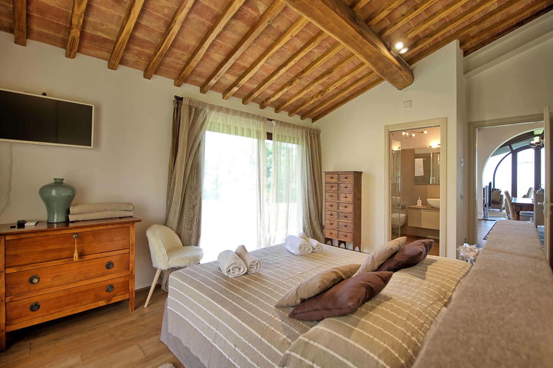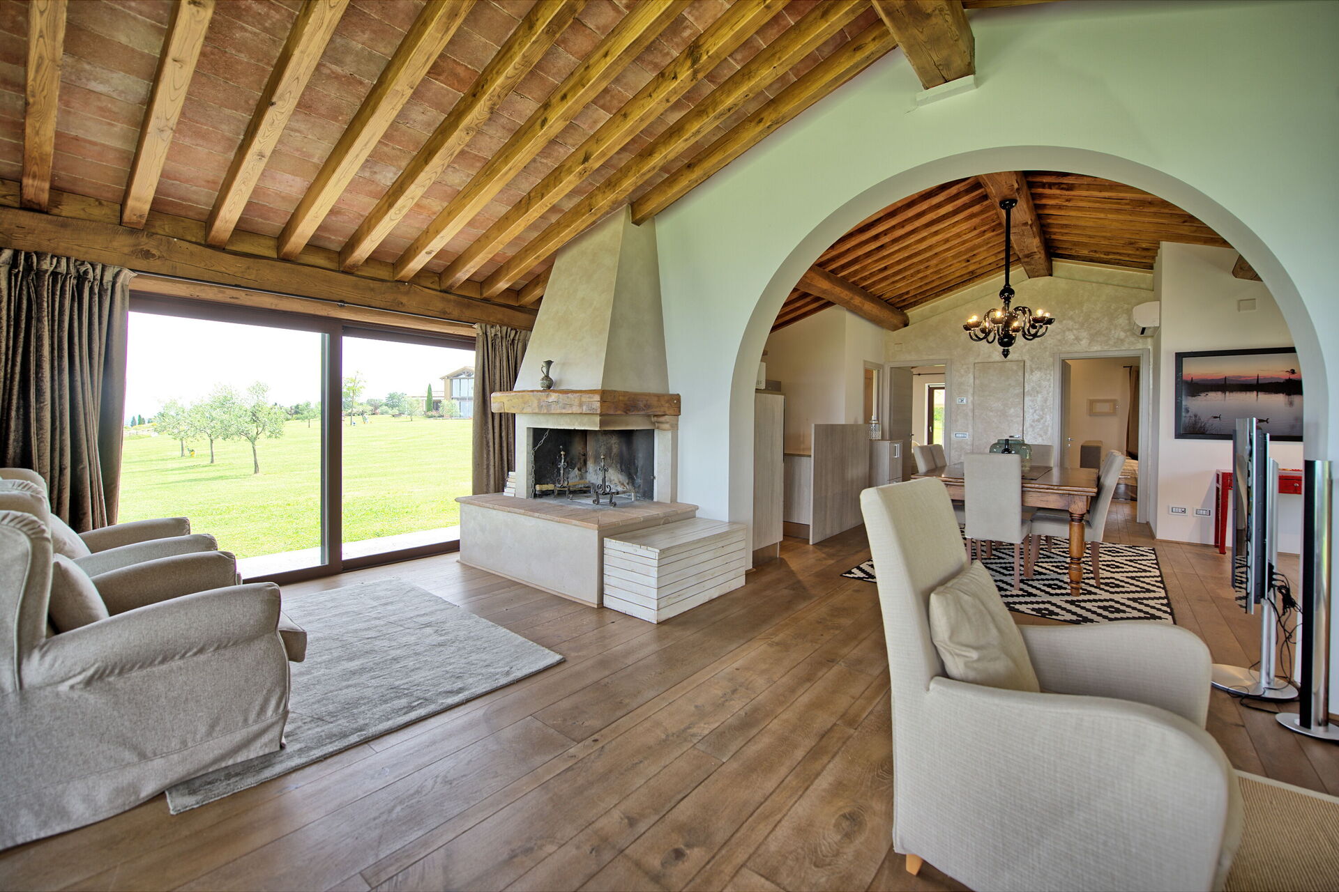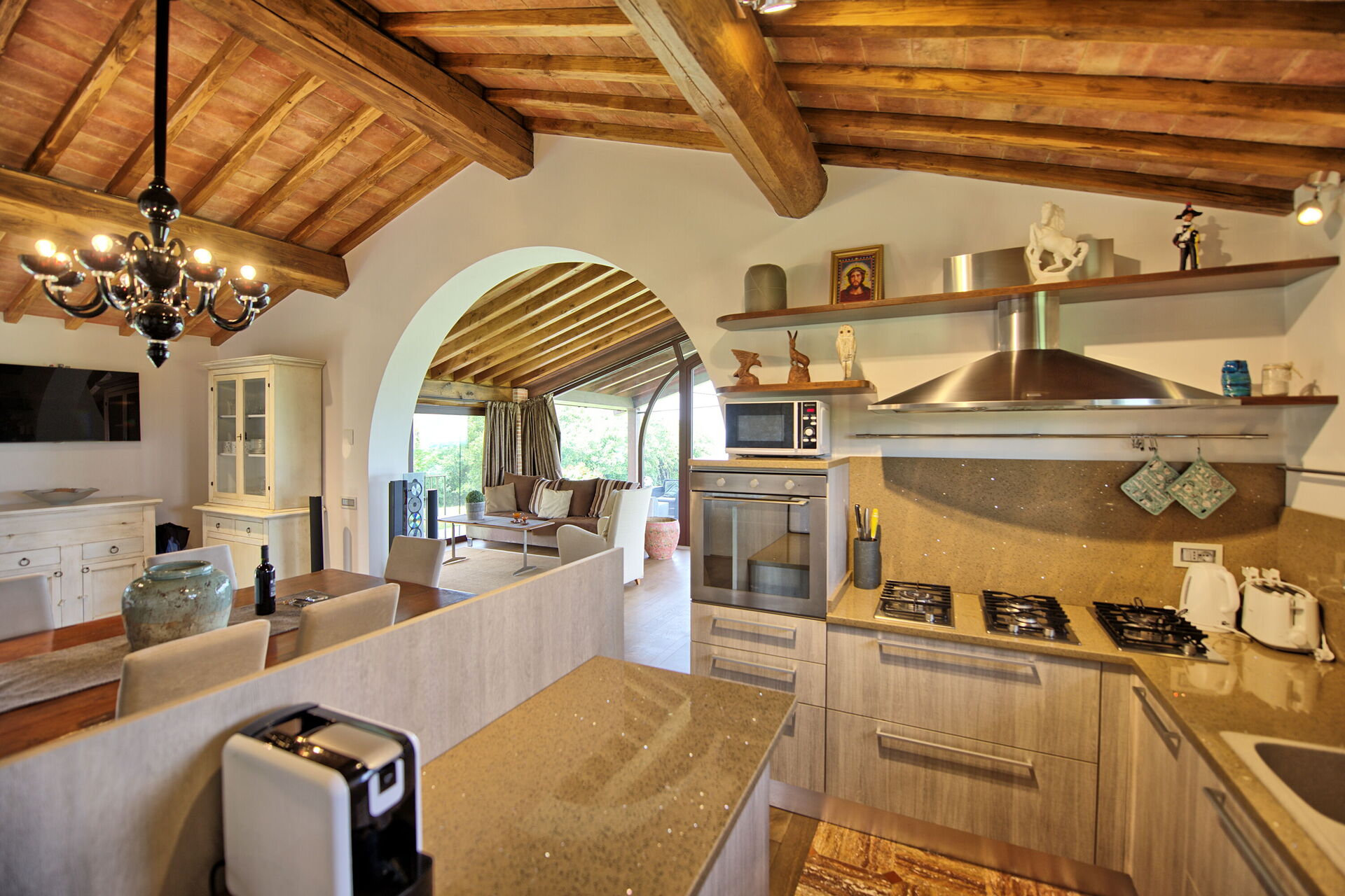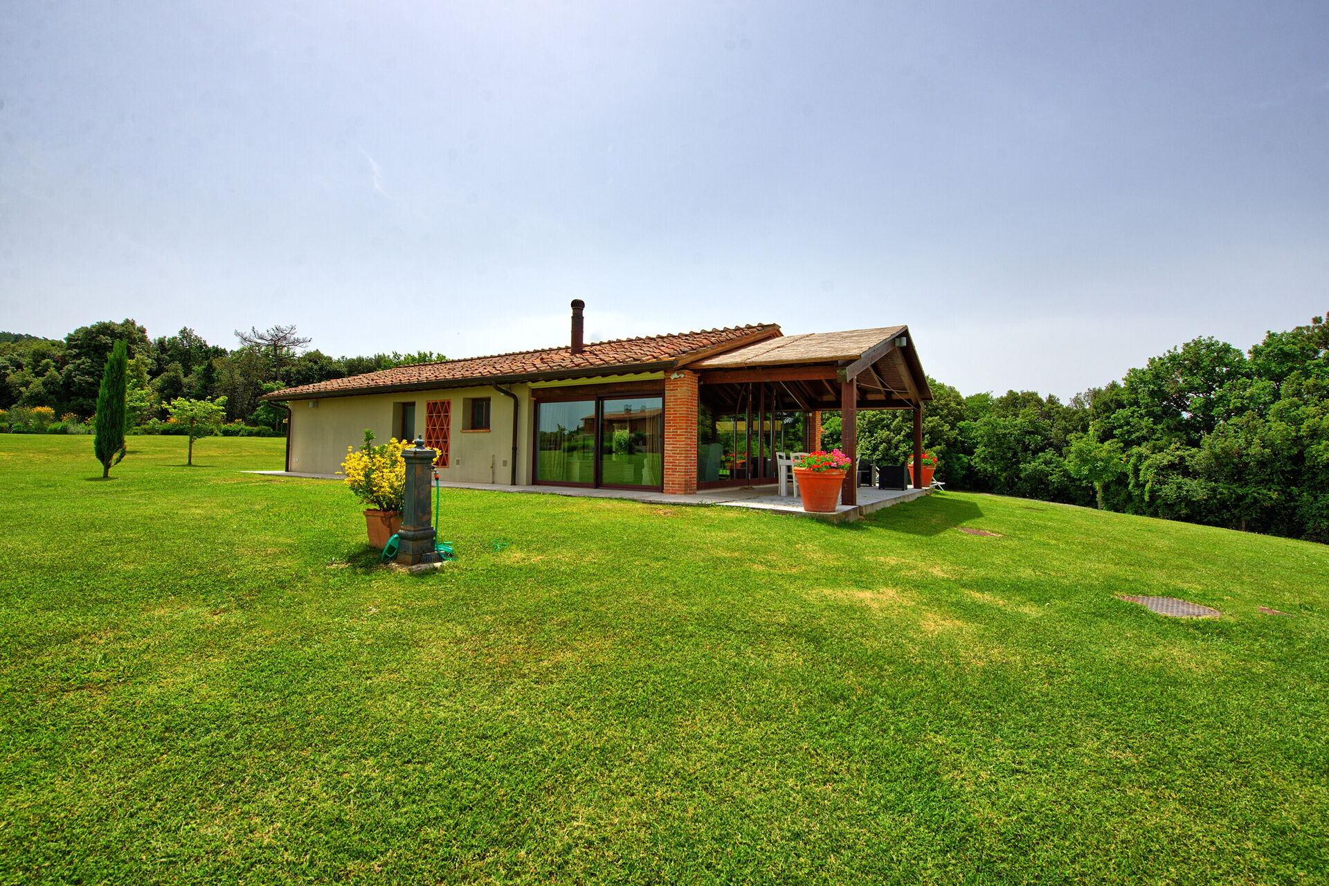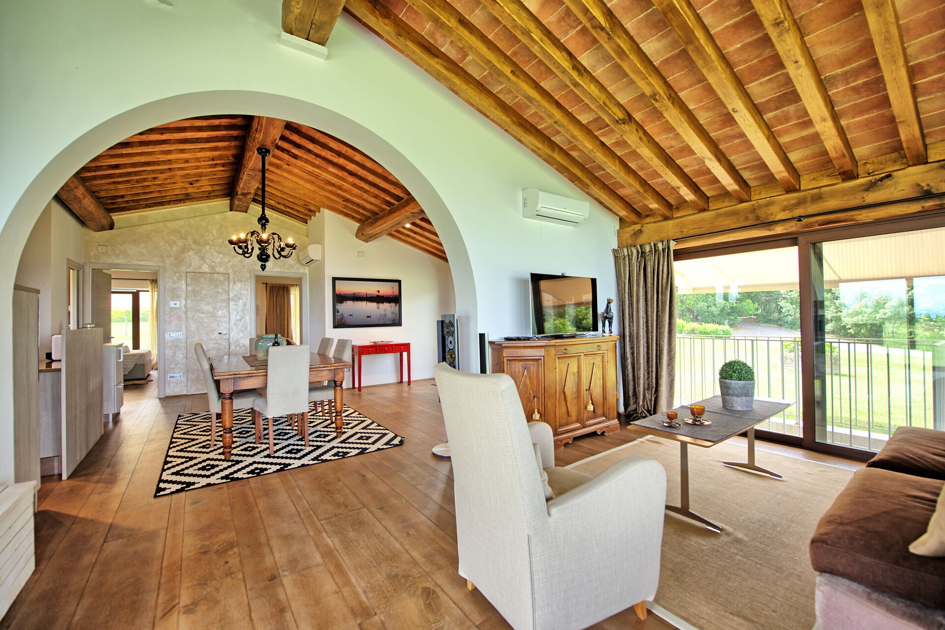 Fra stuen er det utgang til en veranda med panoramautsikt utstyrt med bord og stoler for måltider utendørs; grill og stor hage.