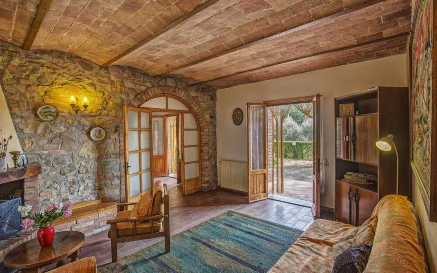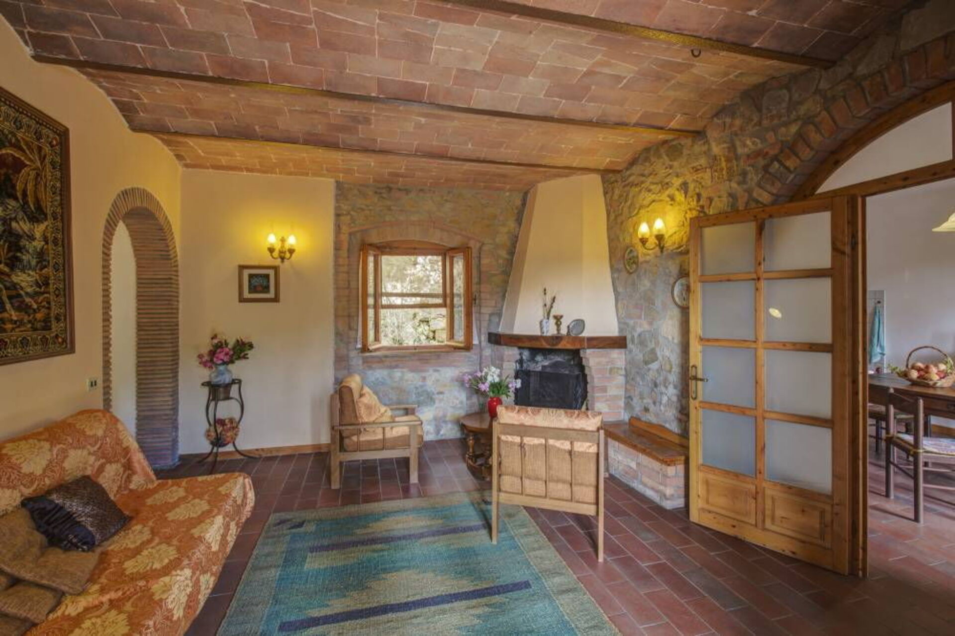 Stue med peis og dobbel sovesofa, spiseplass med kjøkken (oppvaskmaskin, stekeovn, brødrister, espressomaskin og kaffetrakter), 1 dobbeltrom (på forespørsel kan sengen deles i 2 enkeltsenger), bad med dusj