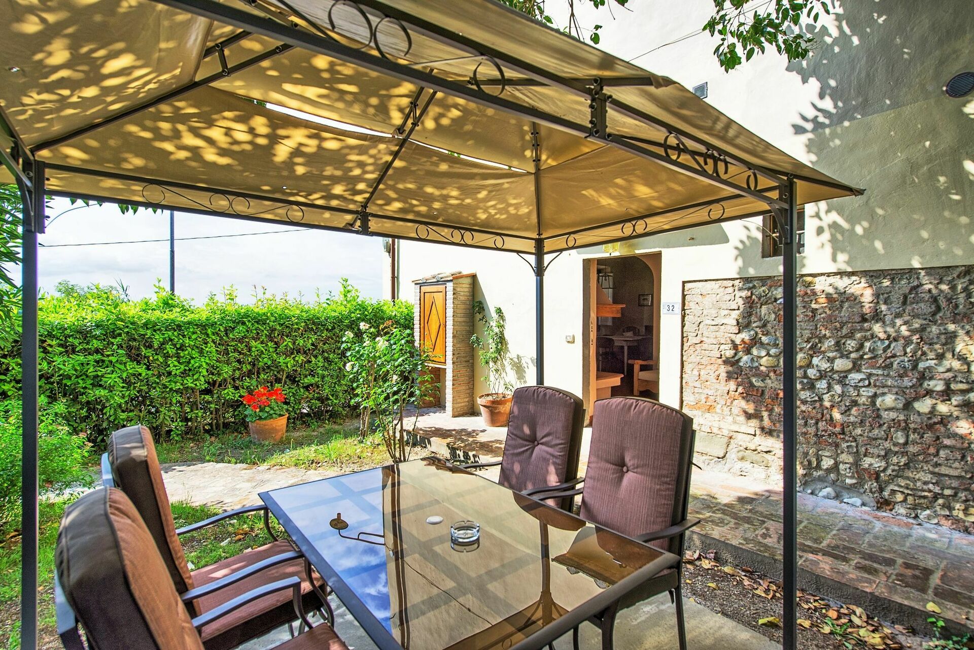 Personlig, møblert uteområde med lysthus, bord og stoler