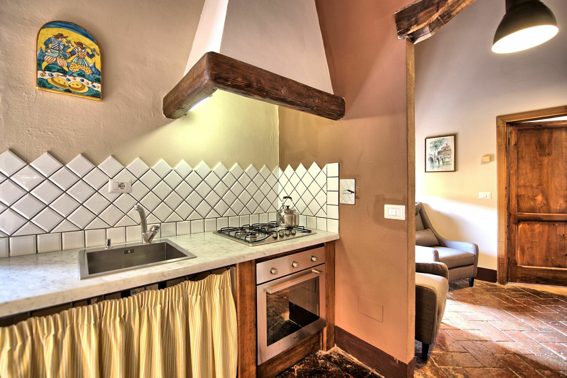 The old castello, the yards and the garden are really stunning. Also the view from the terrace overlooking the area is breathtaking. The bedrooms in the apartement are clean and tastefully furnished with respect for the history of the place, while the kitchen is rather dark. We stayed during a heatwave in July and beforehand we were nervous that there was no aircon, but the staff in the reception was really kind to provide us with several fans that worked surpricingly well during the hot nights. Remember to bring toiletpaper, soap, dishwasher soap, exstra dish cloths, salt/pepper etc. We didn’t know that, but again the staff helped us out untill we could drive to a supermarket.