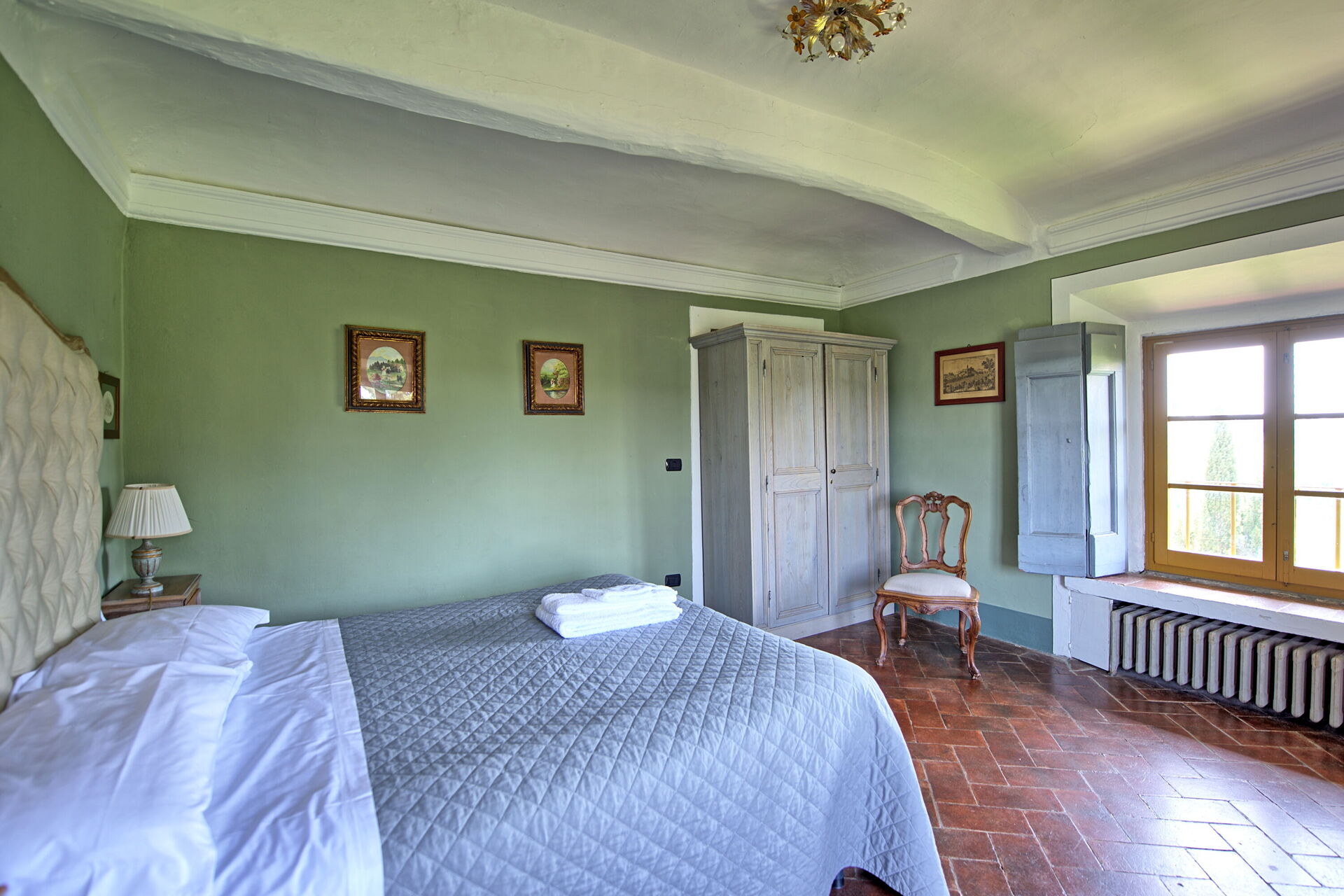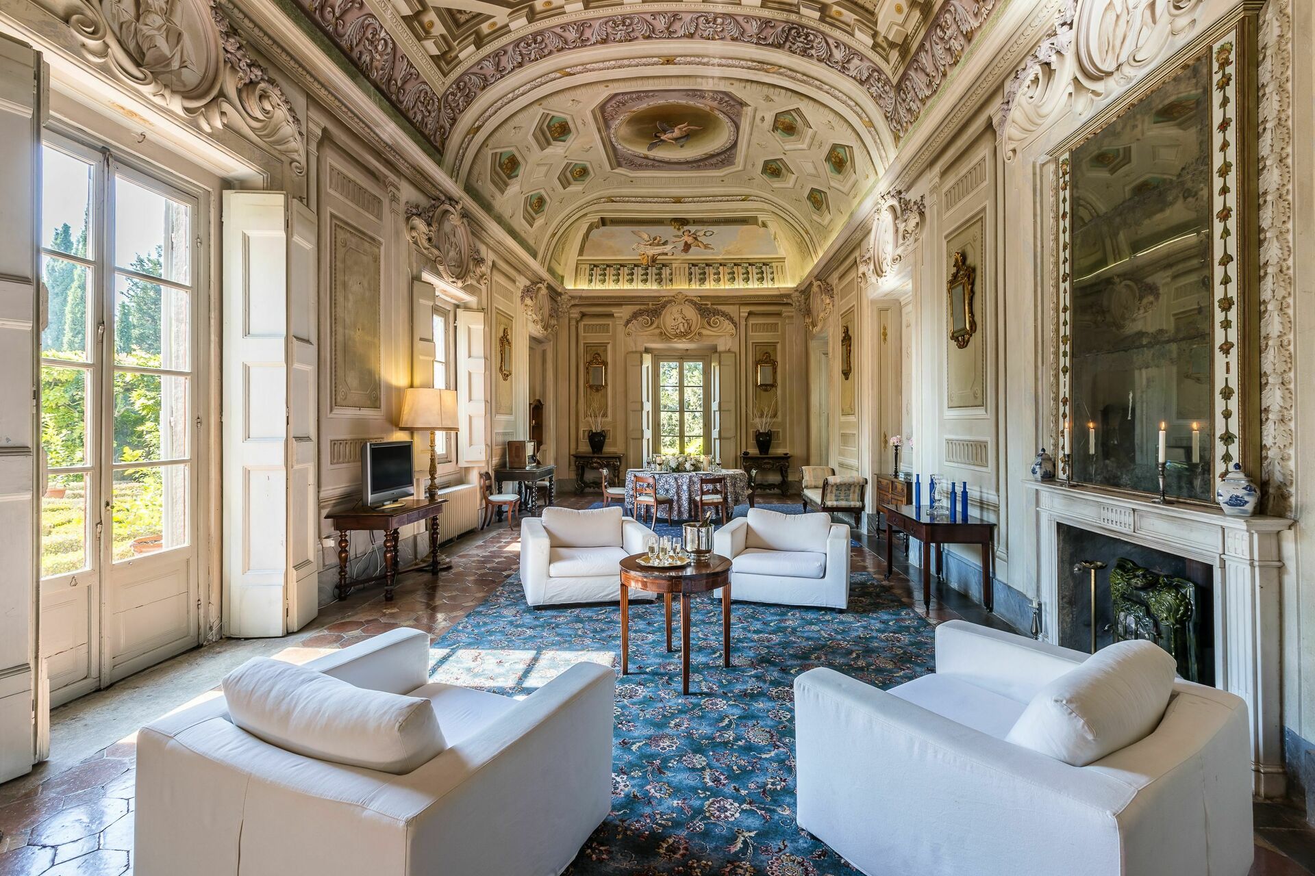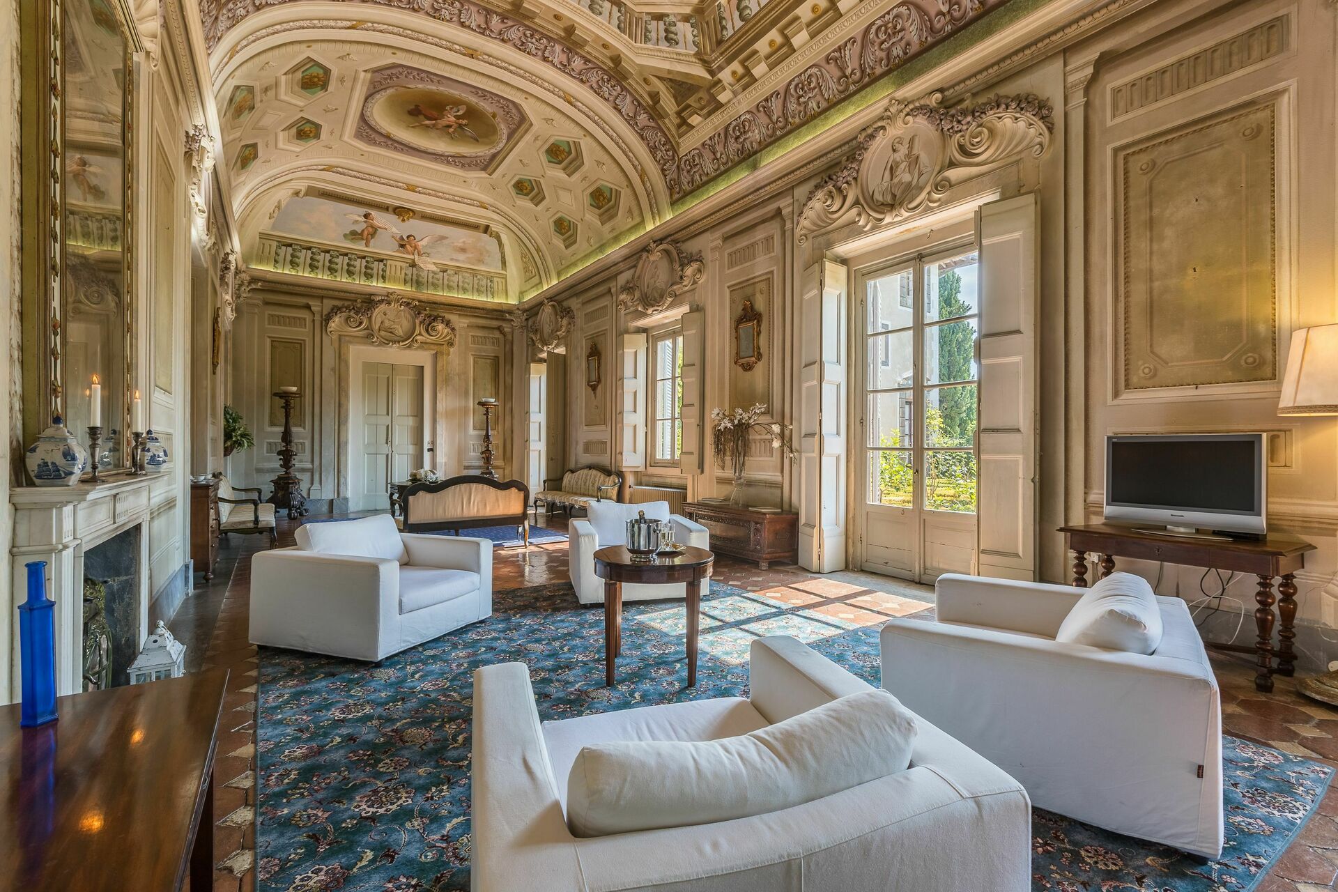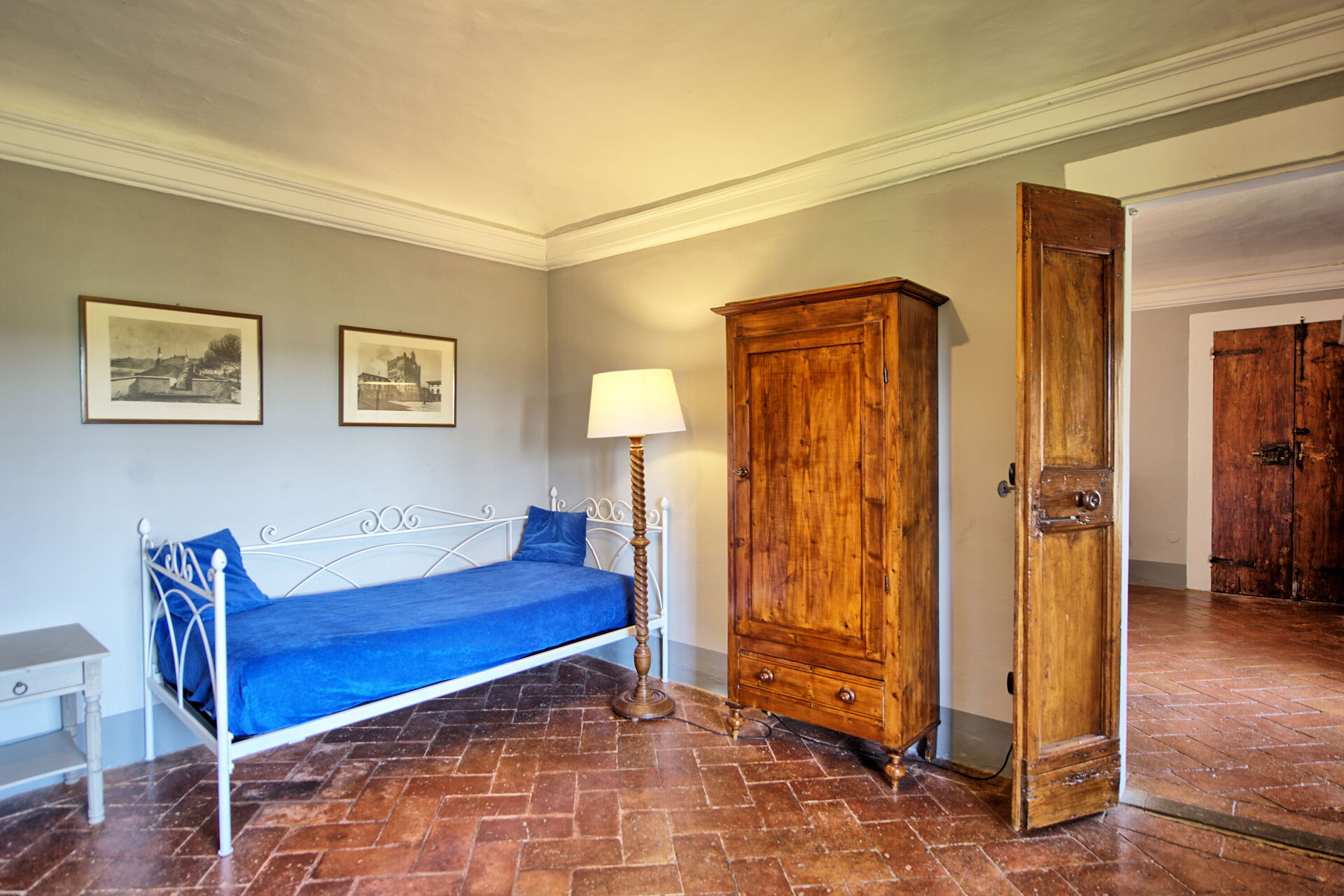 Stor inngang brukt som "salg d'armes", romslig og lys stue med vakre fresker i himling, peis (ikke brukbar) med fresker av Pucci fra år 1700, 6 store franske vinduer og utsyn til den sjarmerende italienske hagen, bad med dusj.