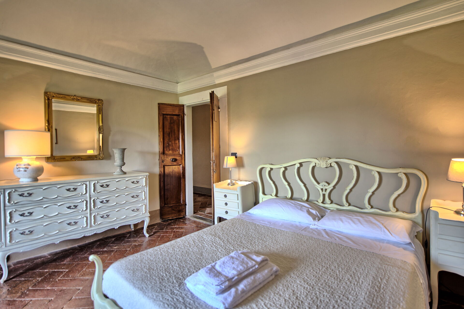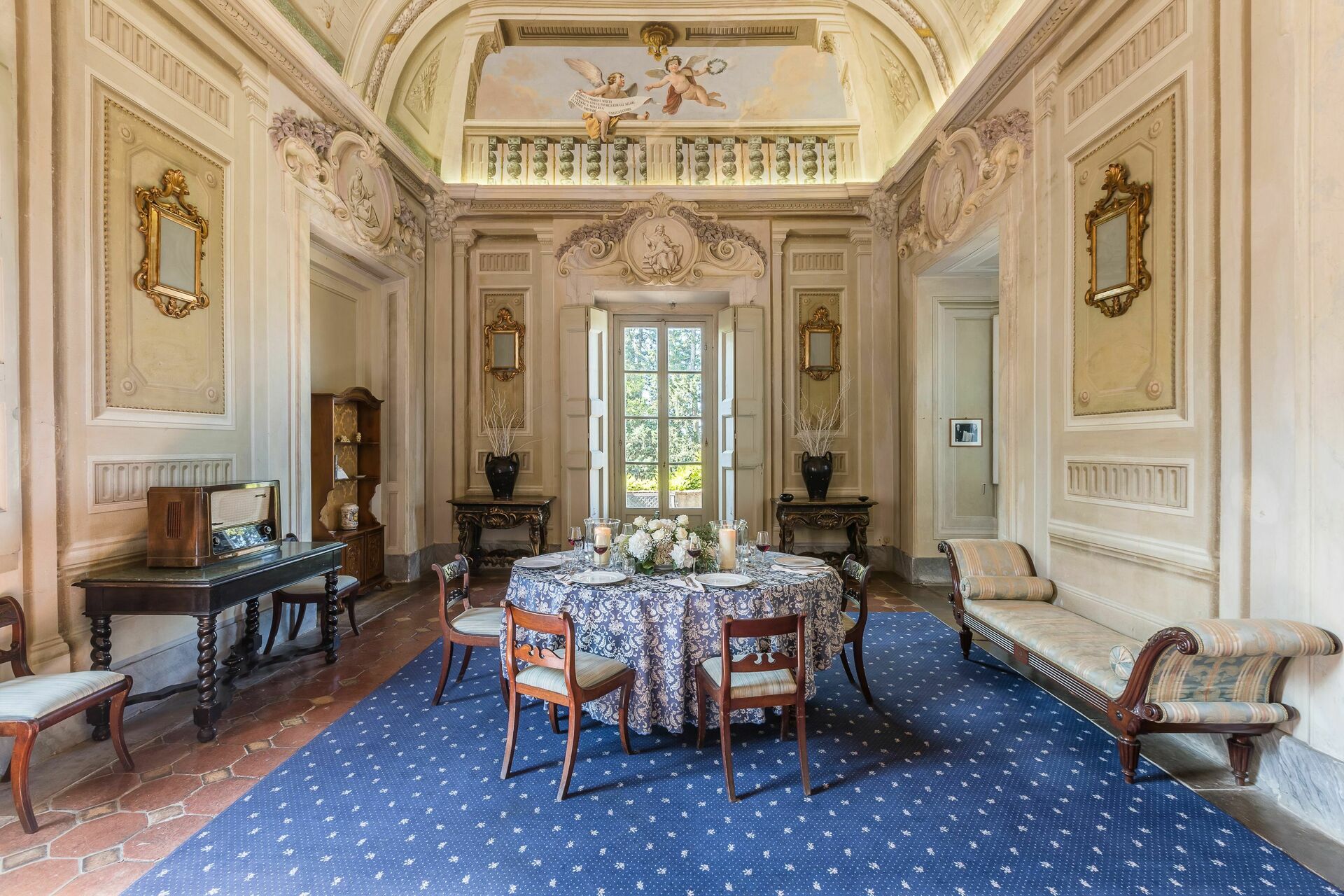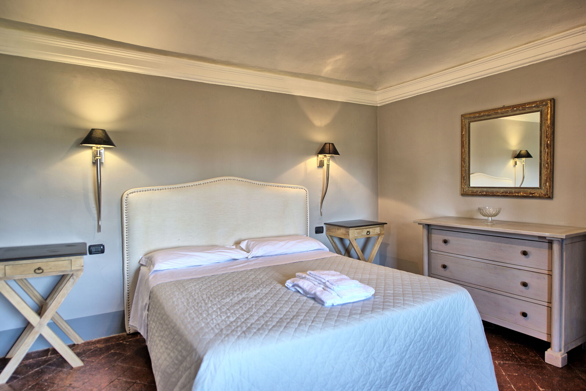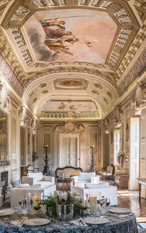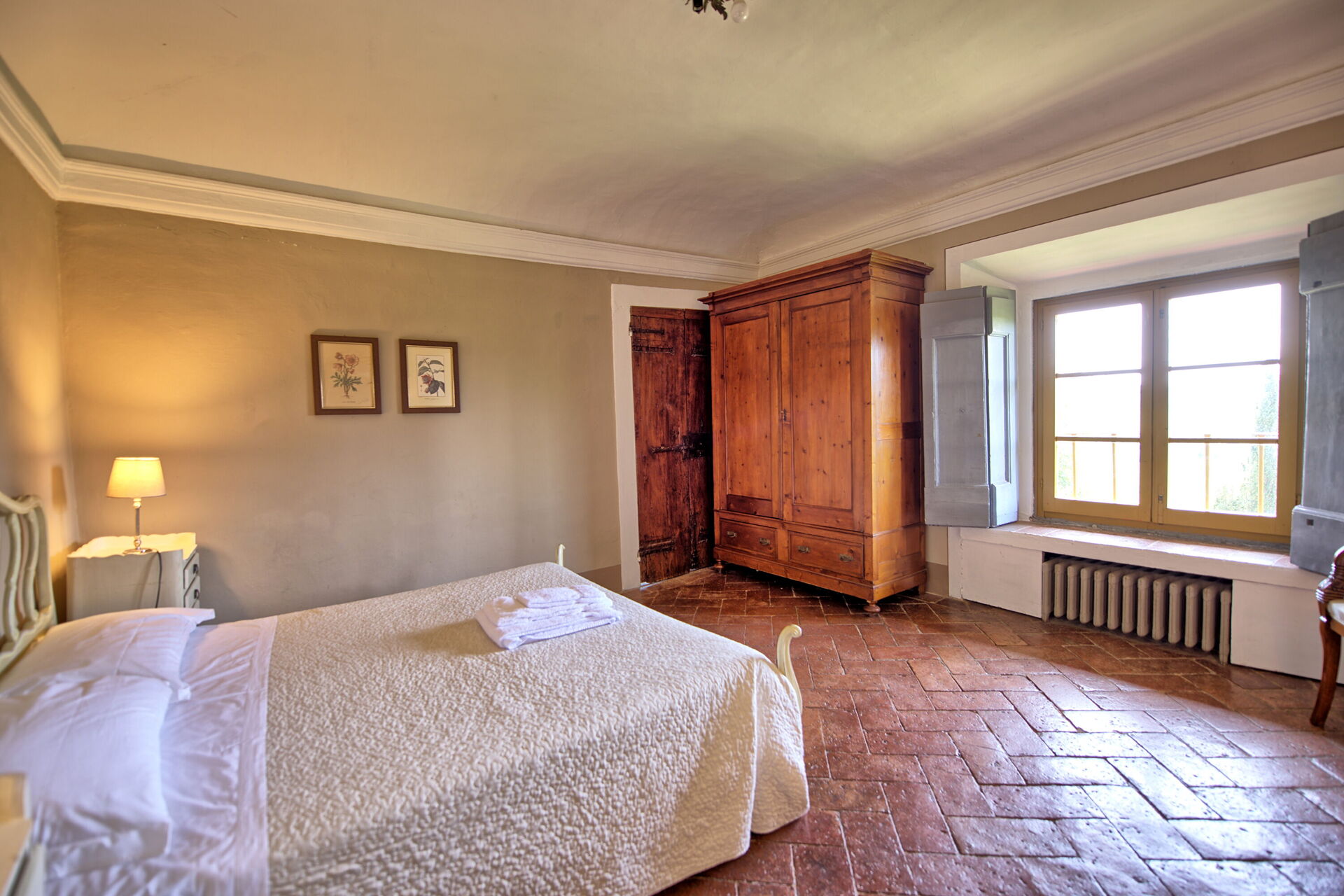 Stor inngang brukt som "salg d'armes", romslig og lys stue med vakre fresker i himling, peis (ikke brukbar) med fresker av Pucci fra år 1700, 6 store franske vinduer og utsyn til den sjarmerende italienske hagen, bad med dusj.