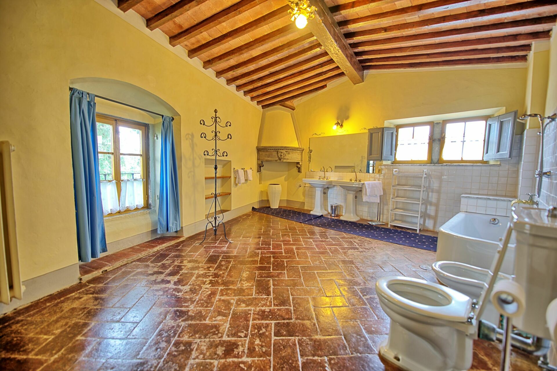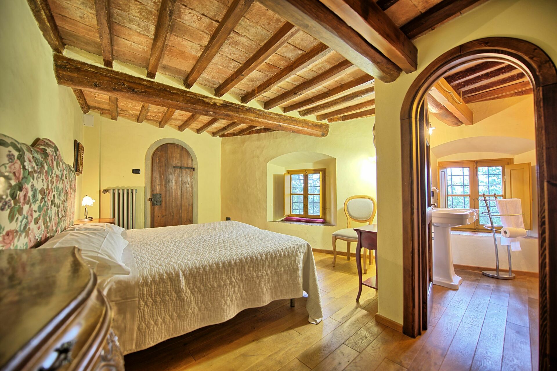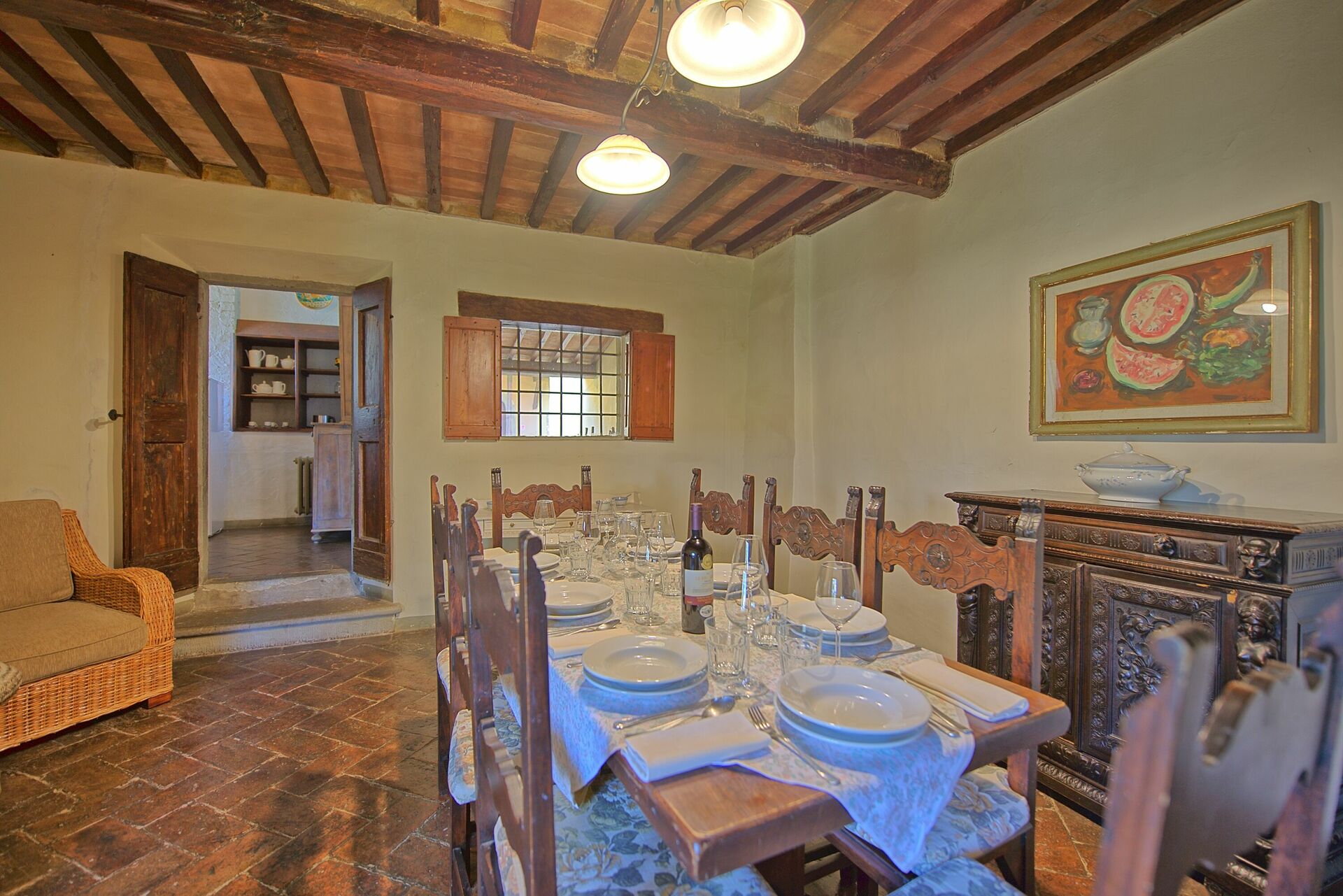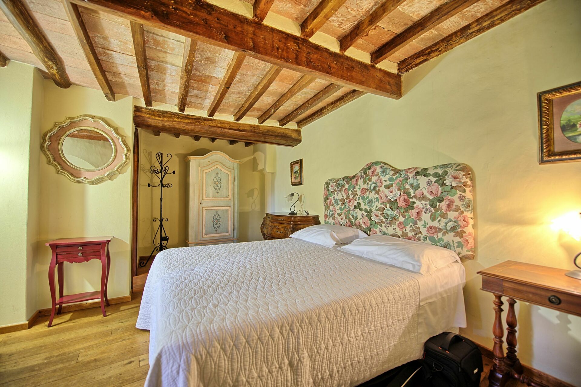 Stor inngang brukt som "salg d'armes", romslig og lys stue med vakre fresker i himling, peis (ikke brukbar) med fresker av Pucci fra år 1700, 6 store franske vinduer og utsyn til den sjarmerende italienske hagen, bad med dusj.