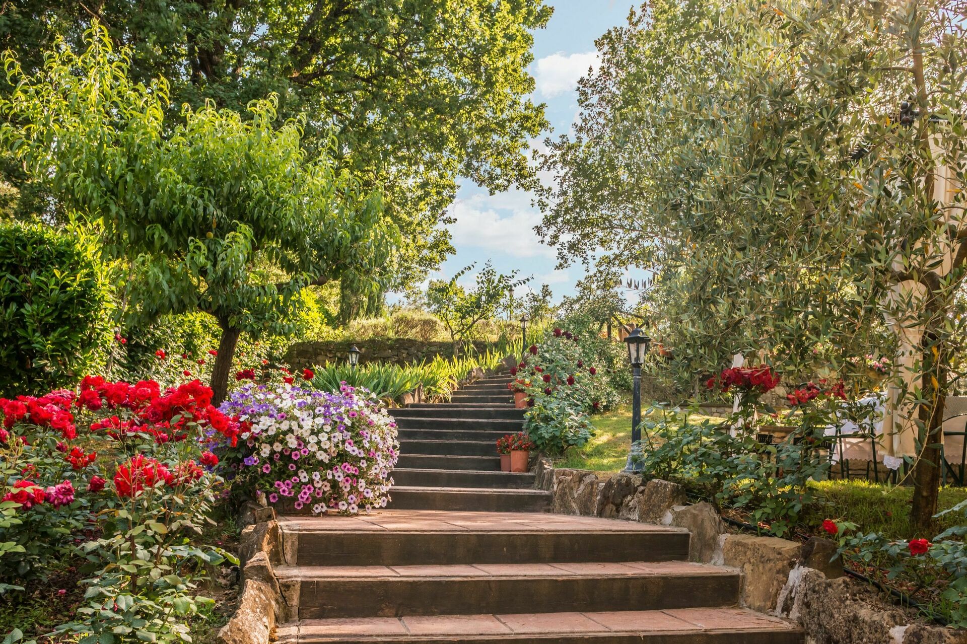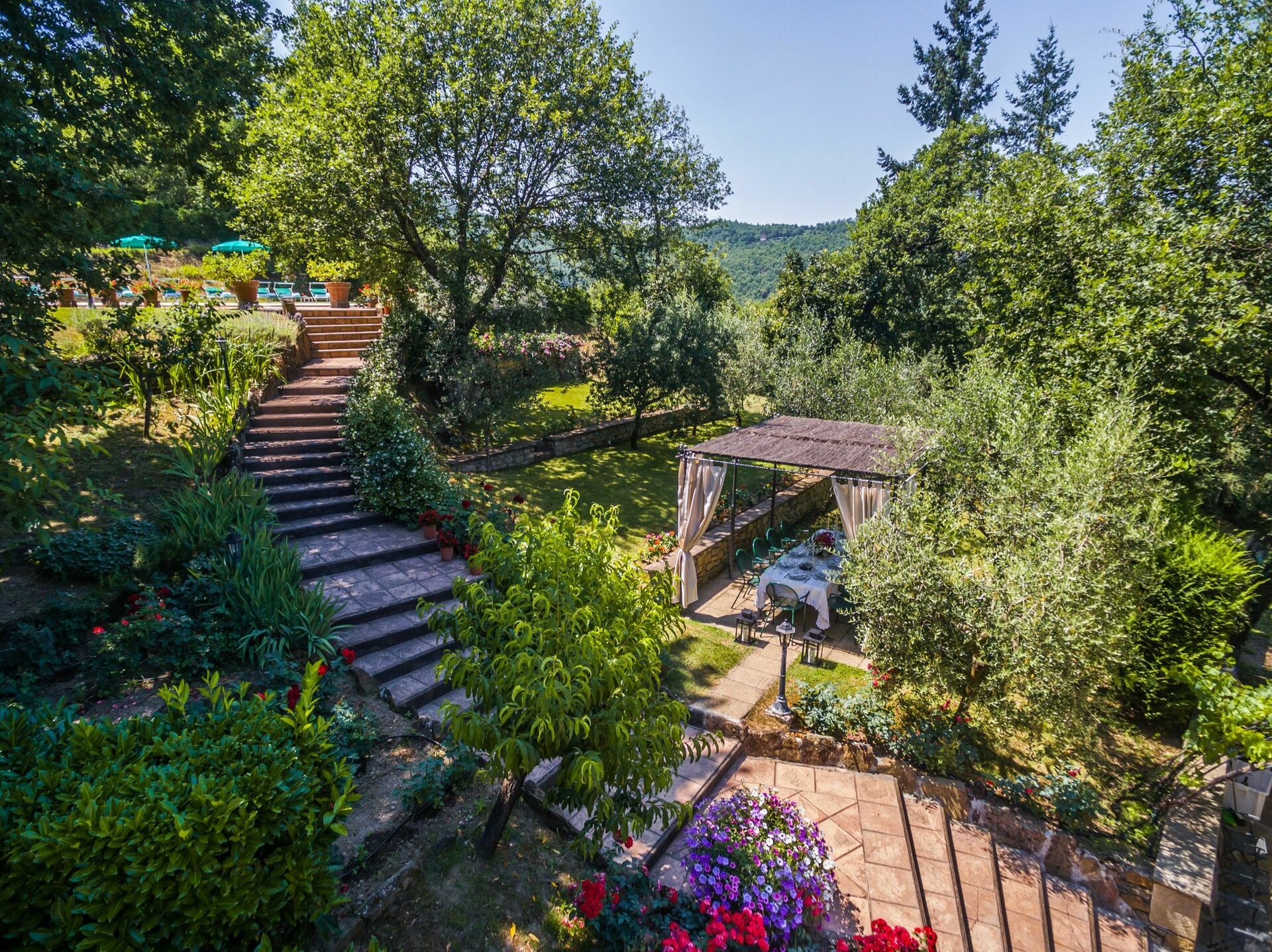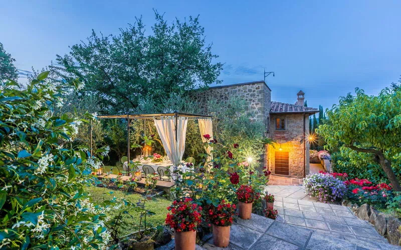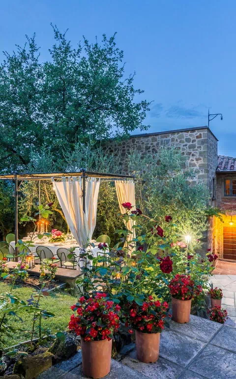 I hagen på et nivå over huset finner man et nytt basseng (12 x 6 m dybde 1,5m, som er åpen fra 1. mai til 1. oktober) og vakre planter som roser, lavendel, jasmin, med sypresser og oliventrær. På bassengområdet finner man også et stor lysthus, bord, stoler og grill. Her kan man nyte utendørs måltider med middelalderbyen Monterchi og de frodige grønne toskanske åsene som et bakteppe.