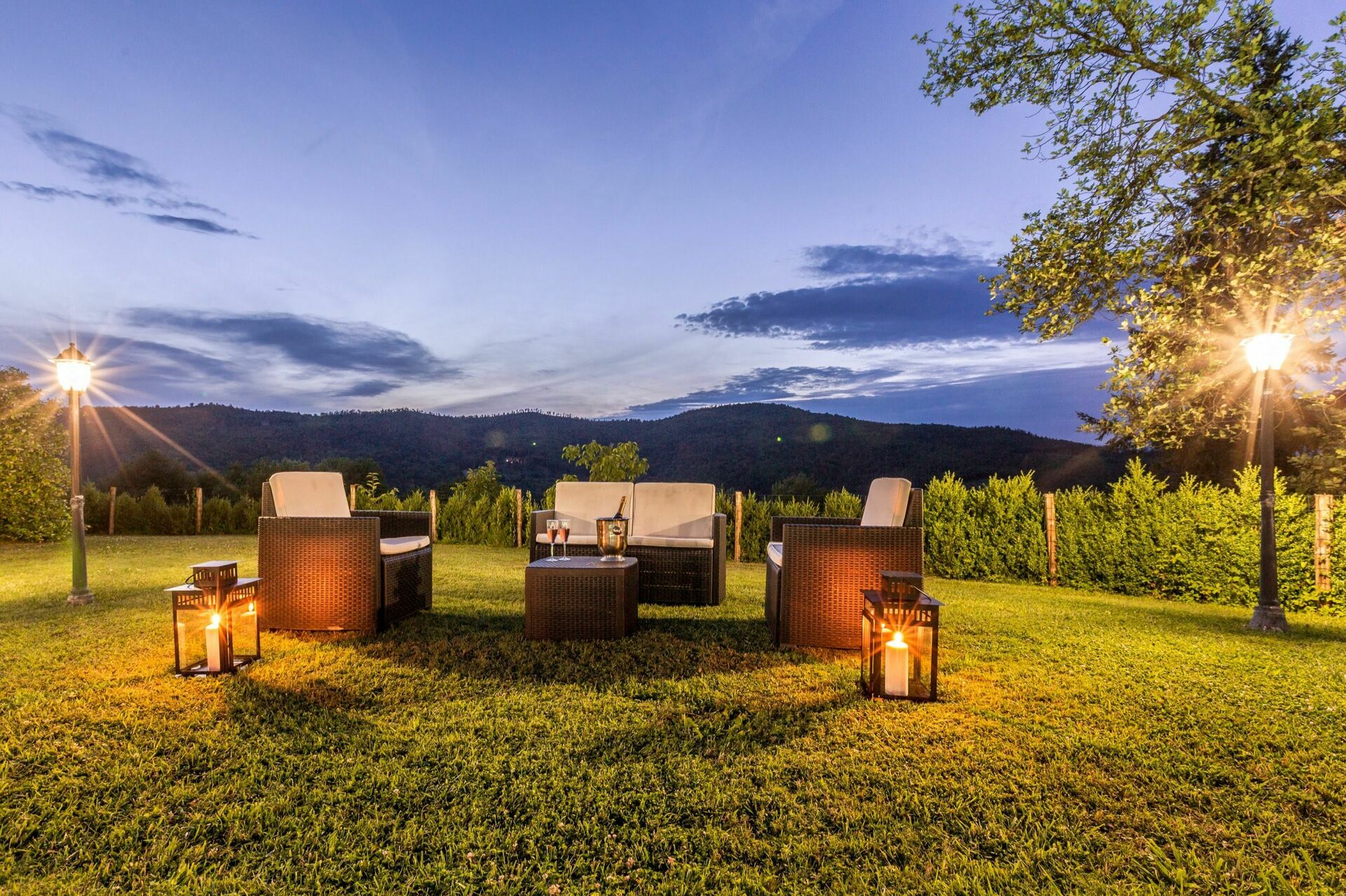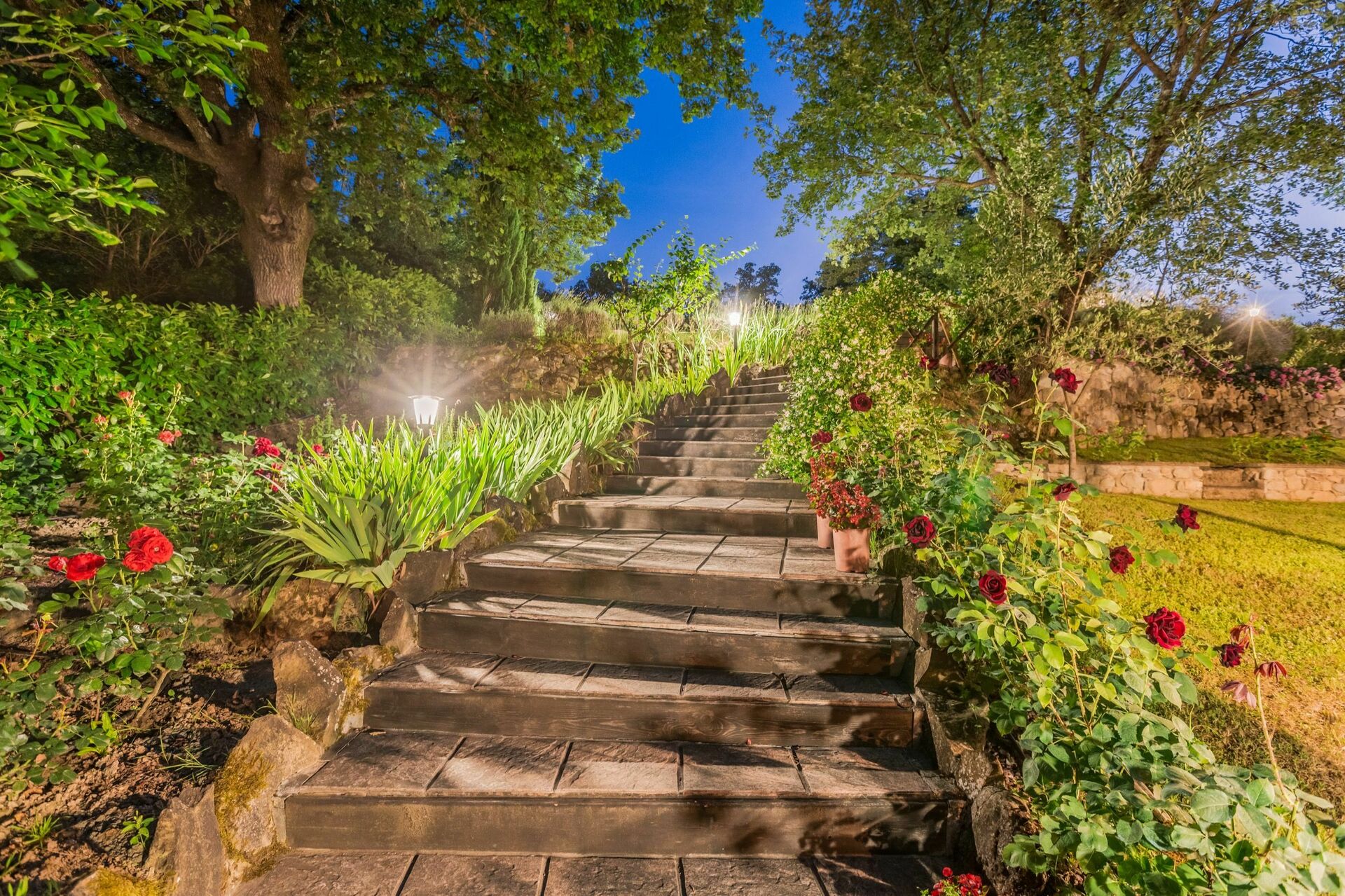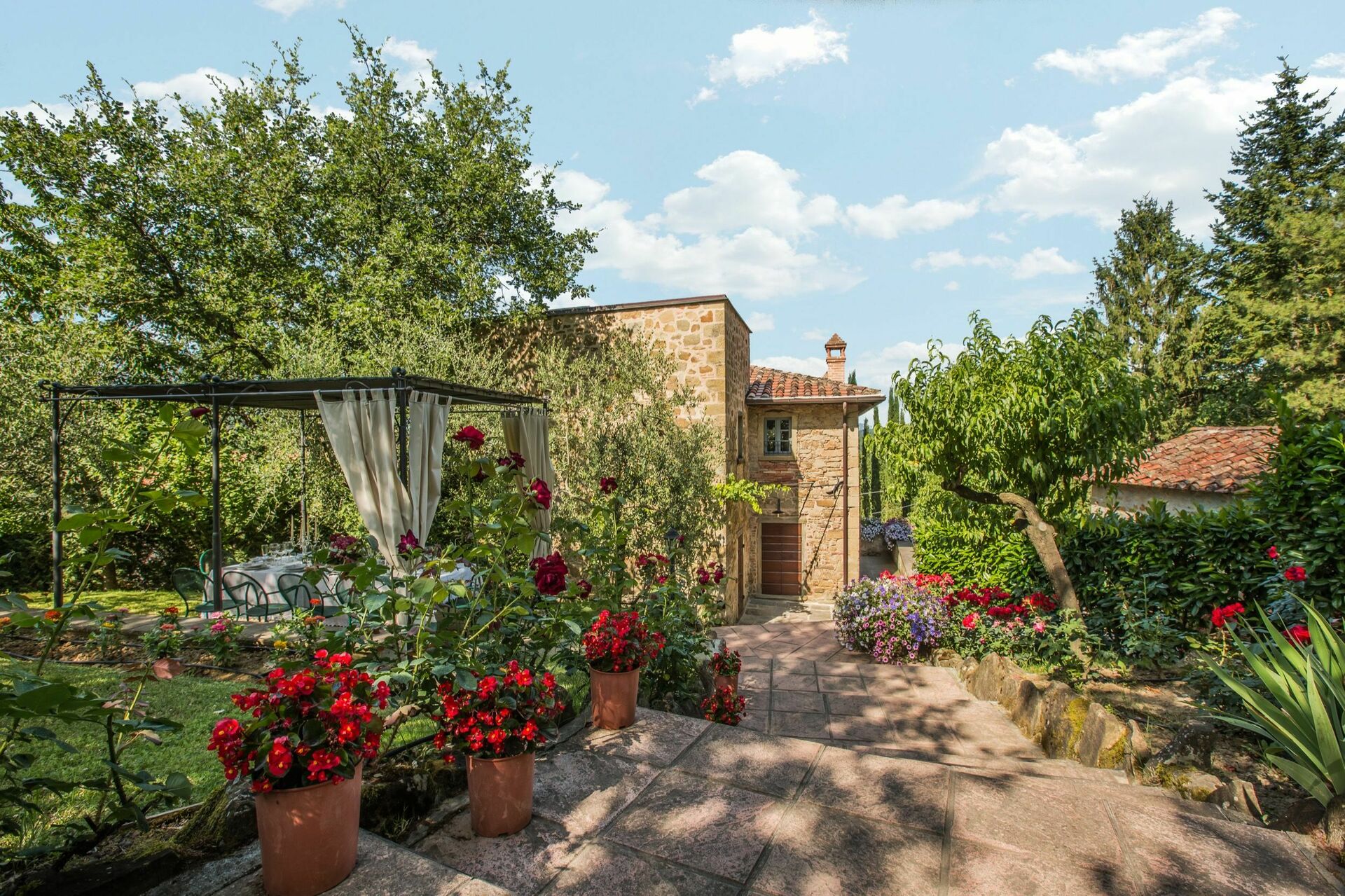 I hagen på et nivå over huset finner man et nytt basseng (12 x 6 m dybde 1,5m, som er åpen fra 1. mai til 1. oktober) og vakre planter som roser, lavendel, jasmin, med sypresser og oliventrær. På bassengområdet finner man også et stor lysthus, bord, stoler og grill. Her kan man nyte utendørs måltider med middelalderbyen Monterchi og de frodige grønne toskanske åsene som et bakteppe.