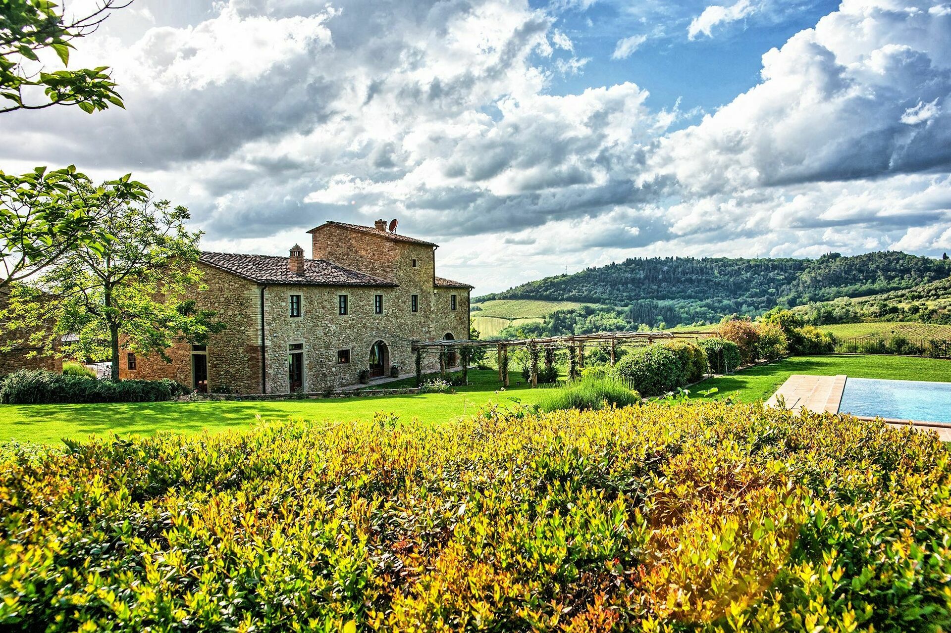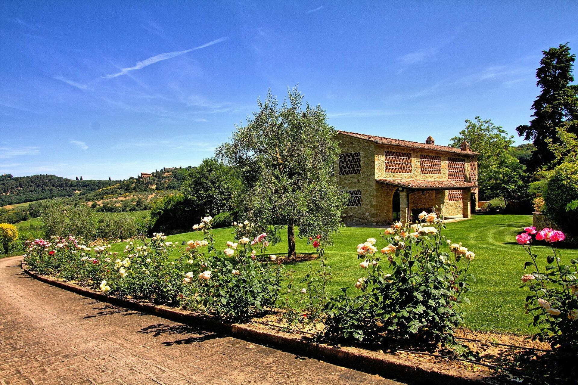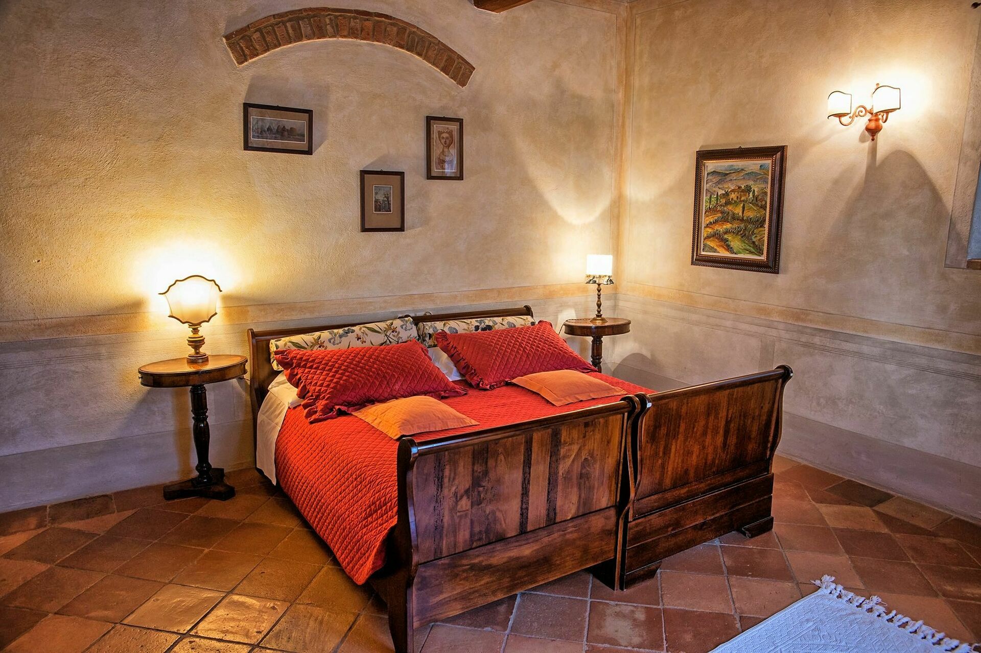 Nydelig privat villa med svømmebasseng på en fremtredende plass i det toscanske landscapet mellom Firenze og Siena. Fra eiendommen har man panoramautsikt til det vakre omkringliggende landskapet. Huset er nylig restaurert på en måte som har bevart den originale arkitekturen. Huset fremstår i dag som en elegant villa med 16 sengeplasser. Det er også mulig å huse 8 gjester til i de tilhørende uthusene på eiendommen slik at man totalt får 24 sengeplasser.