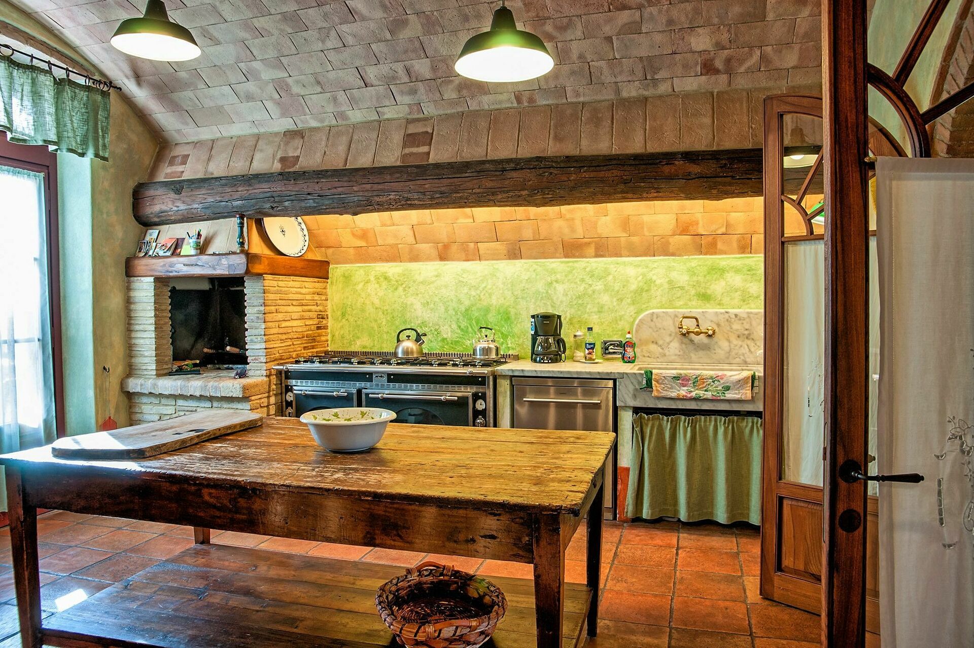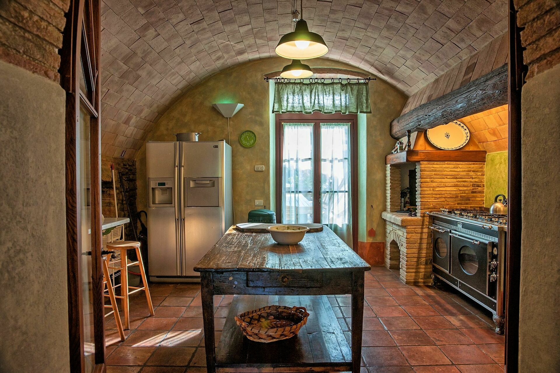 2 trinn lavere: spisestue med peis og dør til utsiden, velutstyrt kjøkken ( fryser, to ovner, oppvaskmaskin, mikrobølgeovn, ismaskin, grill), bod .