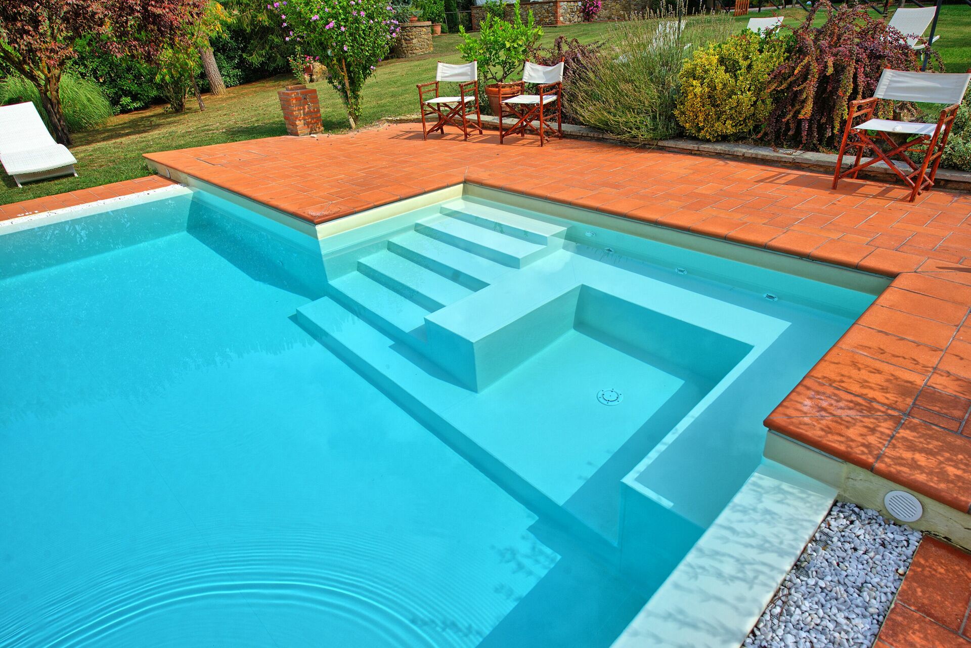 - Privat svømmebasseng reservert for gjestene; 13m x 6m; minste dybde: 1,4m; maksimal dybde: 2,5m
