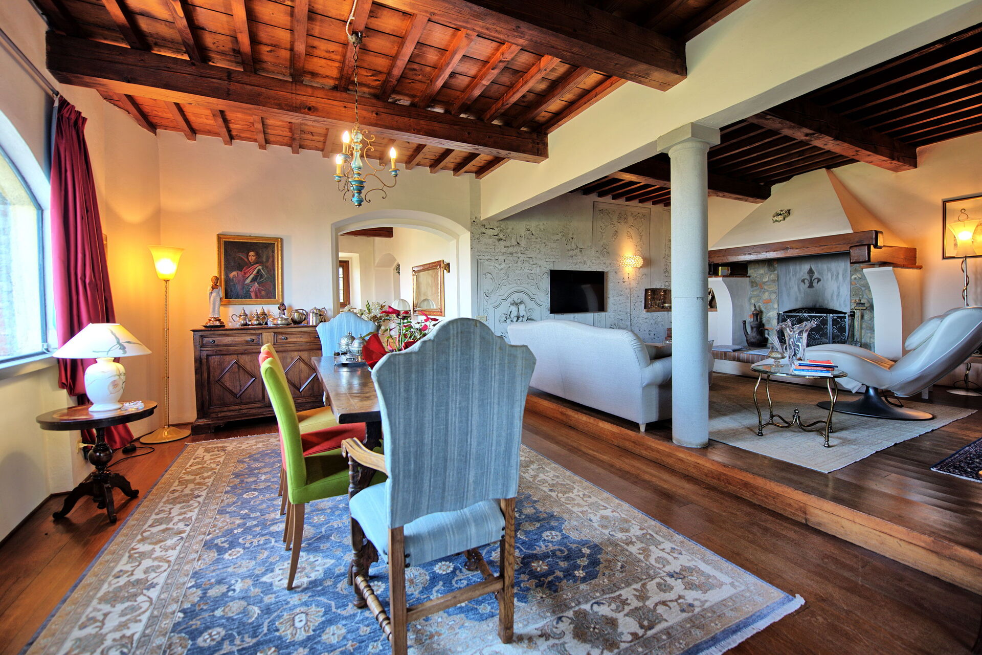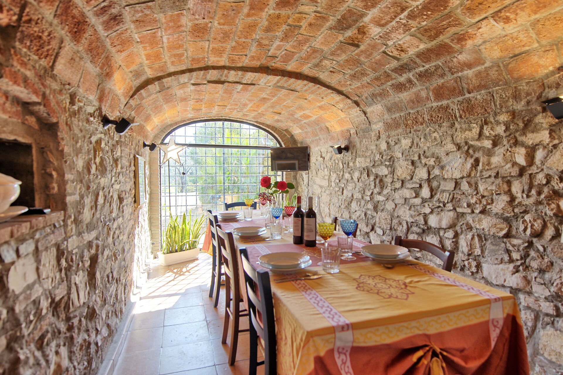 2 trinn ned: sjarmerende oppholdsrom med stort bord og hvelvet steintak, kjøkken (ikke-fungerende peis, kokeplate, stekeovn, kjøleskap, fryser, oppvaskmaskin, mikrobølgeovn, brødrister, espressomaskin) og tilgang til uteplassen med en innglasset veranda (tilgjengelig fra utsiden, men ikke tilkoblet resten av villaen innvendig) møblert med bord og stoler.