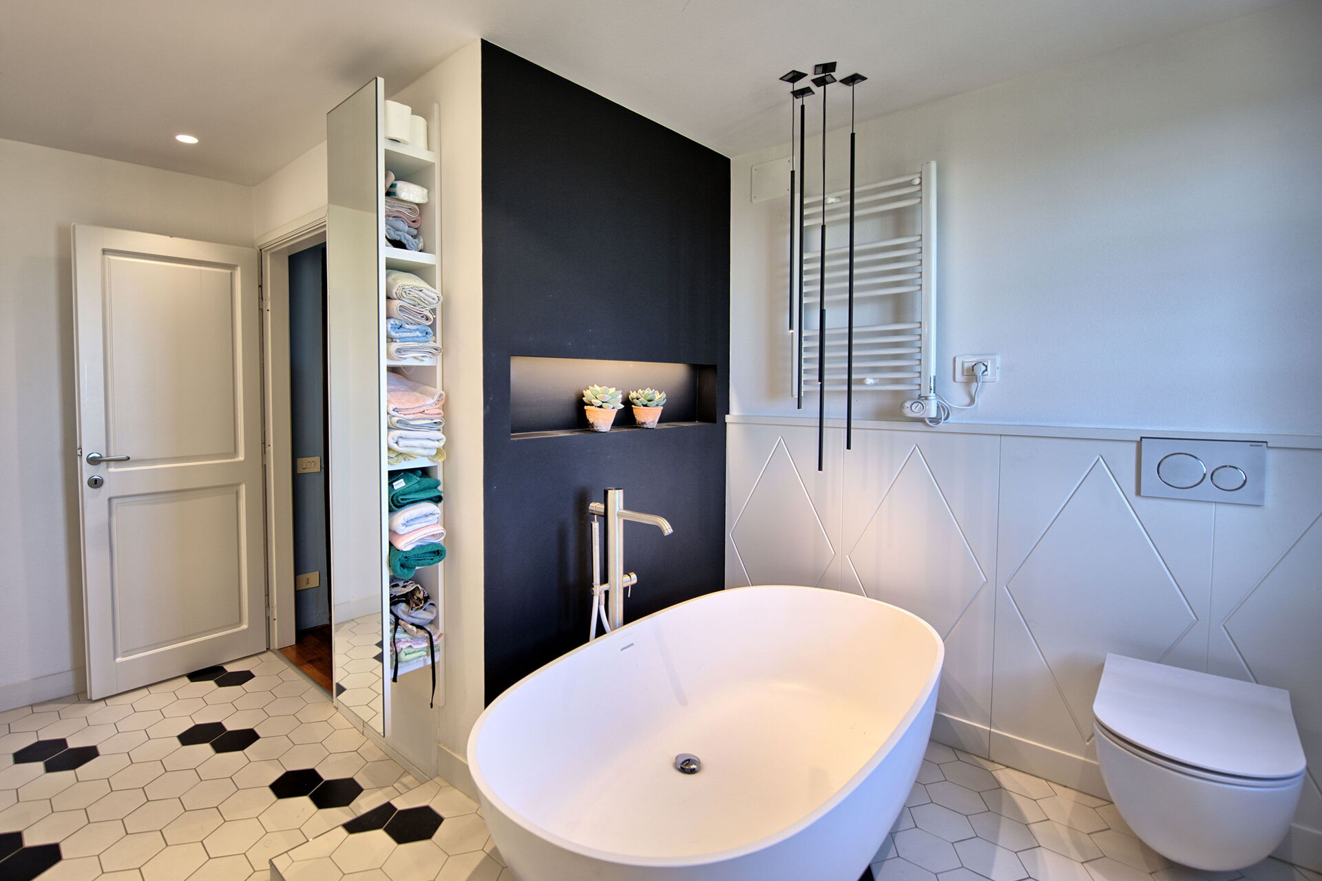 Andre etasje: soverom med dobbeltseng (aircondition), bad med dusj, suite med liten stue (smart-TV), privat bad med badekar, soverom med dobbeltseng (aircondition) på en hems (minimumshøyde: 2,60 meter; maksimumshøyde: 1,8 meter).