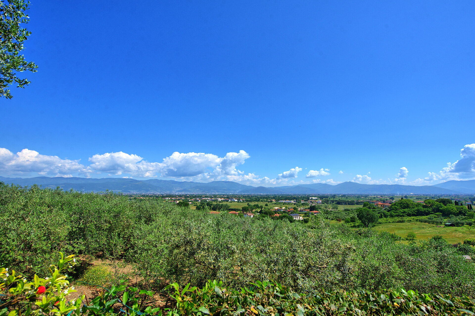 Villaen ligger i et landskap av bølgende åser dekket med oliventrær, noe som er karakteristiske for dette området i Toscana.