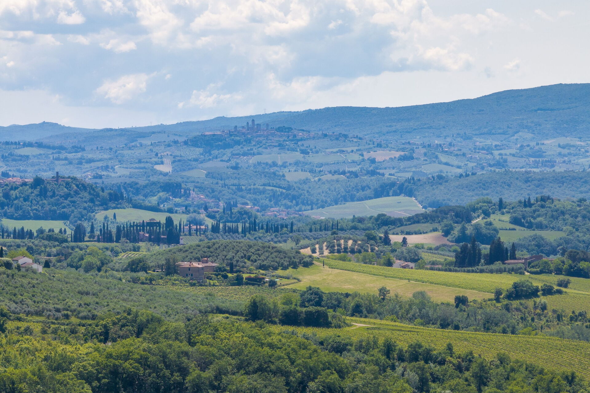 Fra eiendommen har man panoramautsikt til det vakre omkringliggende landskapet og man kan skimte tårnene i den kjente middelalderbyen San Gimignano i det fjerne.