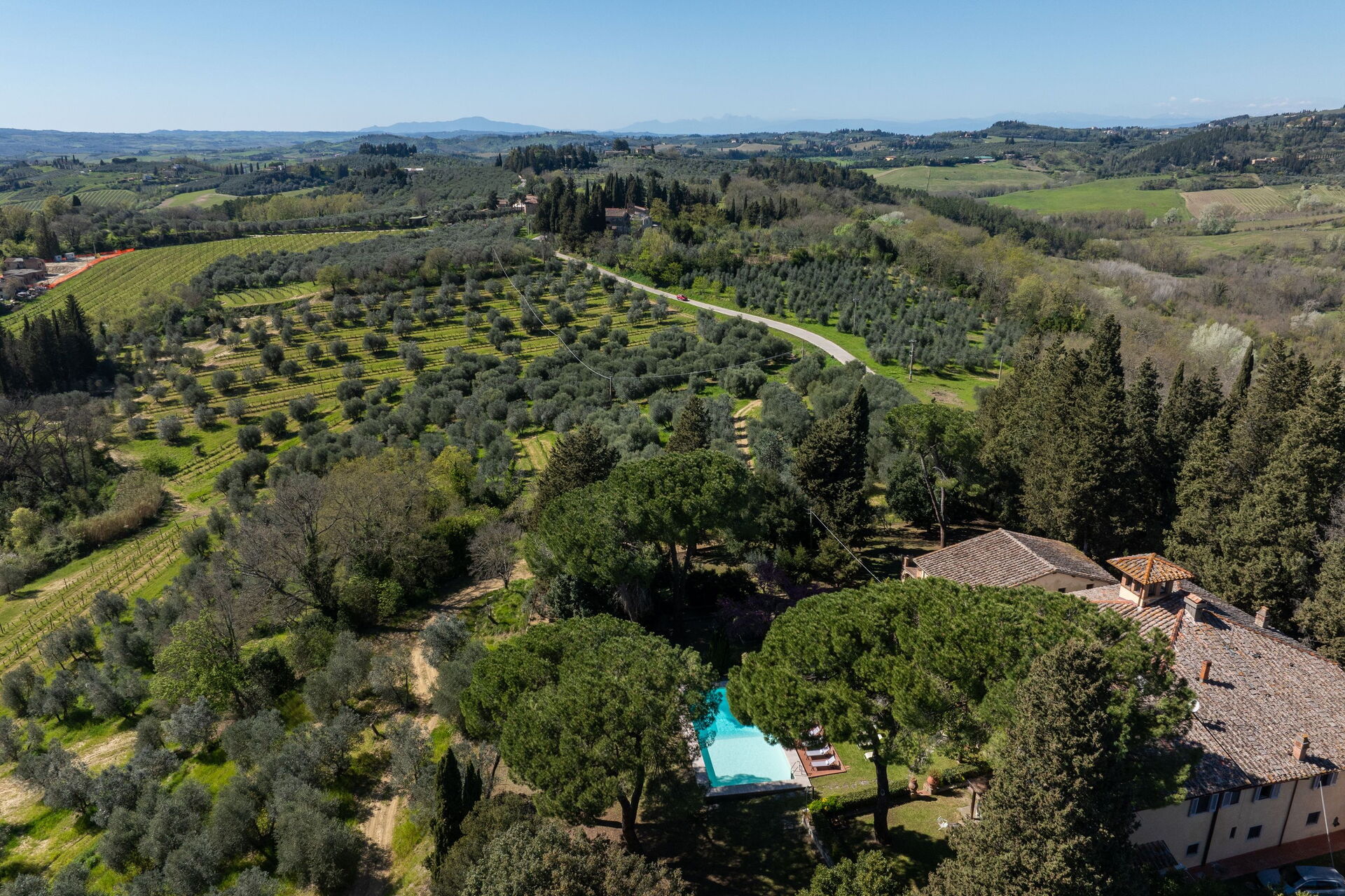 Sciano (dagligvarebutikk og restaurant) 5,5 km; Barberino Val d’Elsa (butikker, tennisbaner) 6 km; Certaldo 6 km; San Gimignano 30 km; Siena og Volterra innen 30 km radius; Firenze 38 km.