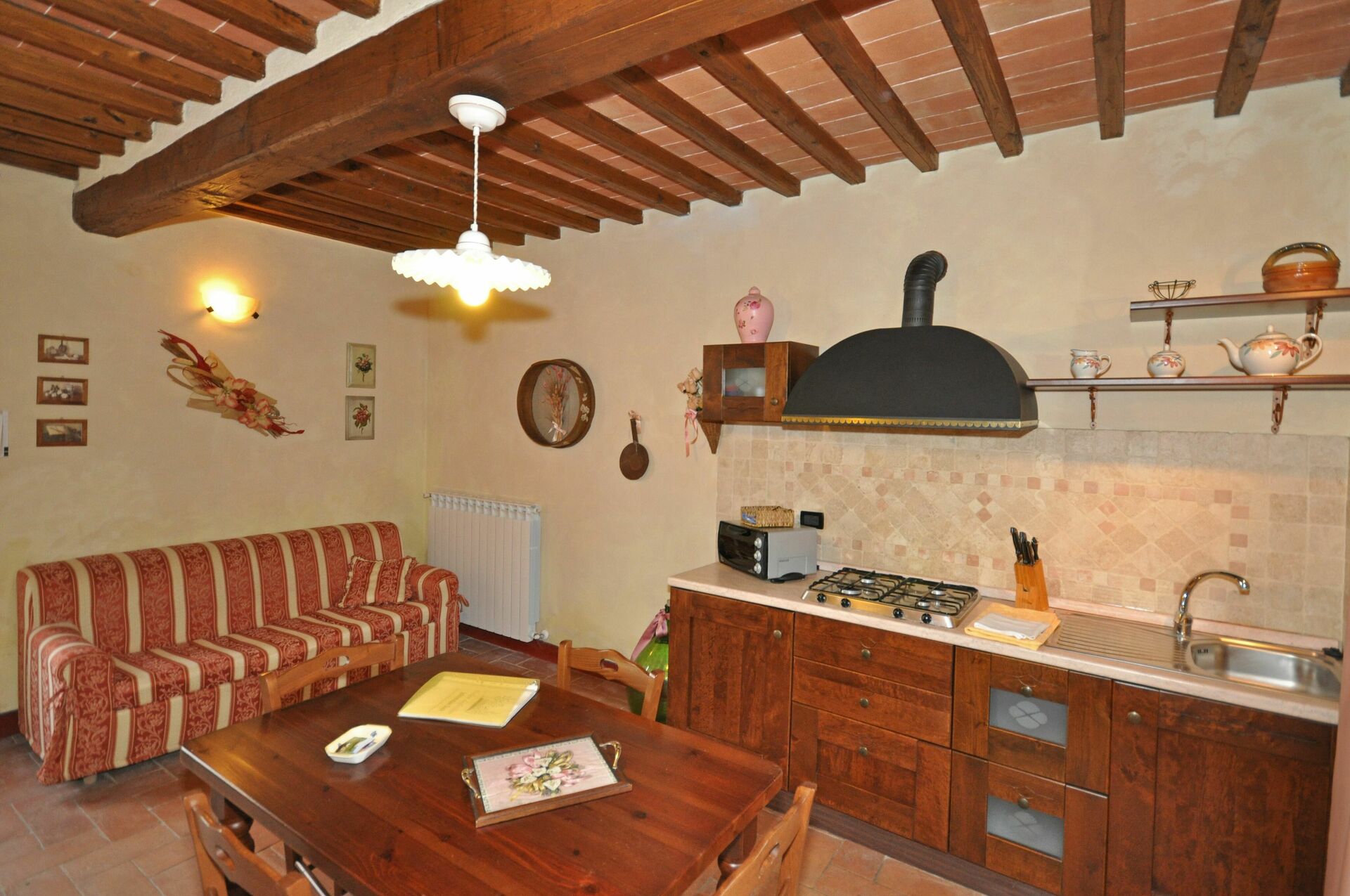 Stue med spiseplass, dobbel sovesofa (€ 30/dag/person) og kjøkkenkrok (brødrister og liten fryseboks)