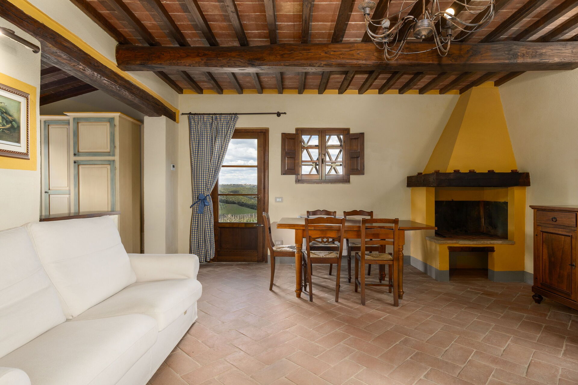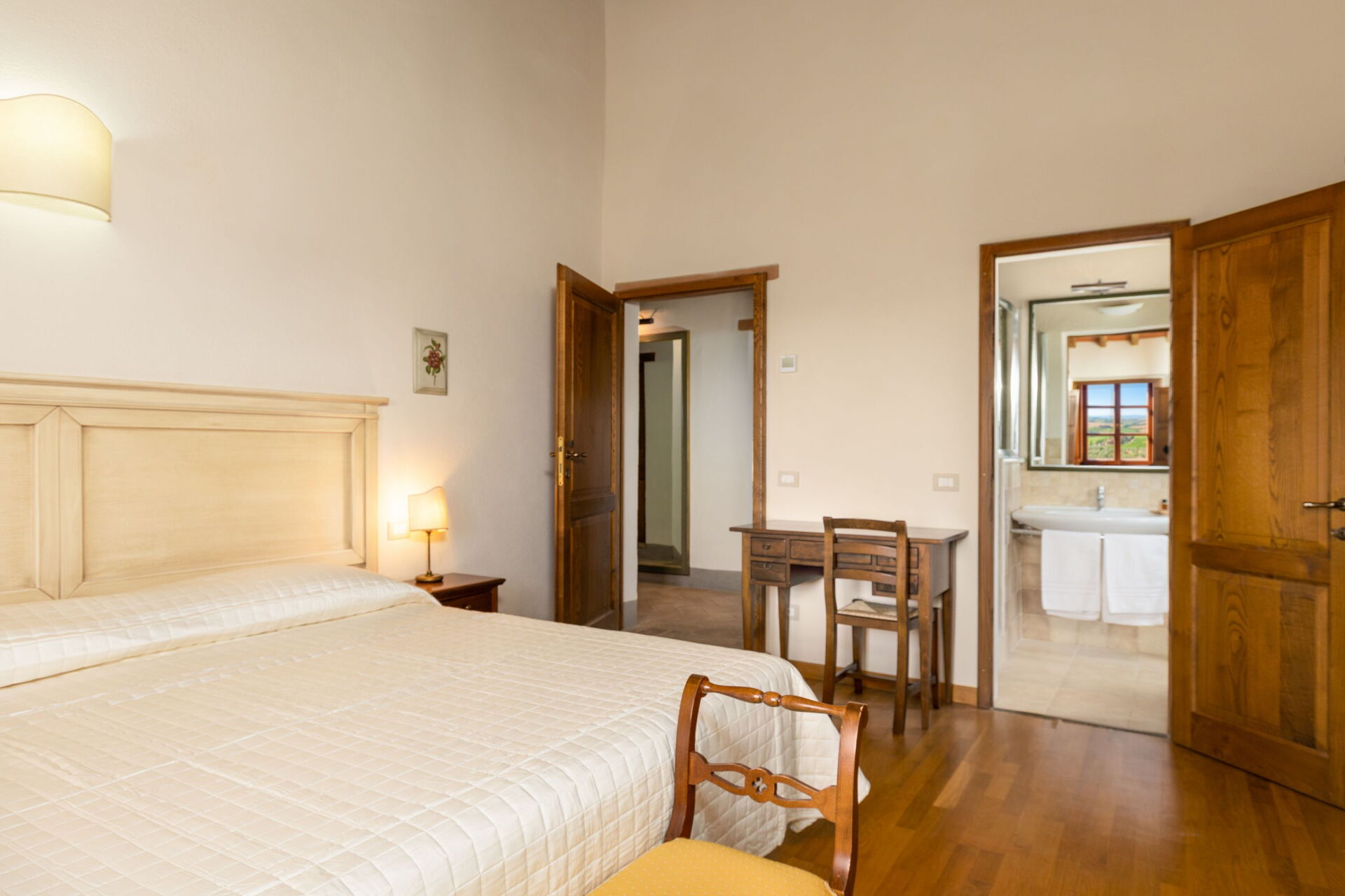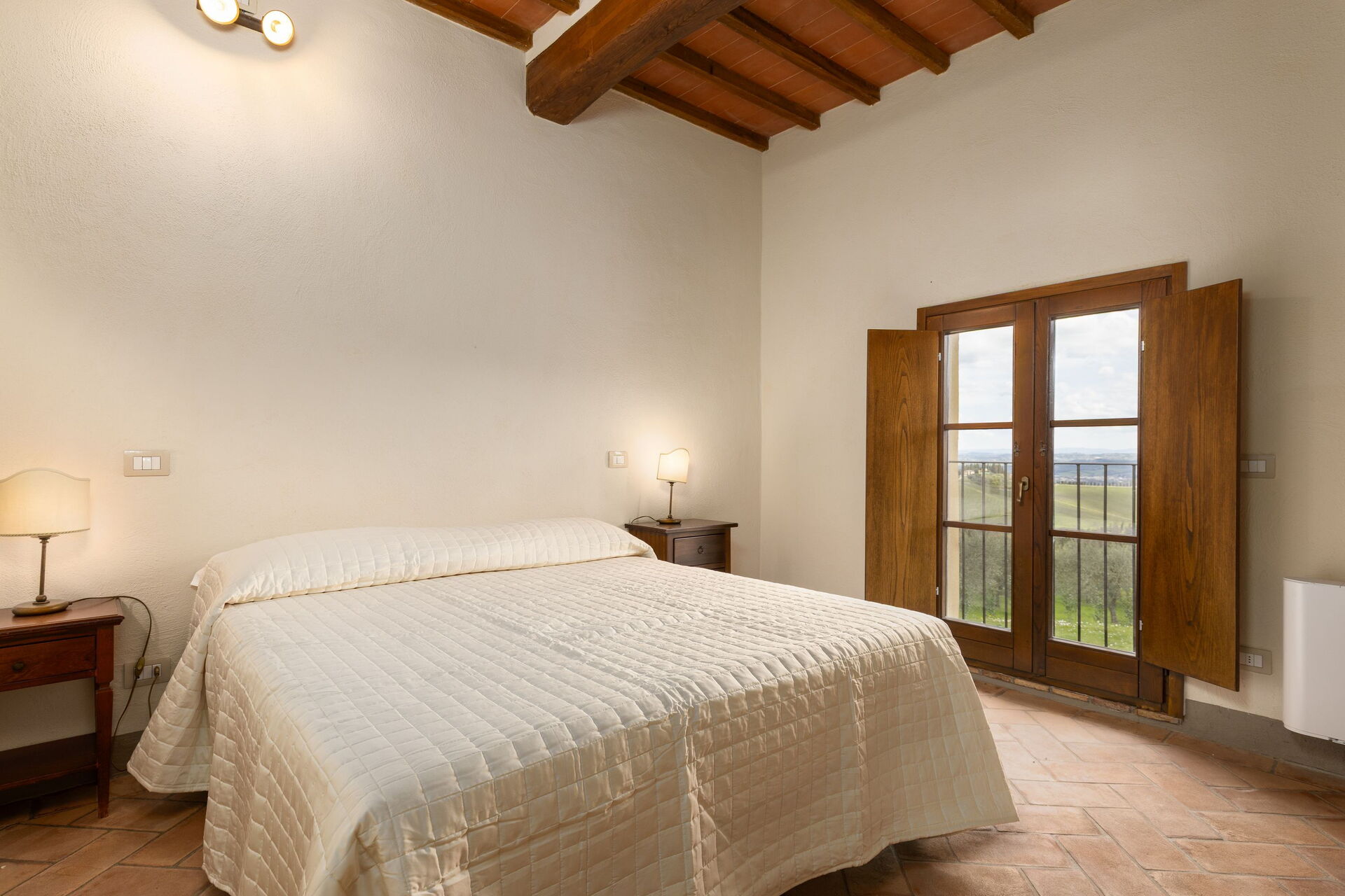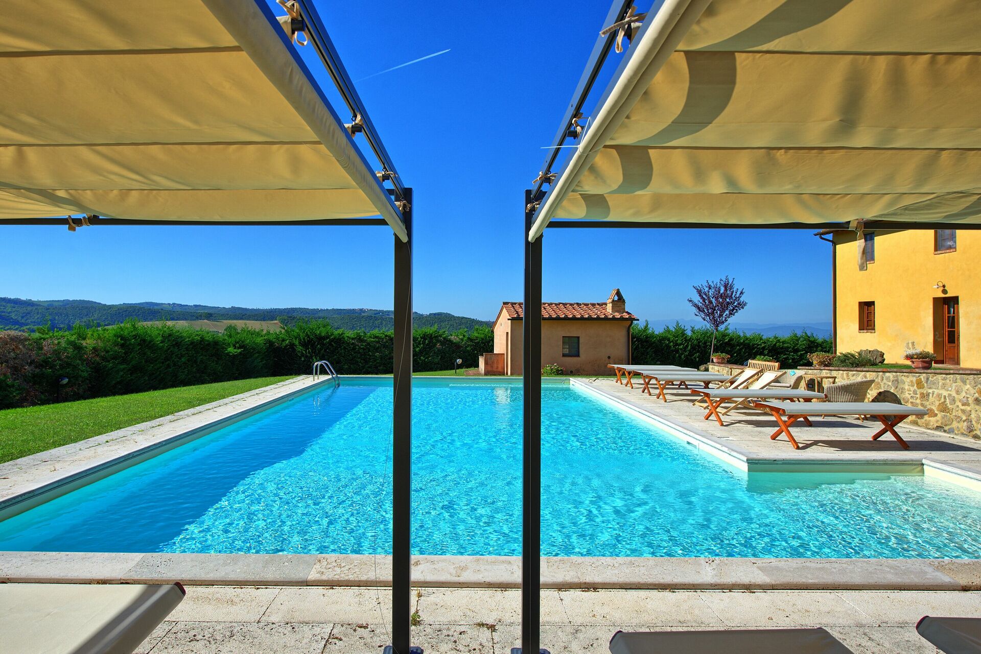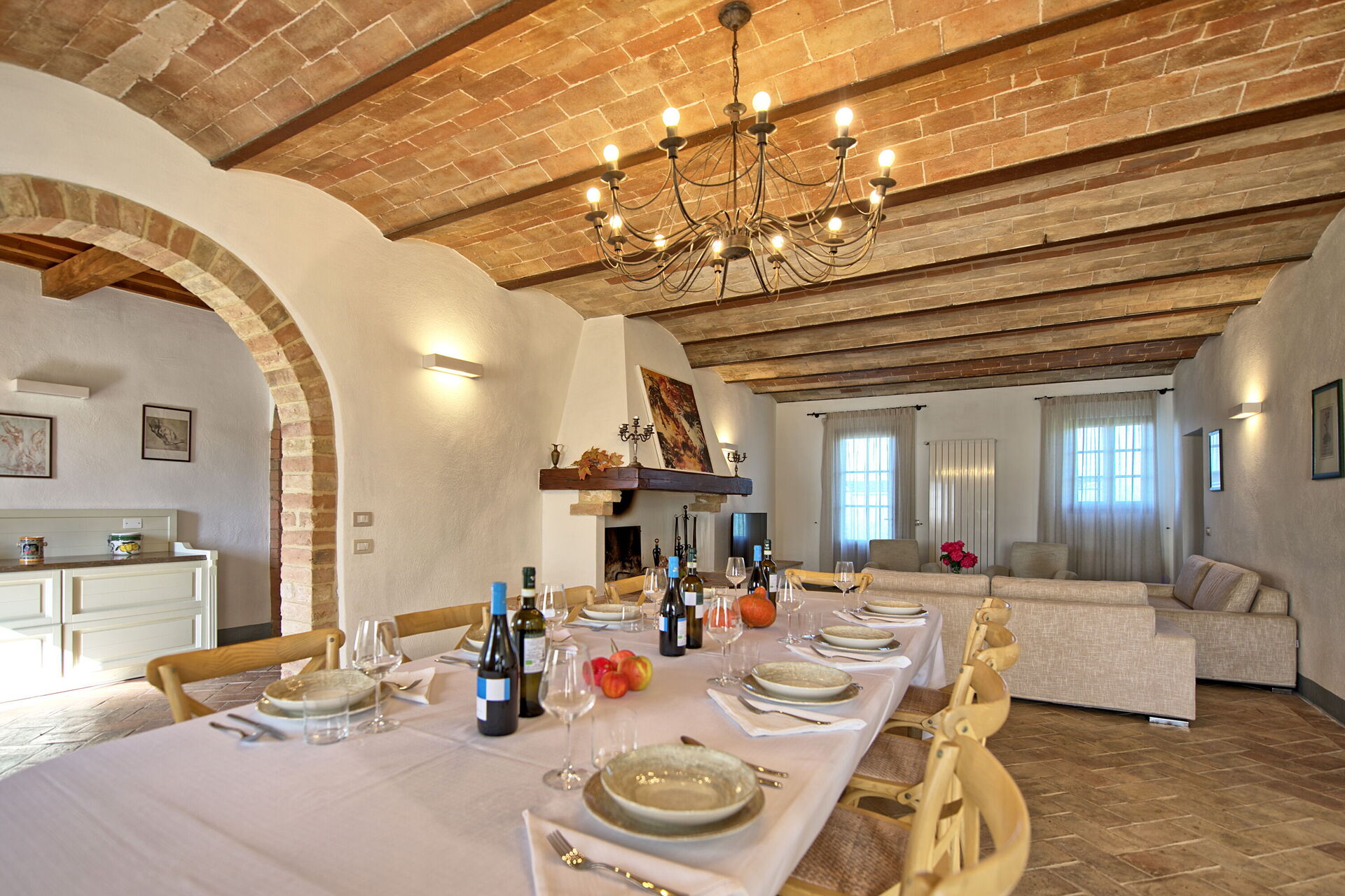 Huset ligger skjermet til på åsen i nærheten den sjarmerende middelalderbyen San Gimignano som er kjent for sine mange tårn. FRa villaen har man panoramautsikt over det omkringliggende landskapet, med olivenlunder, vingårder og bølgende åser. Eiendommen er fullstendig restaurert og har beholdt sitt opprinnelige arkitektoniske særpreg men er også utstyrt med alle moderne bekvemmeligheter.
