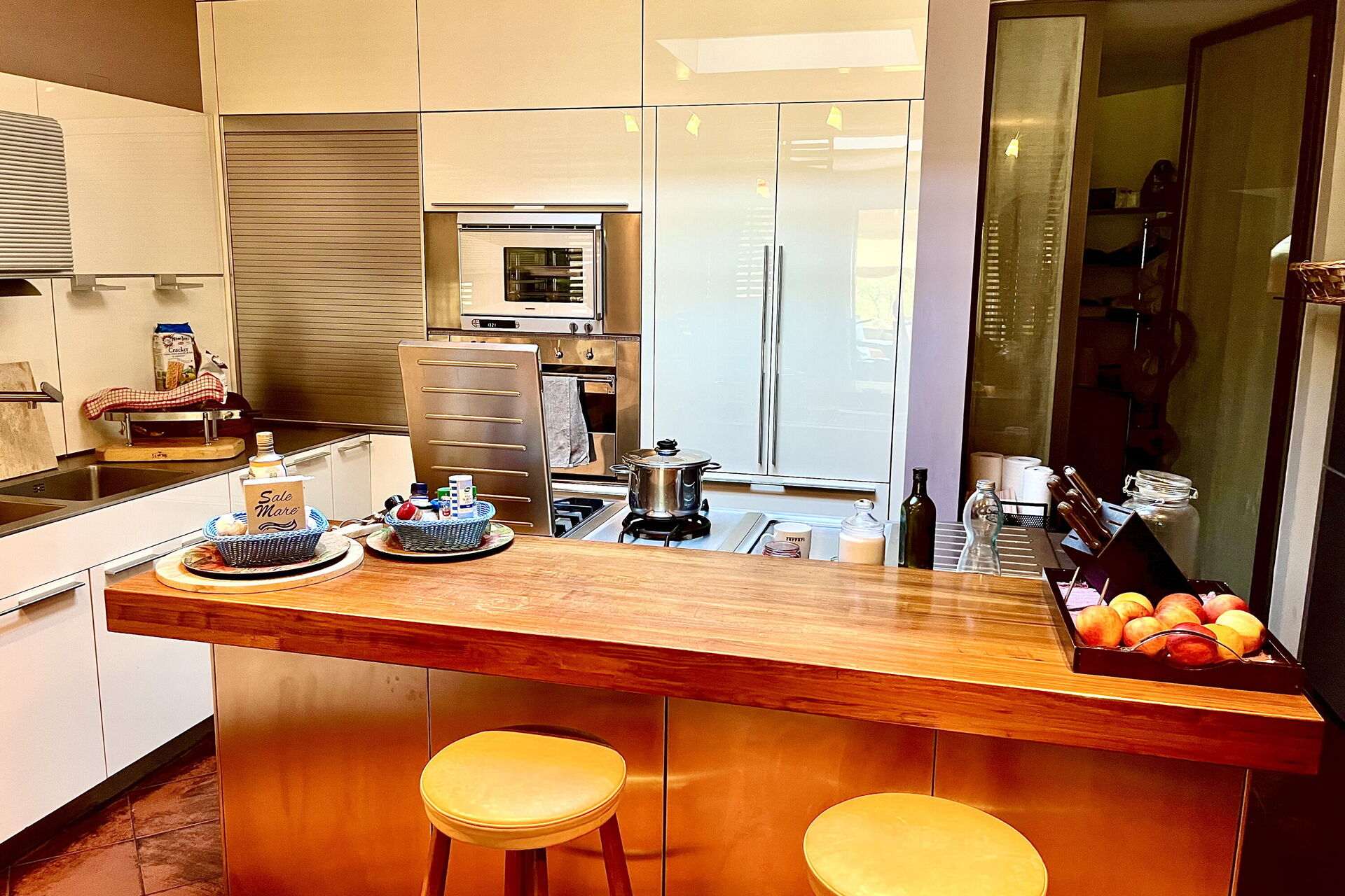 Stor stue (Smart-TV) med utgang til spisestue med panoramautsikt (aircondition), piano og panoramavinduer mot utsiden, velutstyrt kjøkken, spiskammer med vaskemaskin,1 dobbeltrom (aircondition) og eget bad med dusj