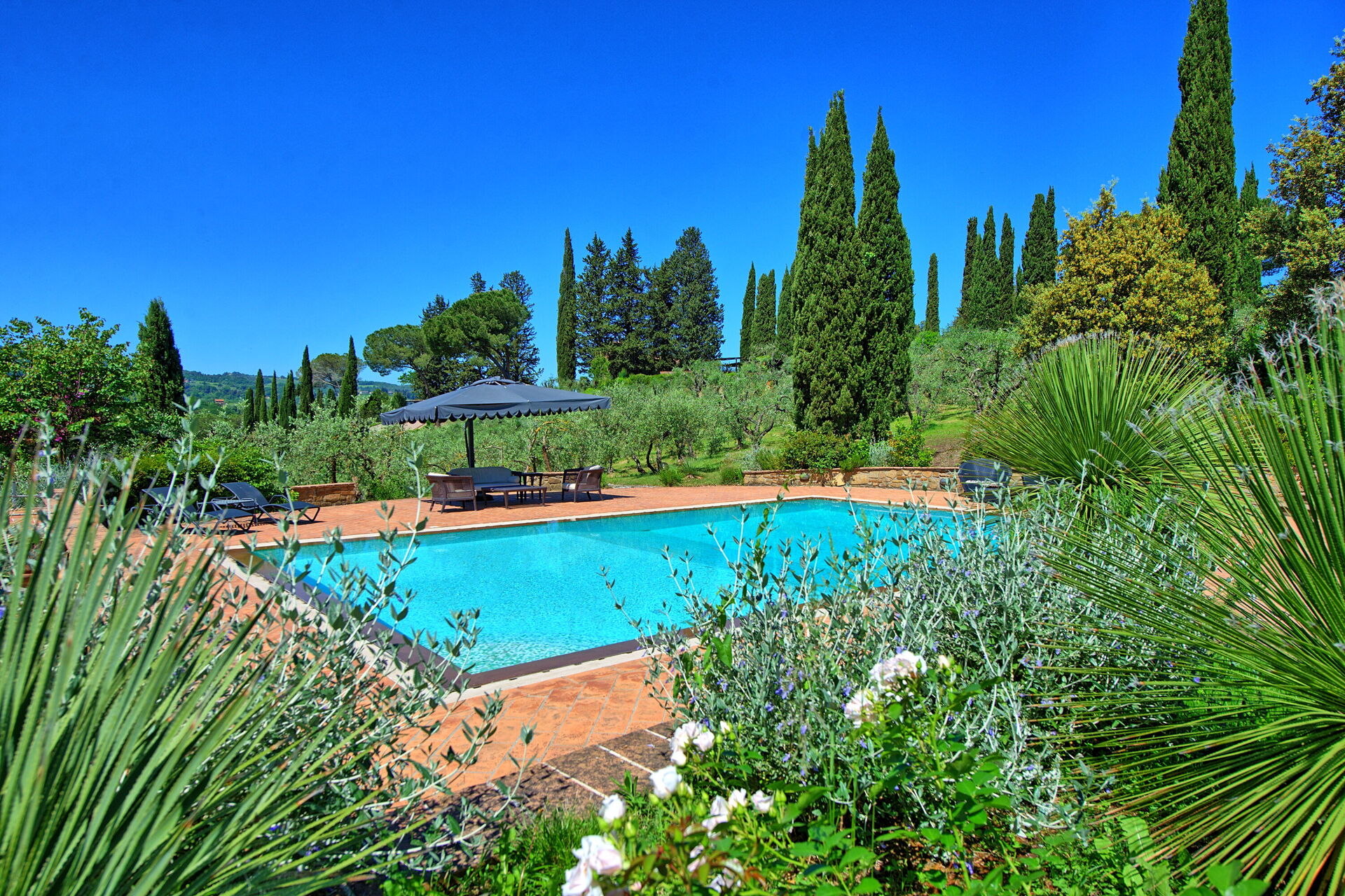 Svømmebassenget med bassengdekk ligger på en stor plen med utsikt over Toscanas åser og middelaldertårnene i den historiske byen San Gimignano.