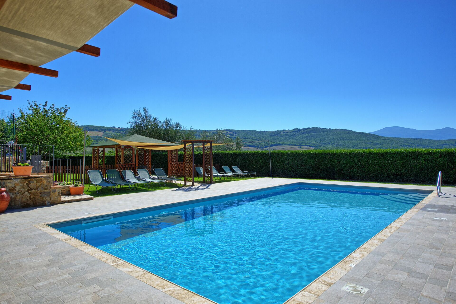 - saltvannsbasseng er 12 x 6 meter (dybde fra 1,05 til 2,4 m); parasoller og flere solsenger for å slappe av i