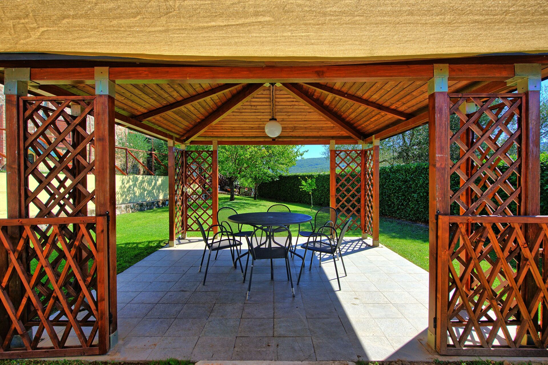 Etter å ha kommet inn gjennom inngangsporten, er det en stor gårdsplass rikelig utstyrt med bord og stoler til gjestenes disposisjon, samt en mursteingrill. På andre siden av gårdsplassen er det et nydelig område med et stort rundt steinbord og matchende benker skjermet fra solen av en pergola. Her er det også en annen utgang fra eiendommen, ned en steintrapp og gjennom en liten jernport.