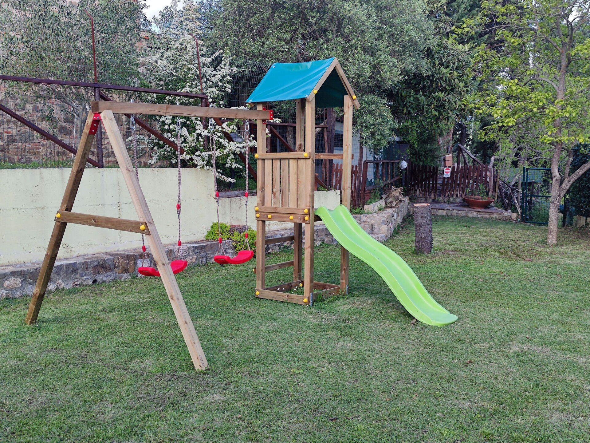 En liten port stenger veien slik at små barn ikke når det inngjerdede svømmebassenget uten tillatelse. Noen frukttrær, blomster og busker lyser stedet og det er også et lysthus med bord og stoler.