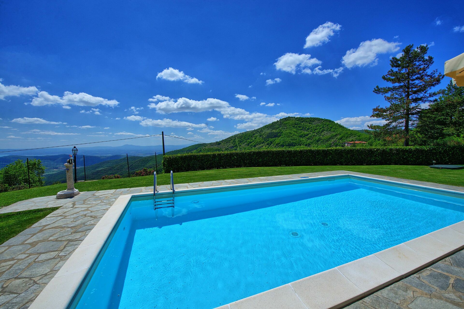 This property is excellent. It is situated with outstanding views of the valley towards Lago Trasimeno. The location is very peaceful with little passing traffic. The property and swimming pool is totally private. The building is very new and is very well equipped. It was spotlessly clean and very comfortable. Air conditioning is included in all rooms which is a bonus. The grounds and swimming pool are immaculately maintained. All outside equipment is of a high quality.
